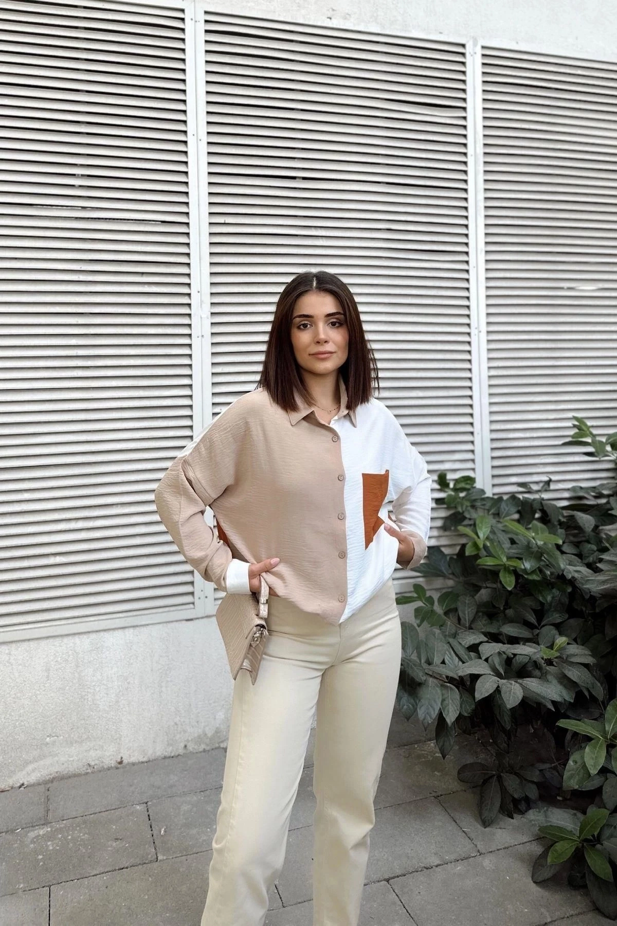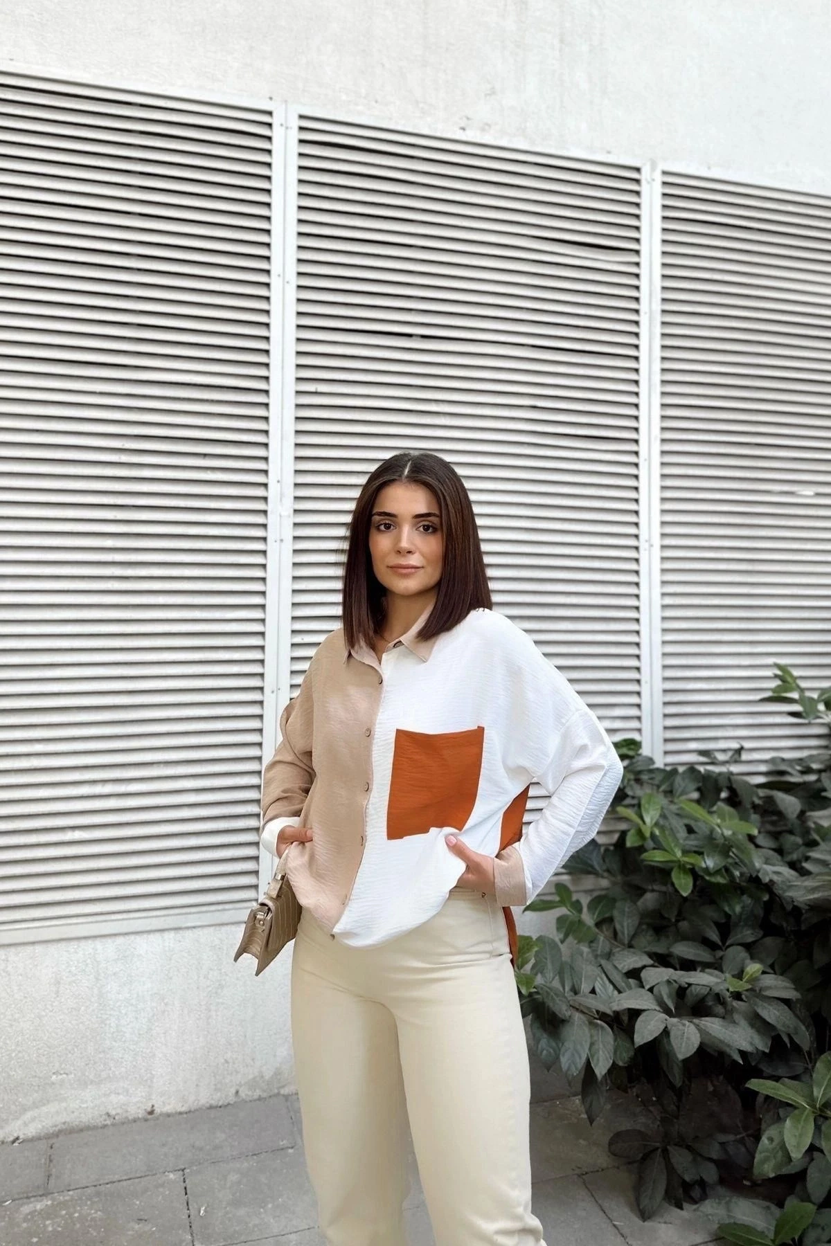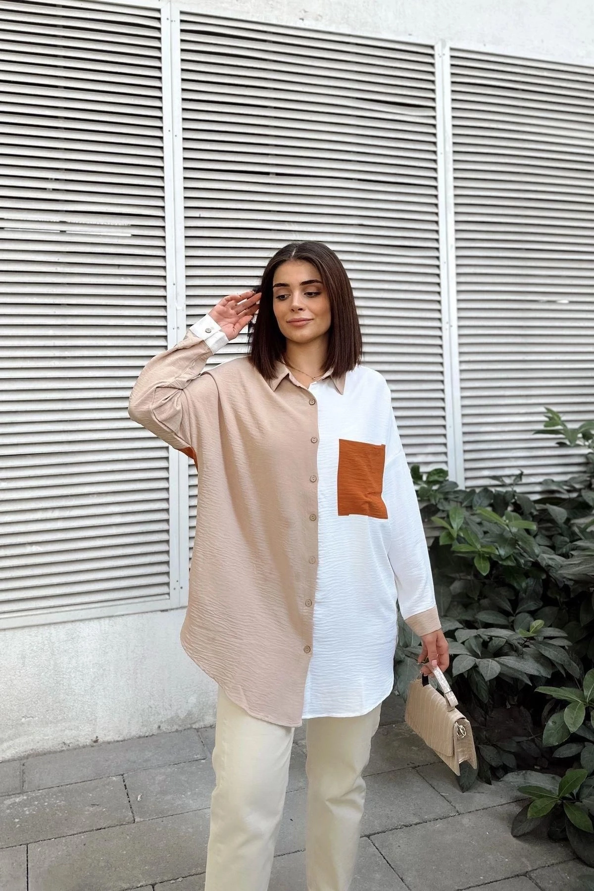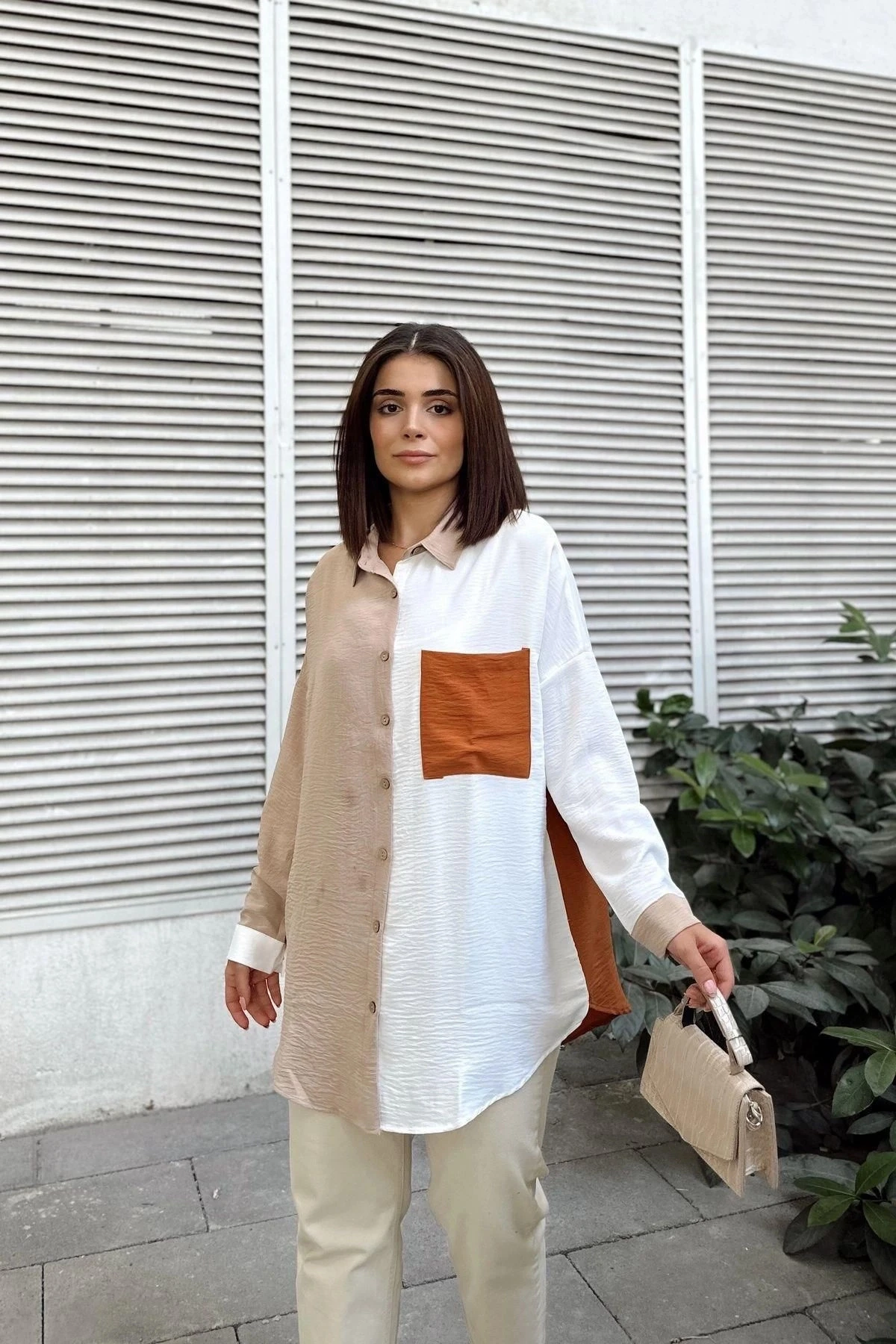 Kadın Bej & Kiremit Uzun Kol Detaylı Renk Bloklu Oversize Gömlek Cepli Uzun Tunik Gömlek