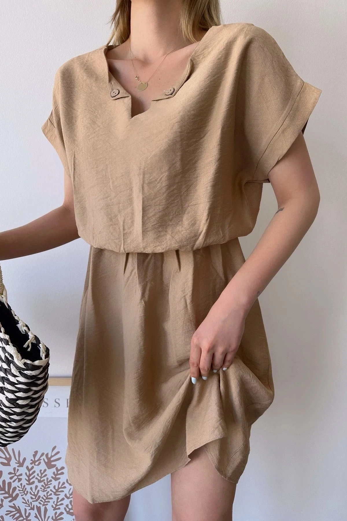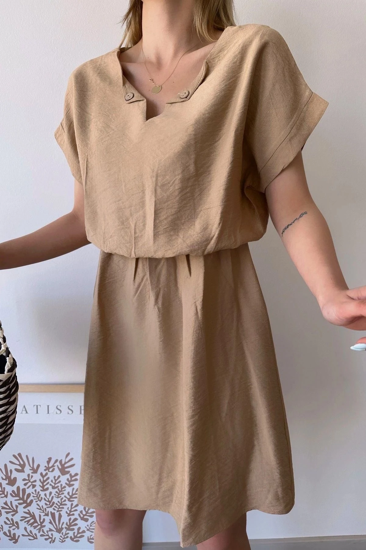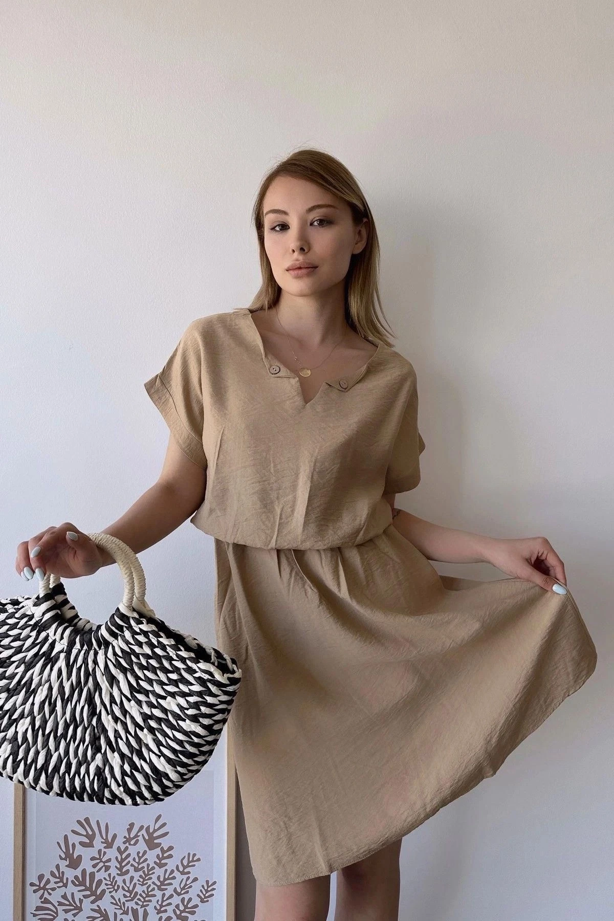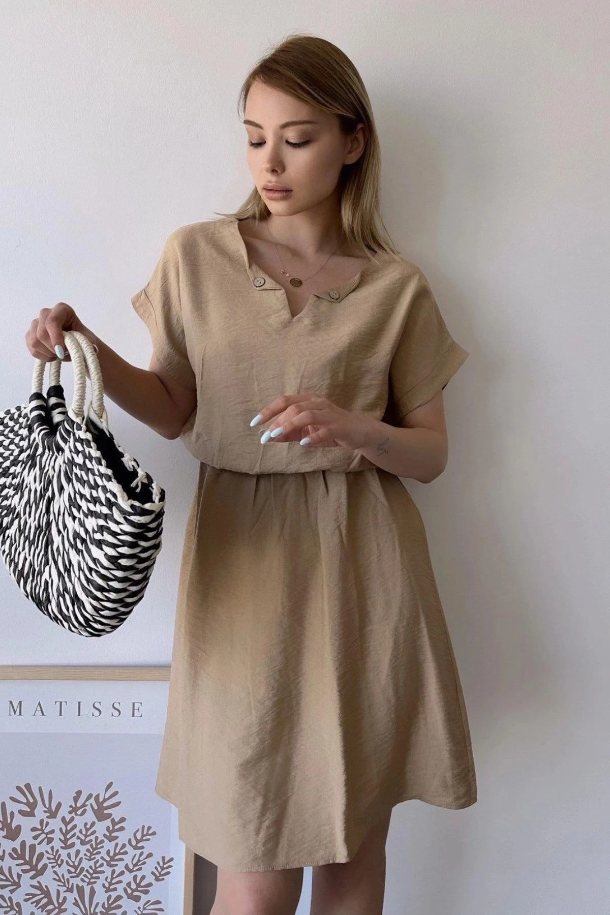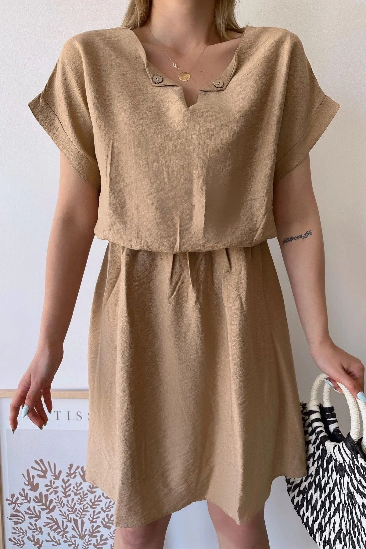 Bu kadın bej kısa kollu midi elbise, şıklığı ve rahatlığı bir araya getiriyor.; Elbisenin kumaşı, %60 pamuk ve %40 polyester karışımından oluşur.; Bu kombinasyon, elbisenin yumuşak ve nefes alabilen bir dokuya sahip olmasını sağlarken aynı zamanda dayanıklılığını artırır.; Kalp yaka tasarımı, elbiseye sevimli ve zarif bir dokunuş katıyor.; Bu yaka stili, boyun bölgesini çerçeveleyerek feminen bir görünüm sağlıyor.; Dokulu deseni ise elbiseye görsel bir çekicilik ve ilgi katıyor.; Bej rengi, sıcak ve yumuşak tonlarıyla zarif bir görünüm sağlıyor ve herhangi bir mevsimde rahatlıkla kullanılabilir.; Bu elbisenin bele oturan kalıp ve kesimi, vücudunuzun doğal hatlarını vurgularken aynı zamanda rahat bir oturuş sağlıyor.; Elbisenin lastikli bel detayı, belinizi sıkıca kavrar ve şekillendirir.; Bu da elbisenin size özgü bir uyum sağlamasını sağlar.; Aerobin kumaşının hafifliği ve karışım içeriği ile bu elbise, gün boyu rahatlık ve hareket özgürlüğü sunar.; Midi boyu, hem şık hem de kullanışlıdır.; Elbisenin zarif tasarımı, herhangi bir özel etkinlikten günlük kullanıma kadar birçok farklı durumda şık bir tercih olmasını sağlar.; Bu bej kısa kollu kalp yaka midi elbise, hem şıklığı hem de rahatlığı bir arada arayan kadınlar için ideal bir seçenektir.; Yüksek kaliteli kumaşı ve çekici tasarımıyla bu elbise, gardırobunuzun vazgeçilmez bir parçası haline gelecek.