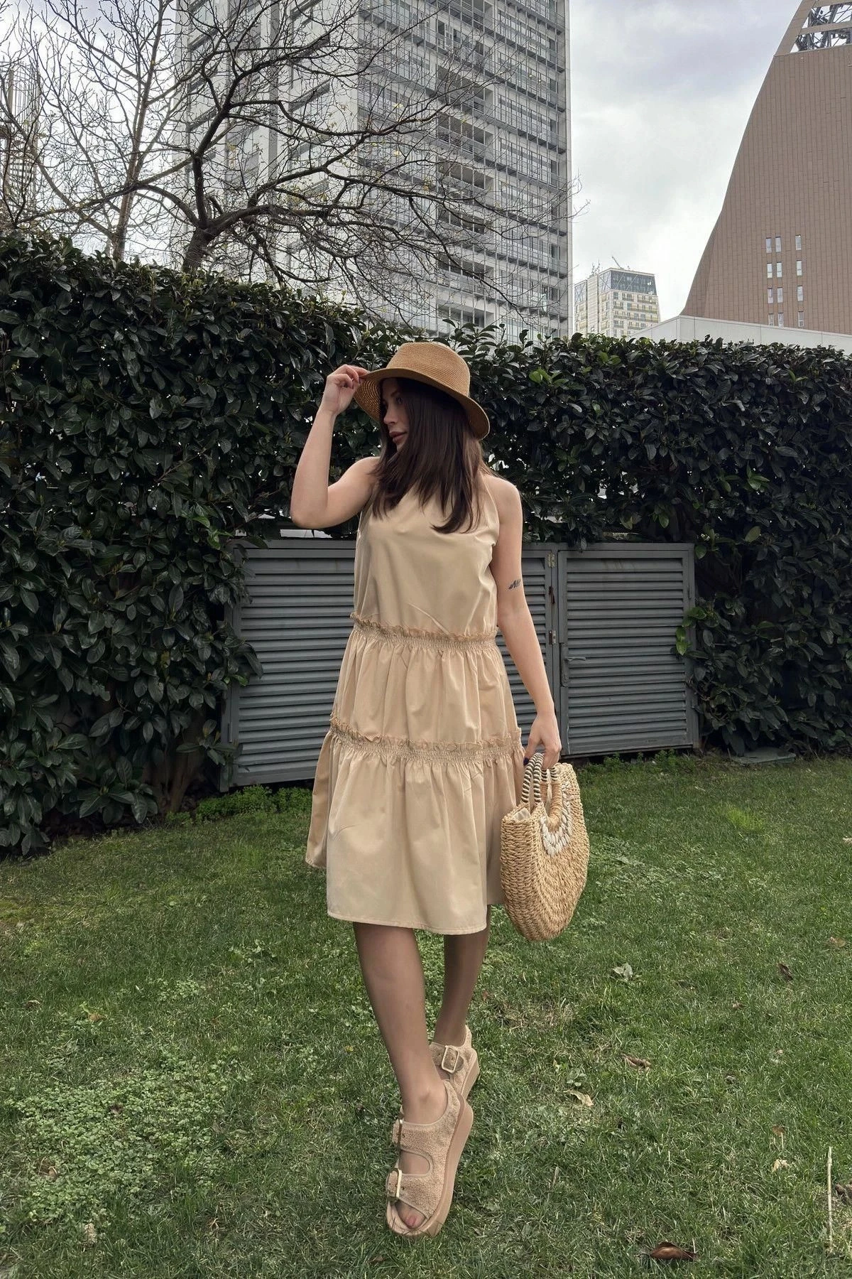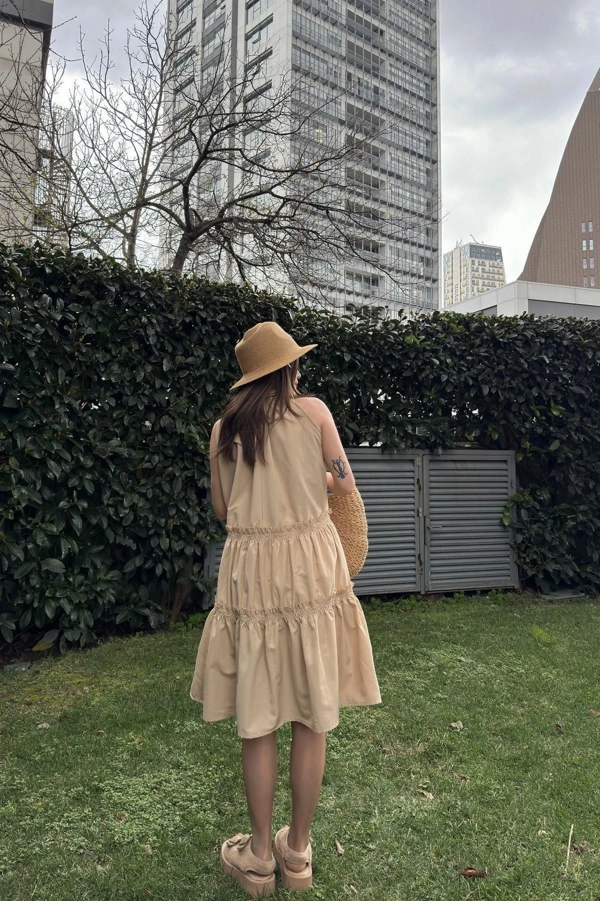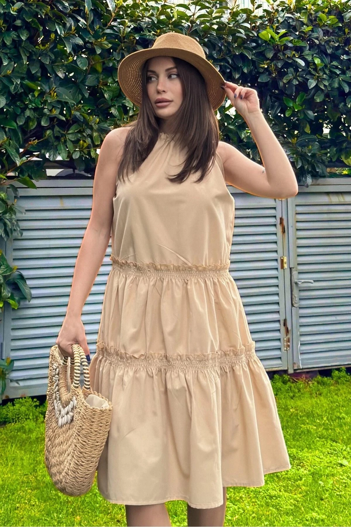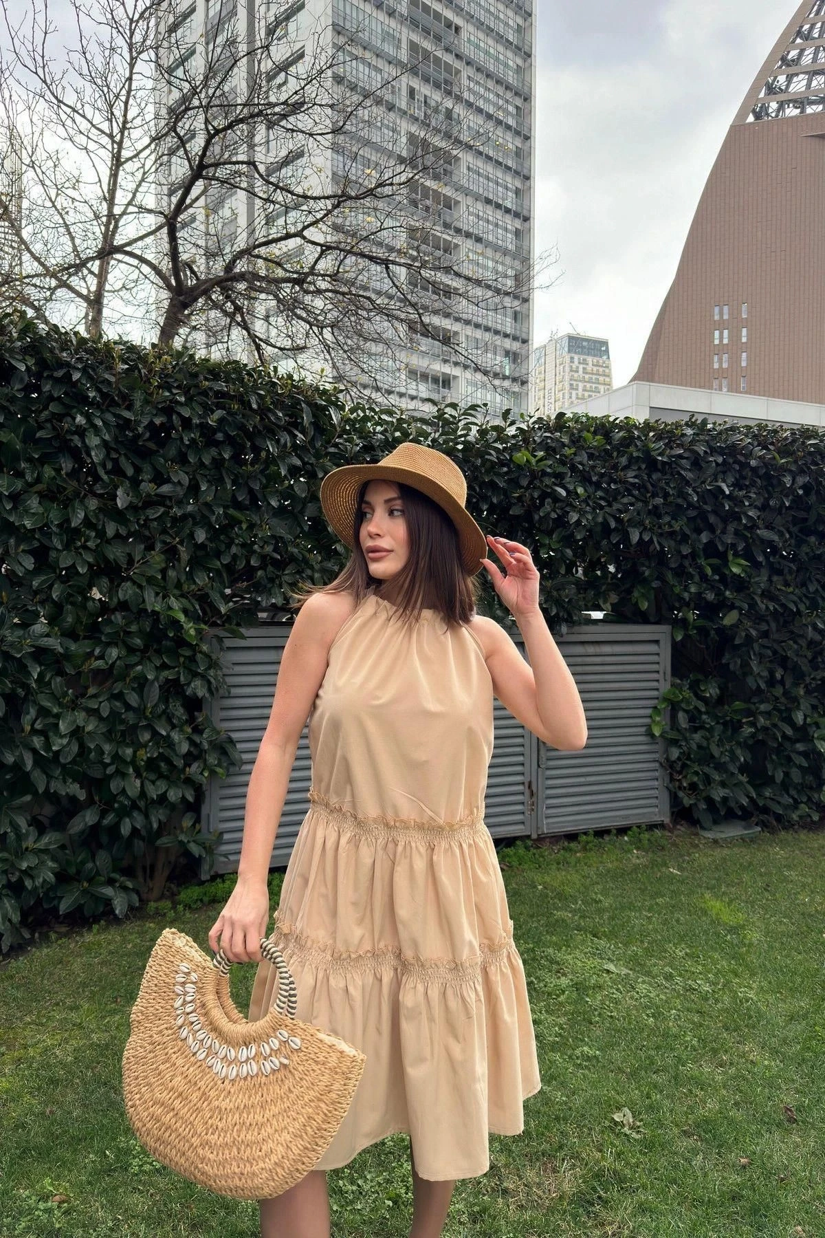 Kadın Bej Kolsuz, Halter Yaka, Düz Renk Desen, A-Line Kalıp/Kesim, Fırfırlı Midi Elbise