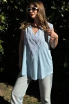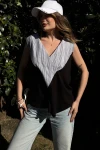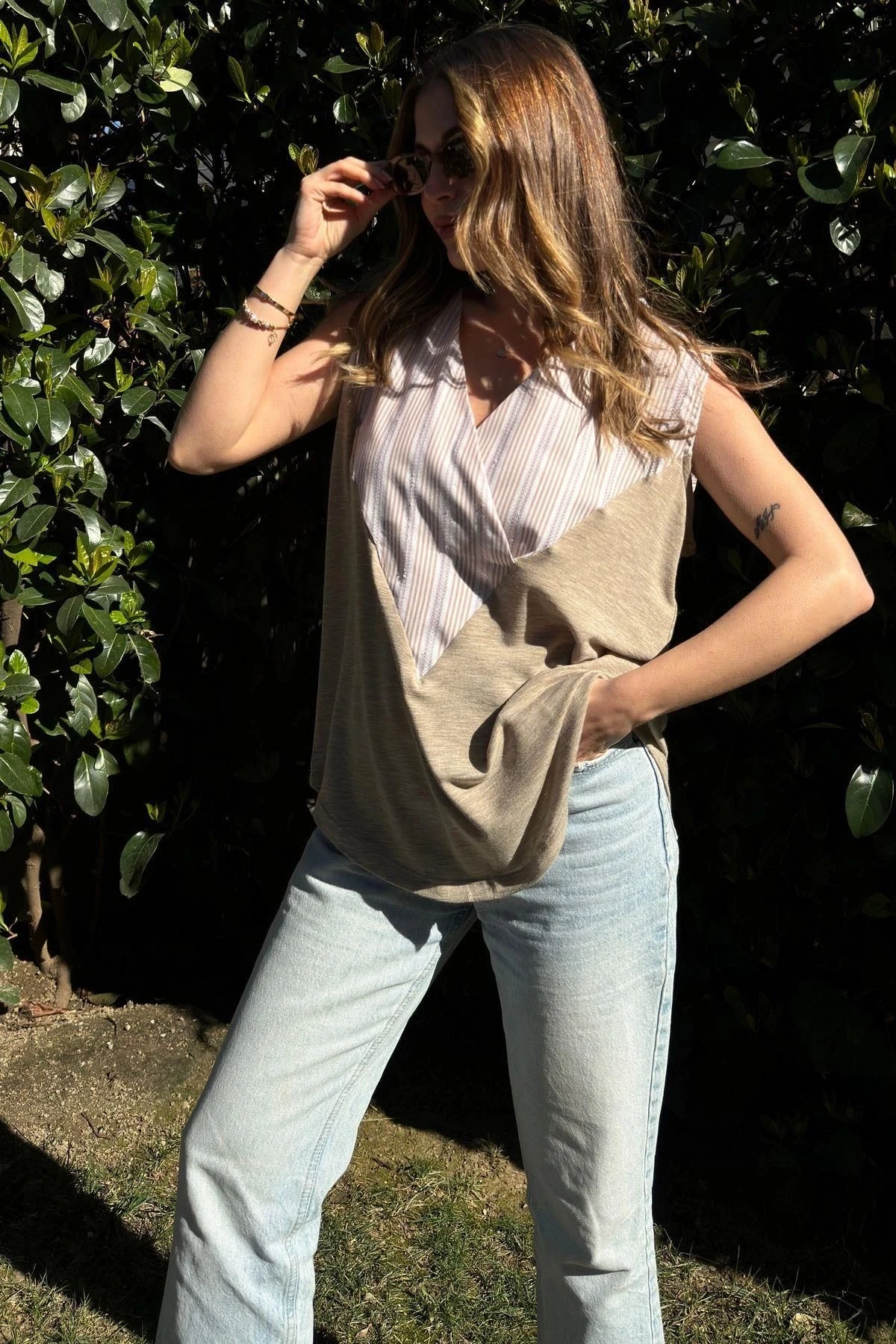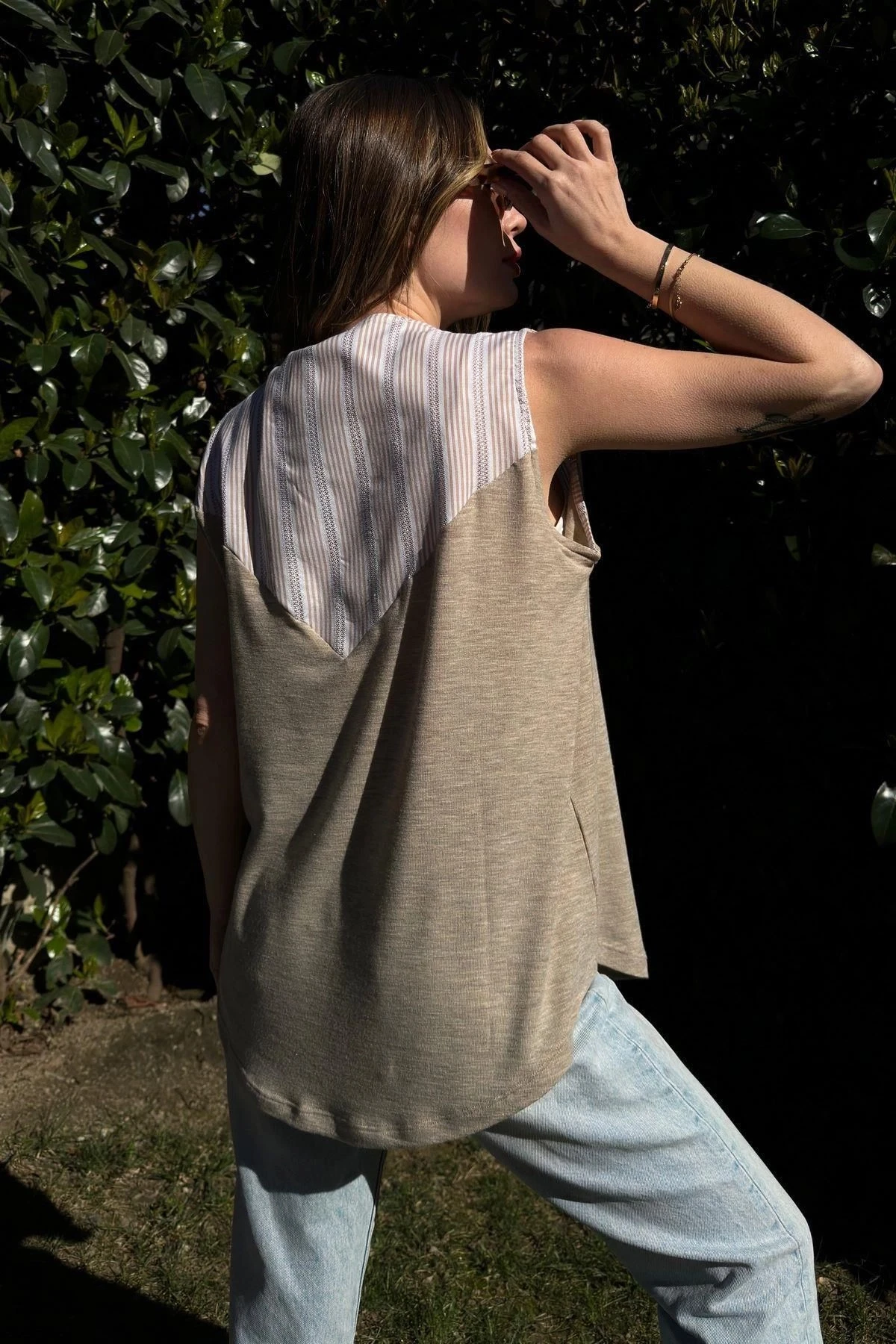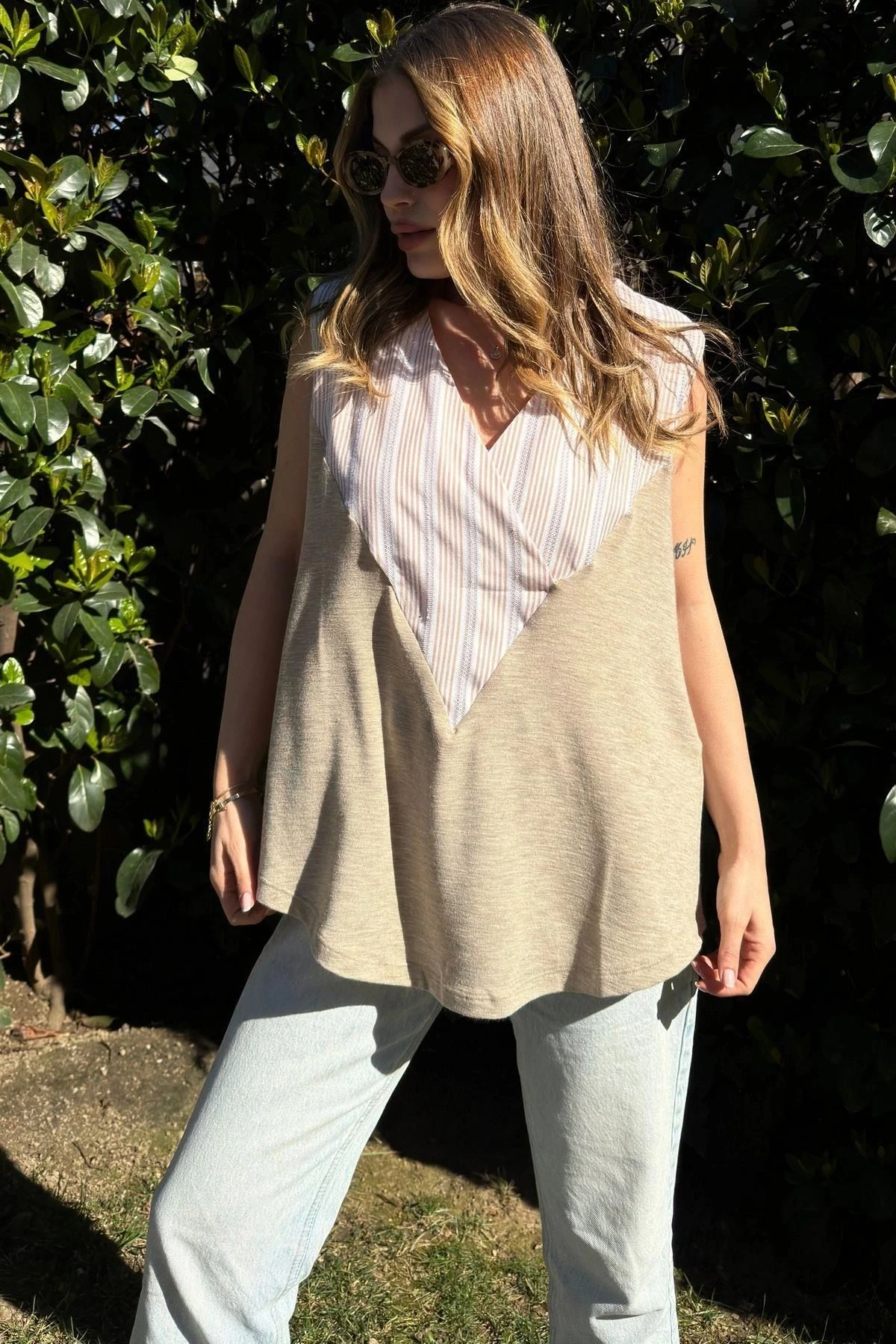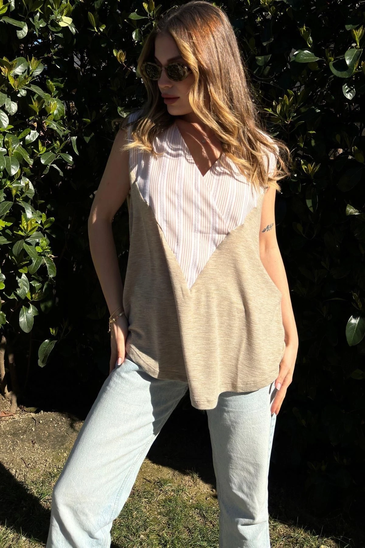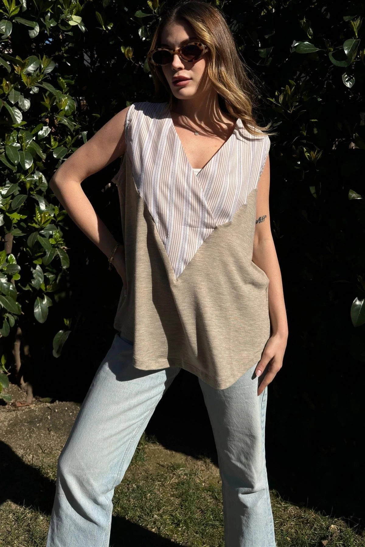 Kadın Bej Kruvaze V Yaka, Kolsuz, Color Block, Salaş Bluz