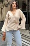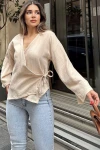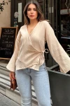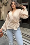 Kadın Bej Kruvaze Yaka, Çapraz Bağlamalı, Flare Kollu, Salaş Müslin Bluz