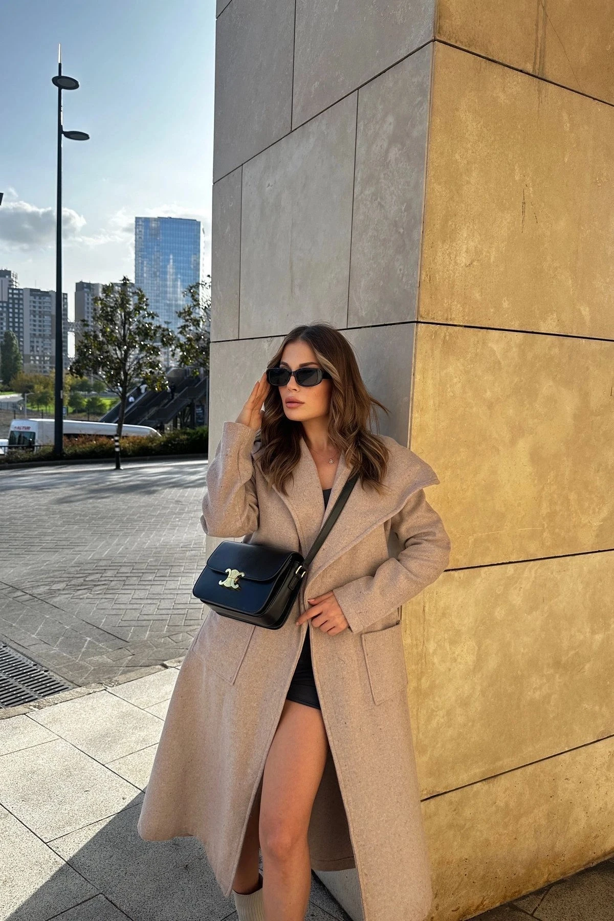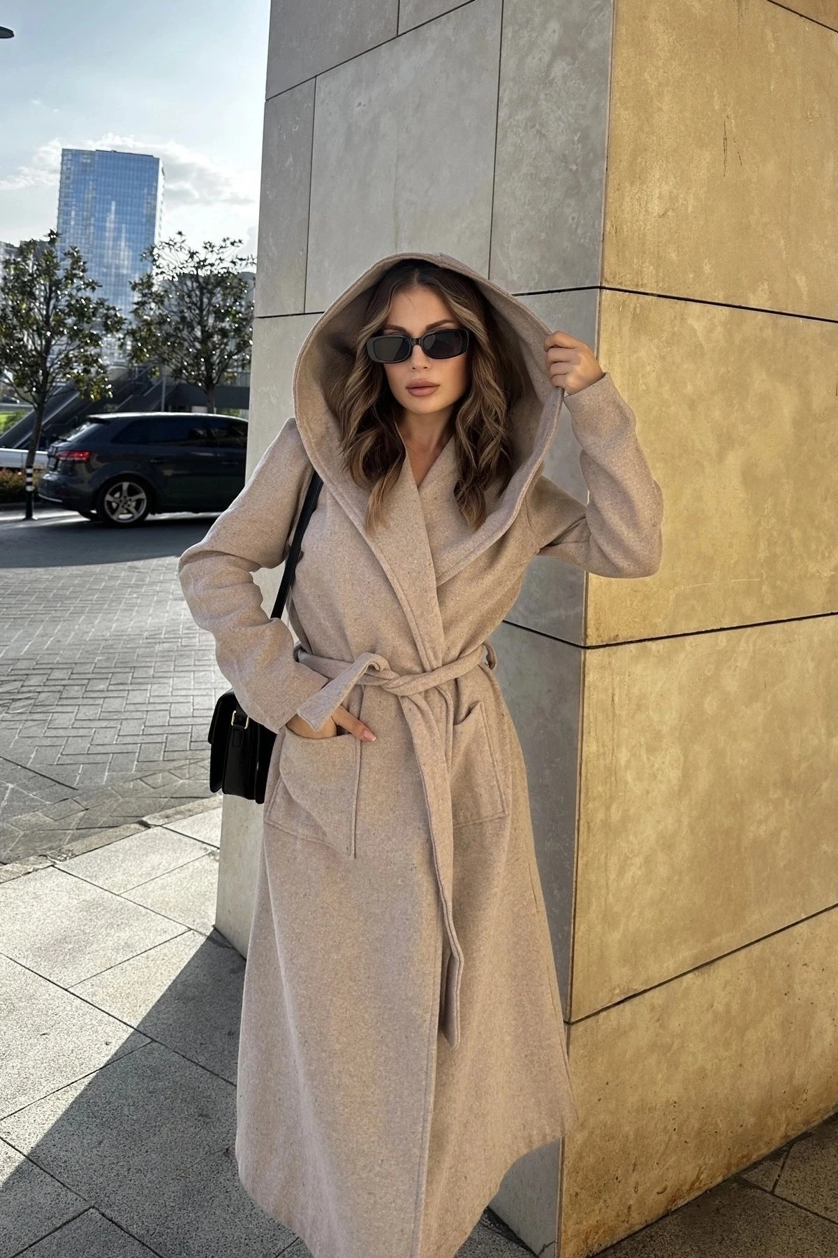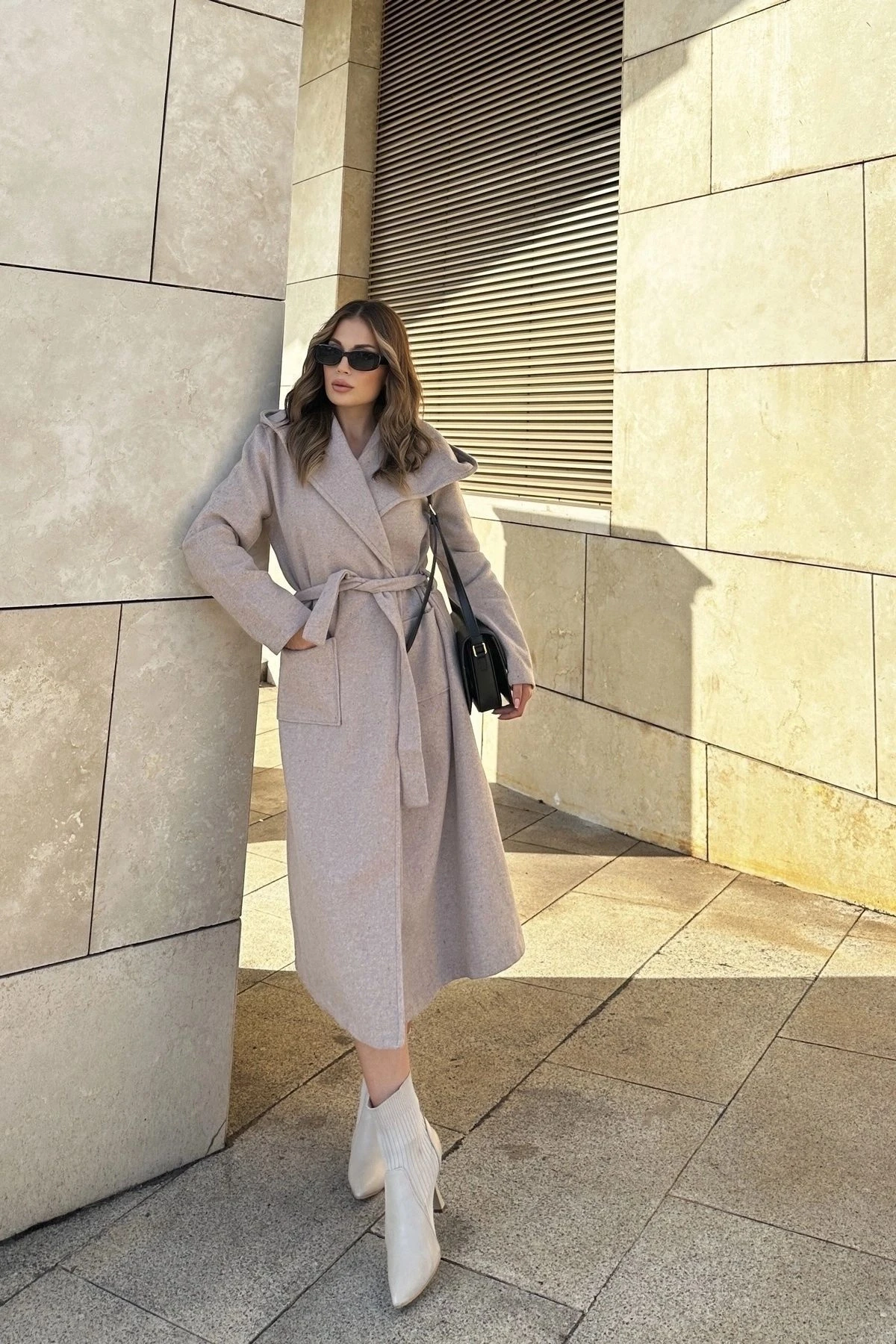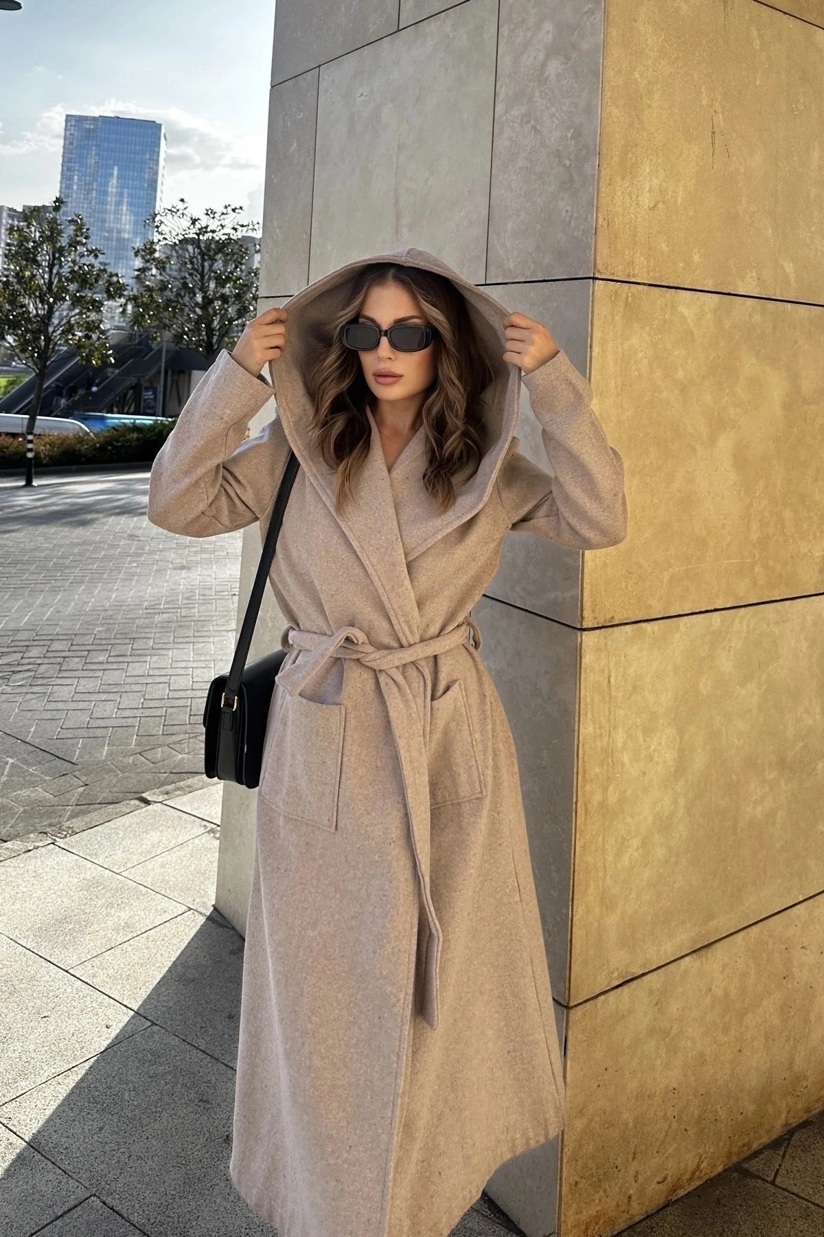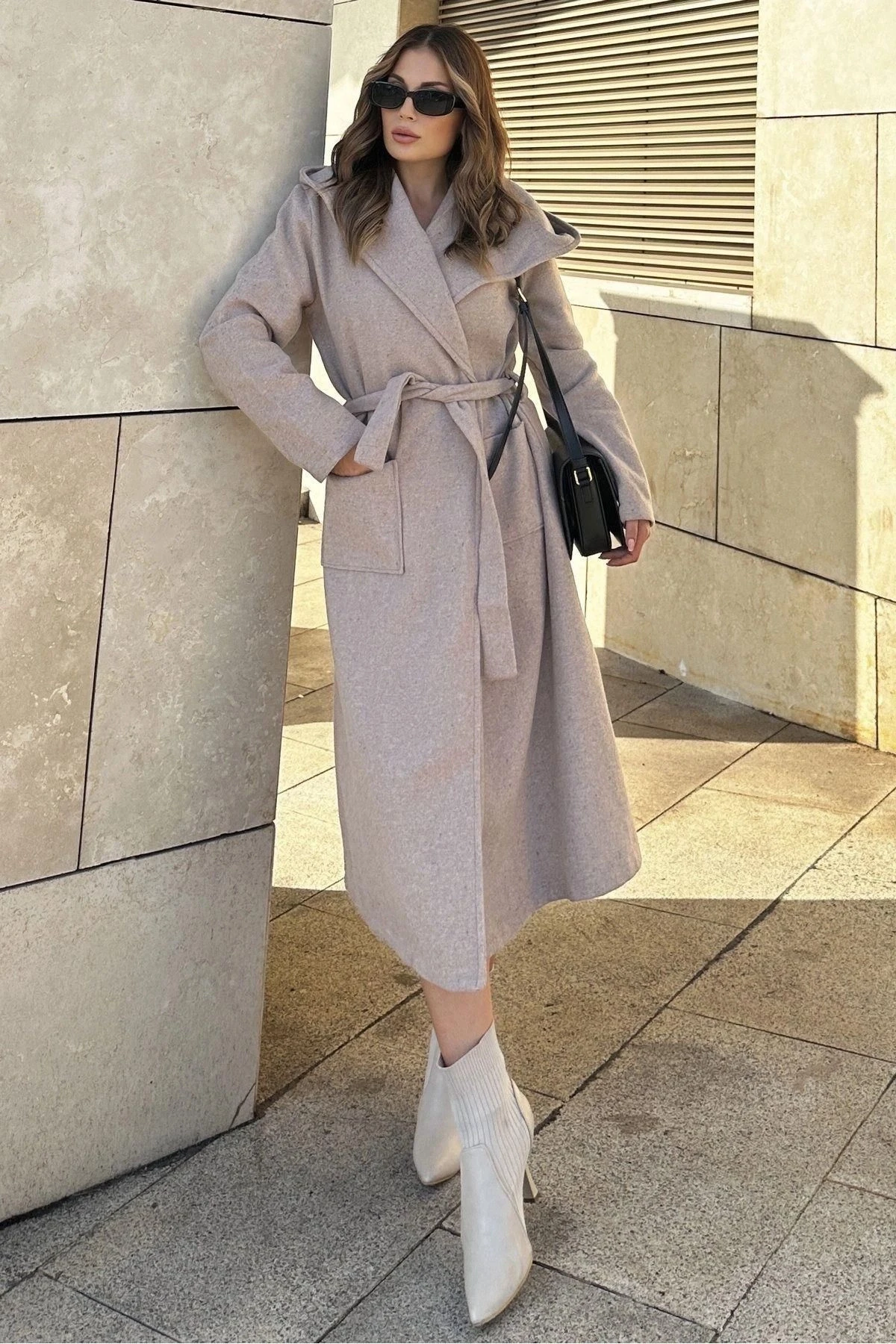 Kadın Bej Kruvaze Yaka, Kapüşonlu, Çift Cepli, Beli Kemerli, Uzun Kaşe Kaban (ASTARSIZ)
