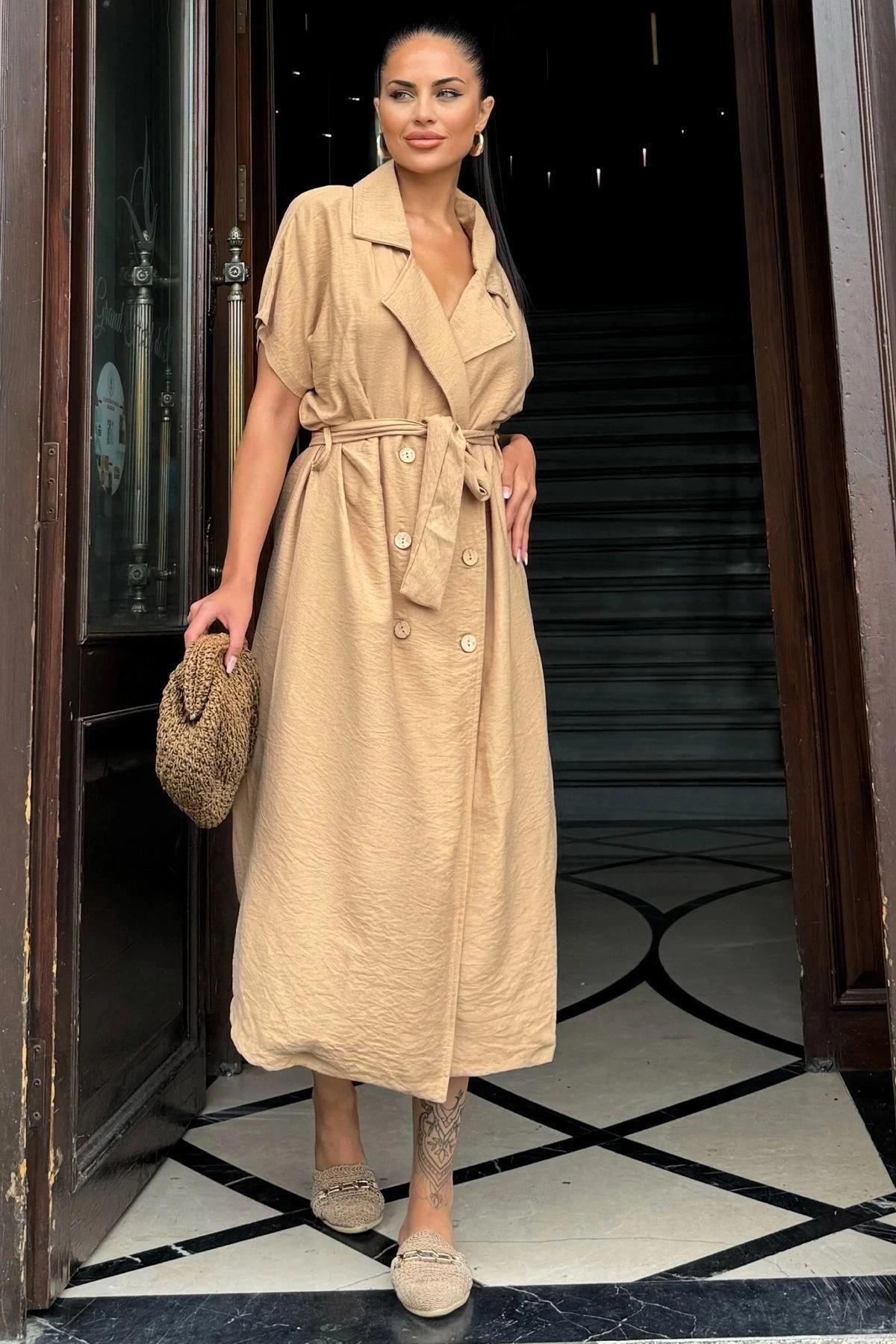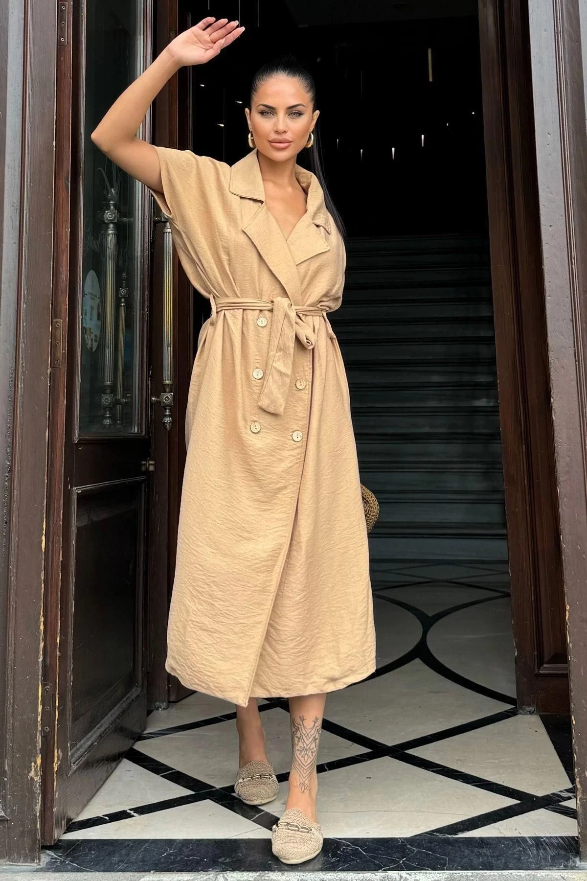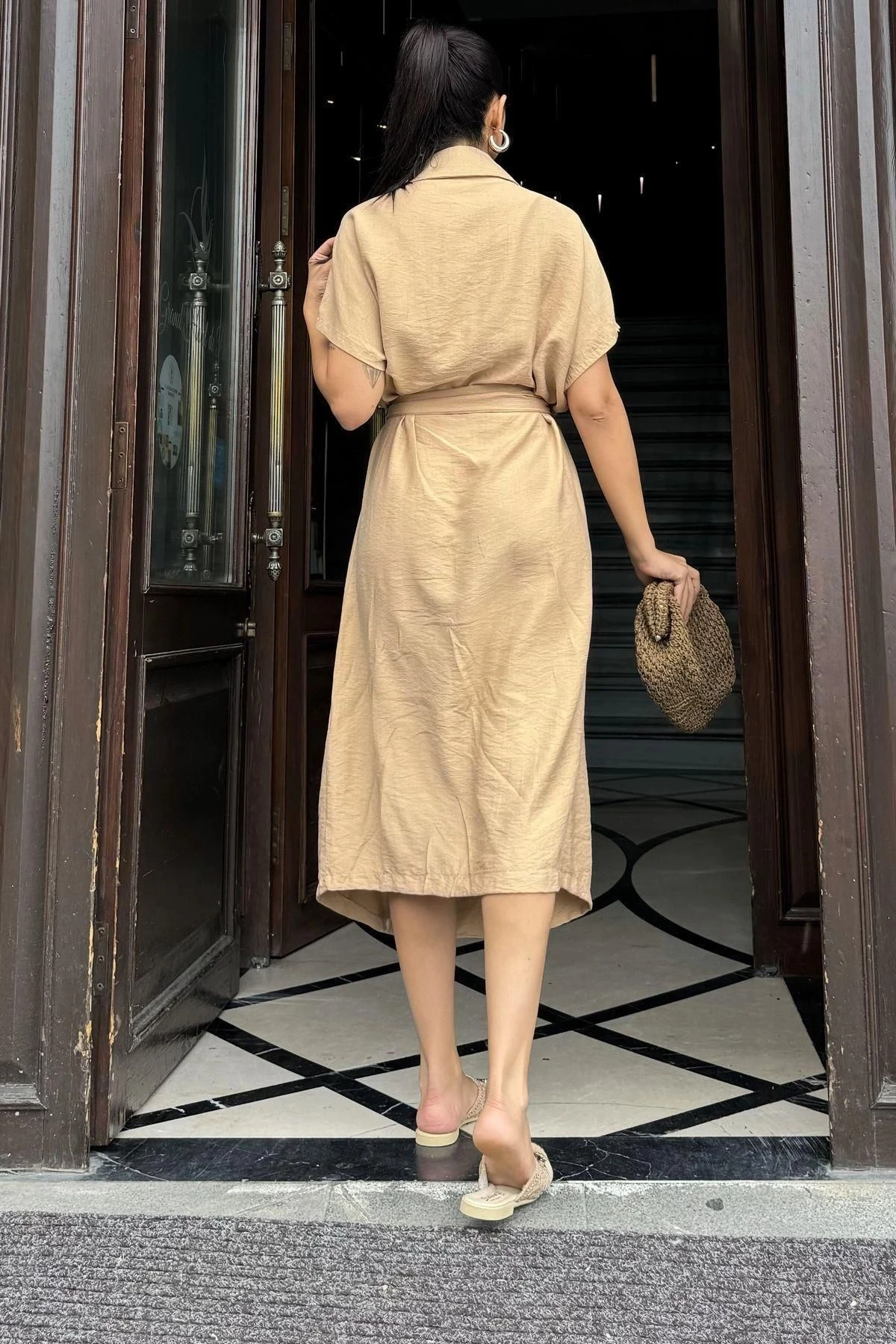 Kadın Bej Kruvaze Yaka, Kısa Kollu, Kemer Detaylı, Rahat Kesim, Midi Keten Elbise