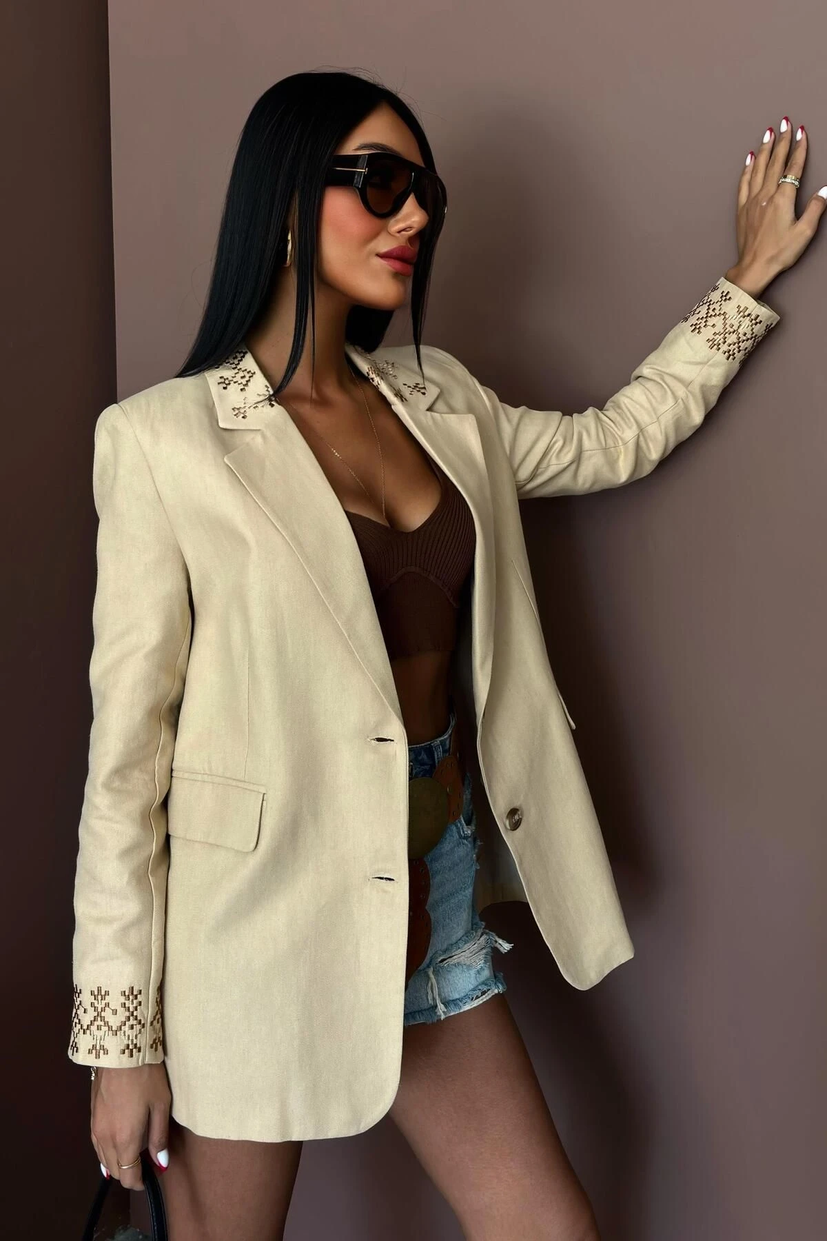 Kadın Bej Nakışlı Kruvaze Uzun Kol Ceket
