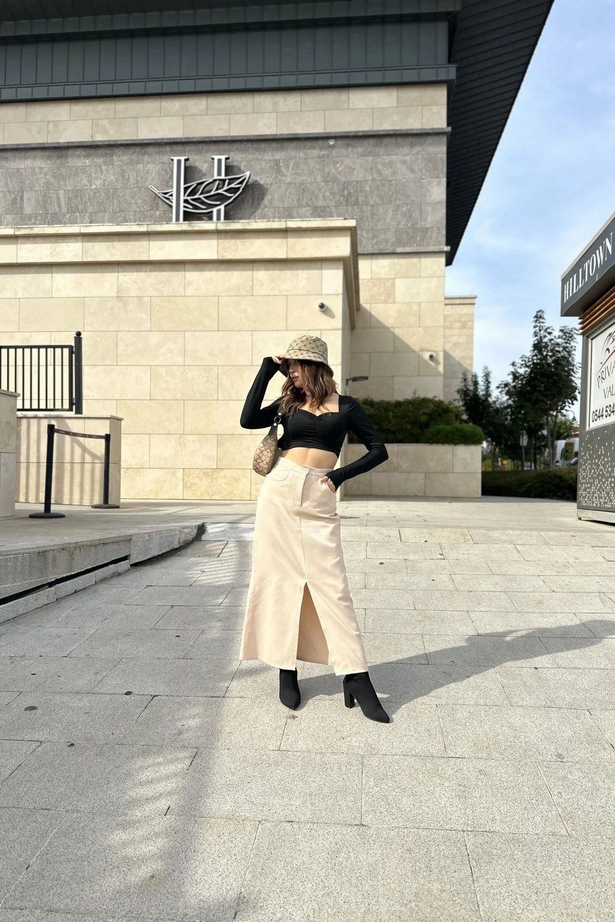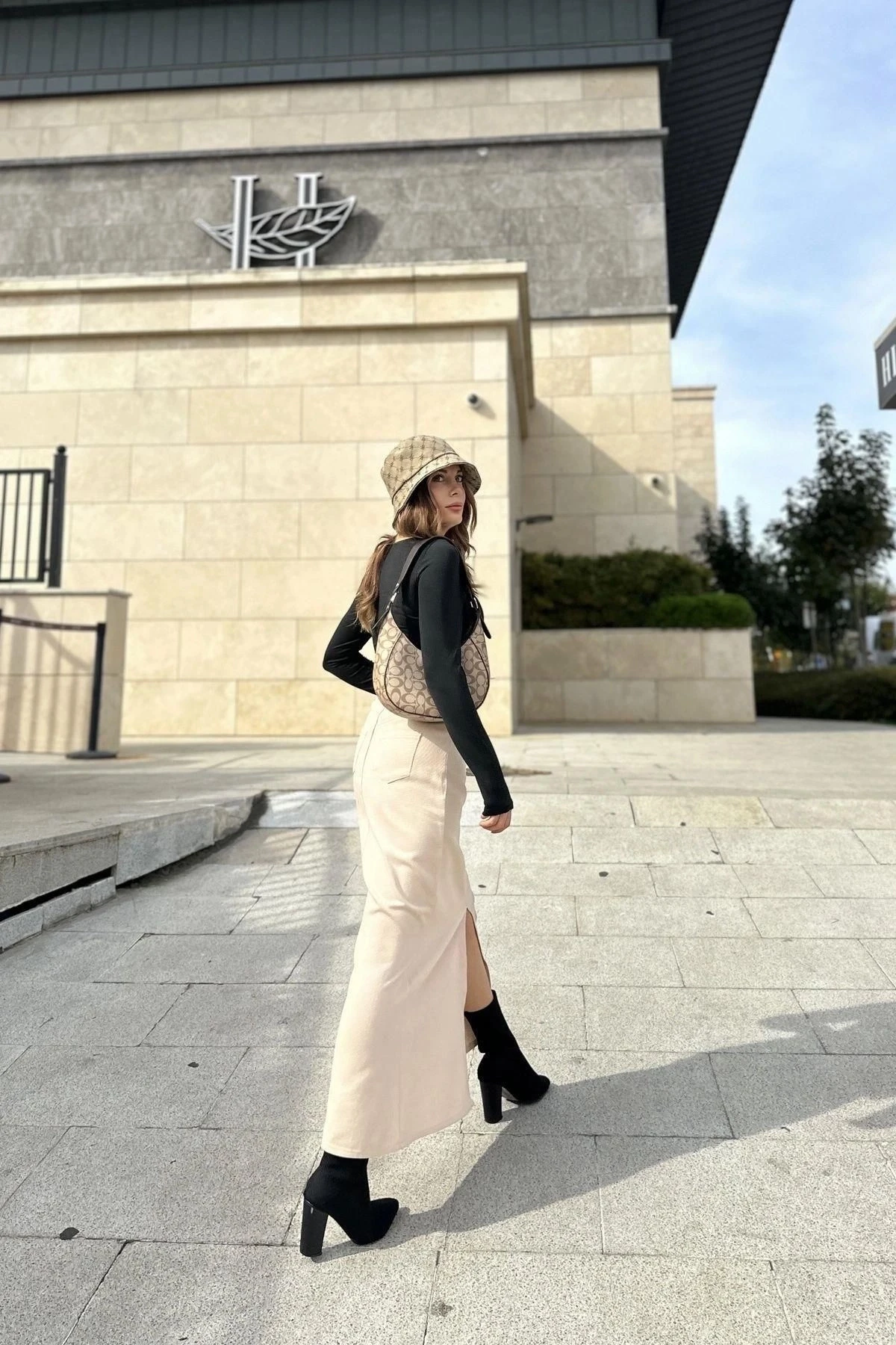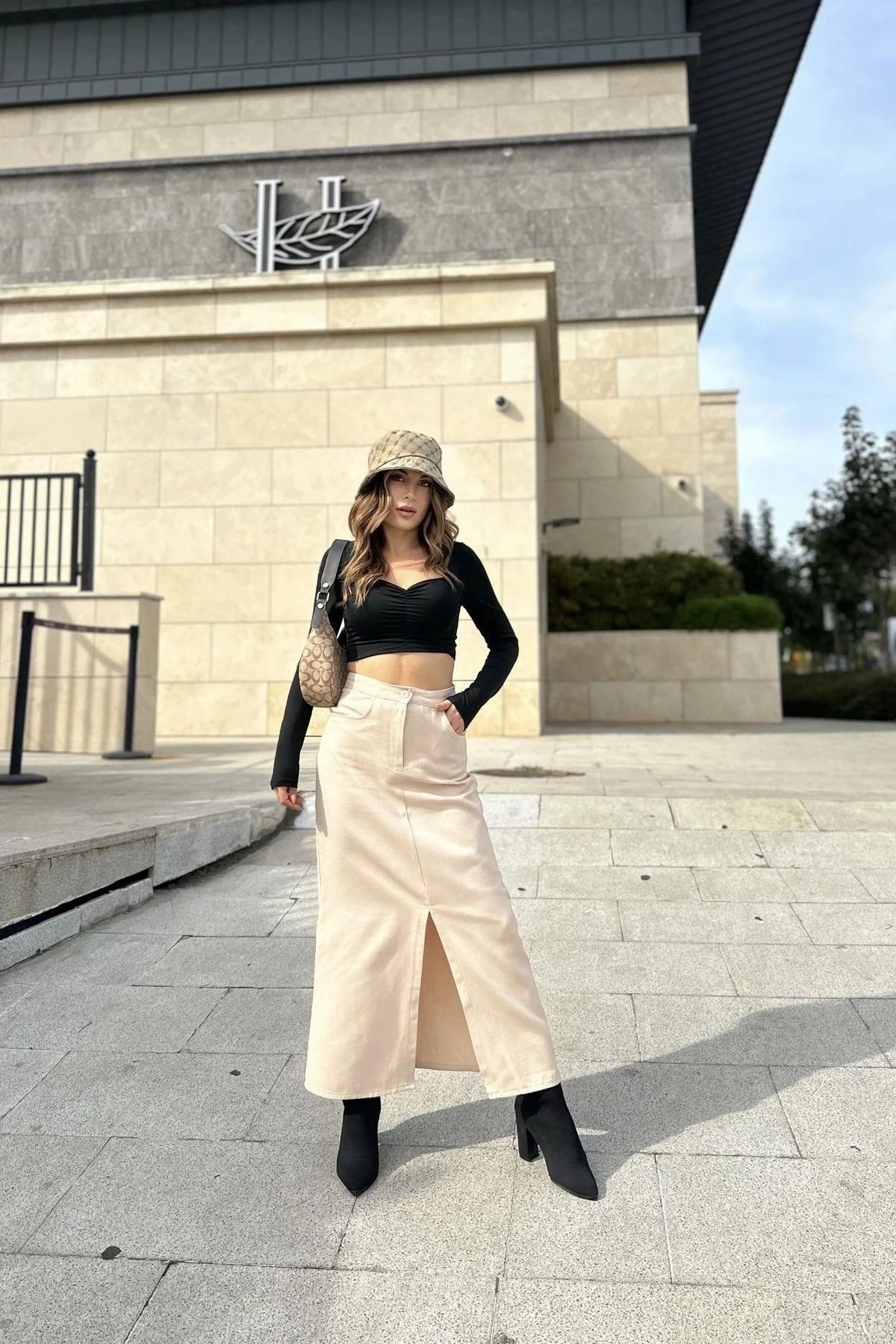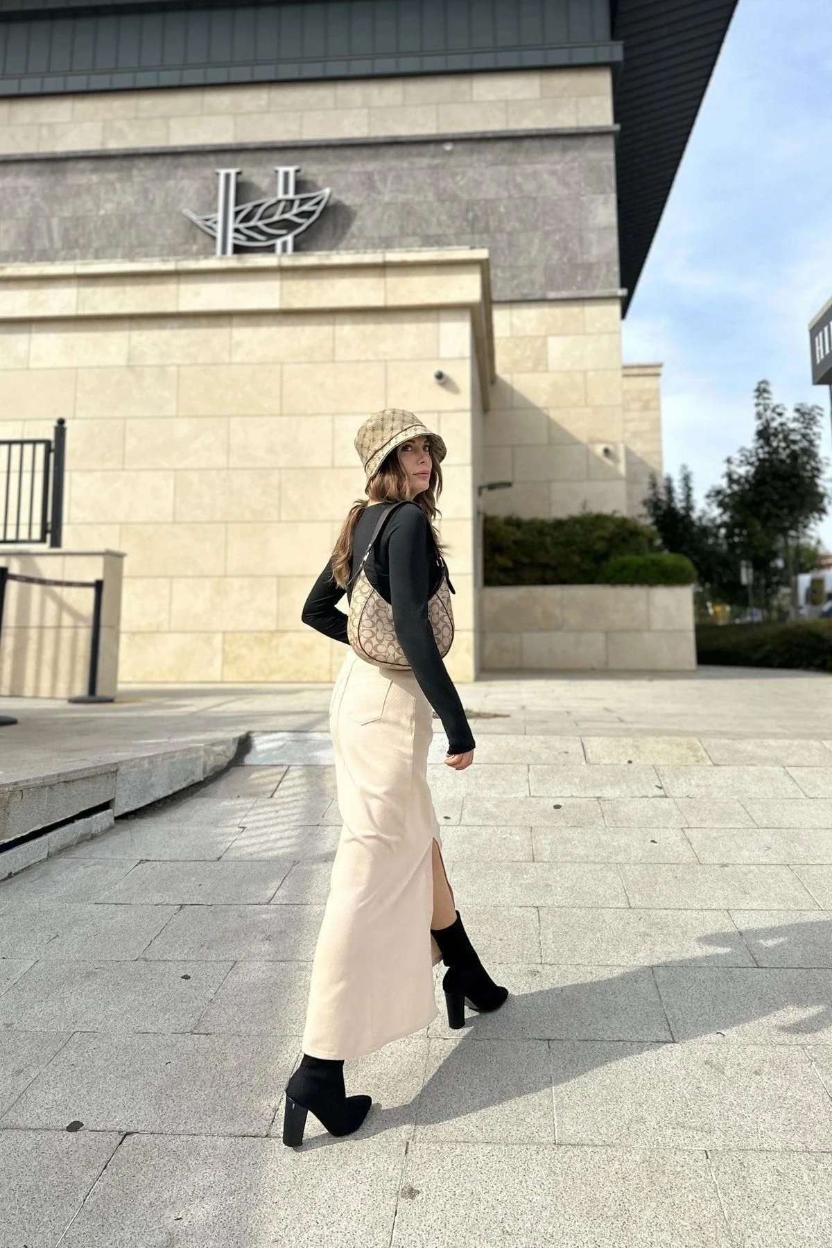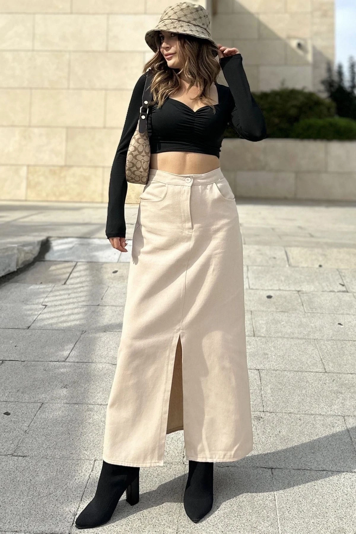 Kadın Bej Önü Yarım Yırtmaçlı, Yüksek Bel, Cepli Uzun Gabardin Etek