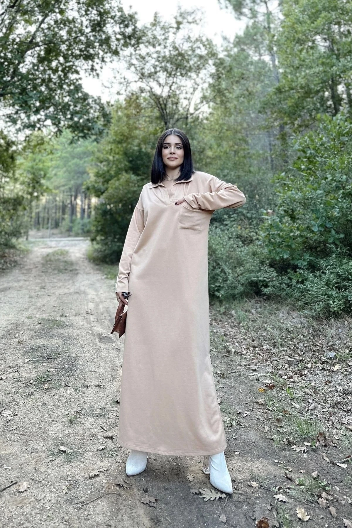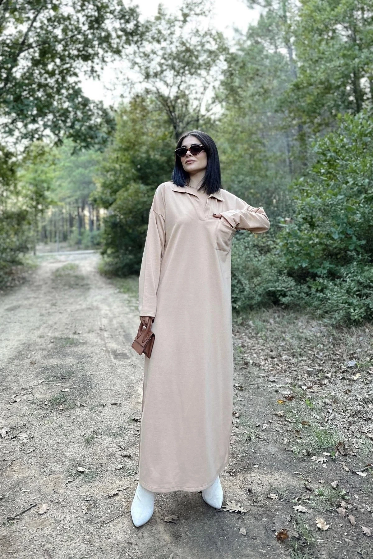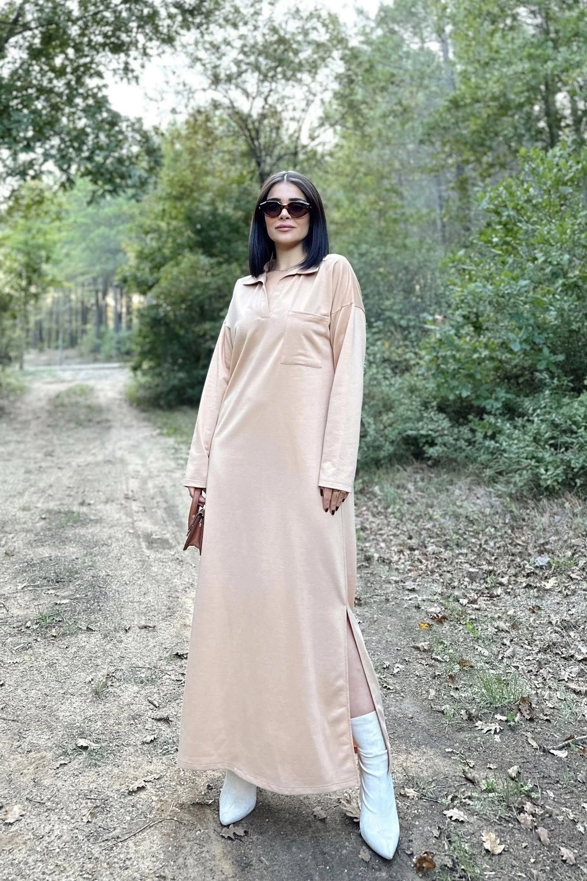 Kadın Bej Polo Yaka, Uzun Kol, Cepli, Yırtmaçlı, Salaş, Maksi Boy, Örme Elbise