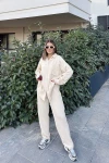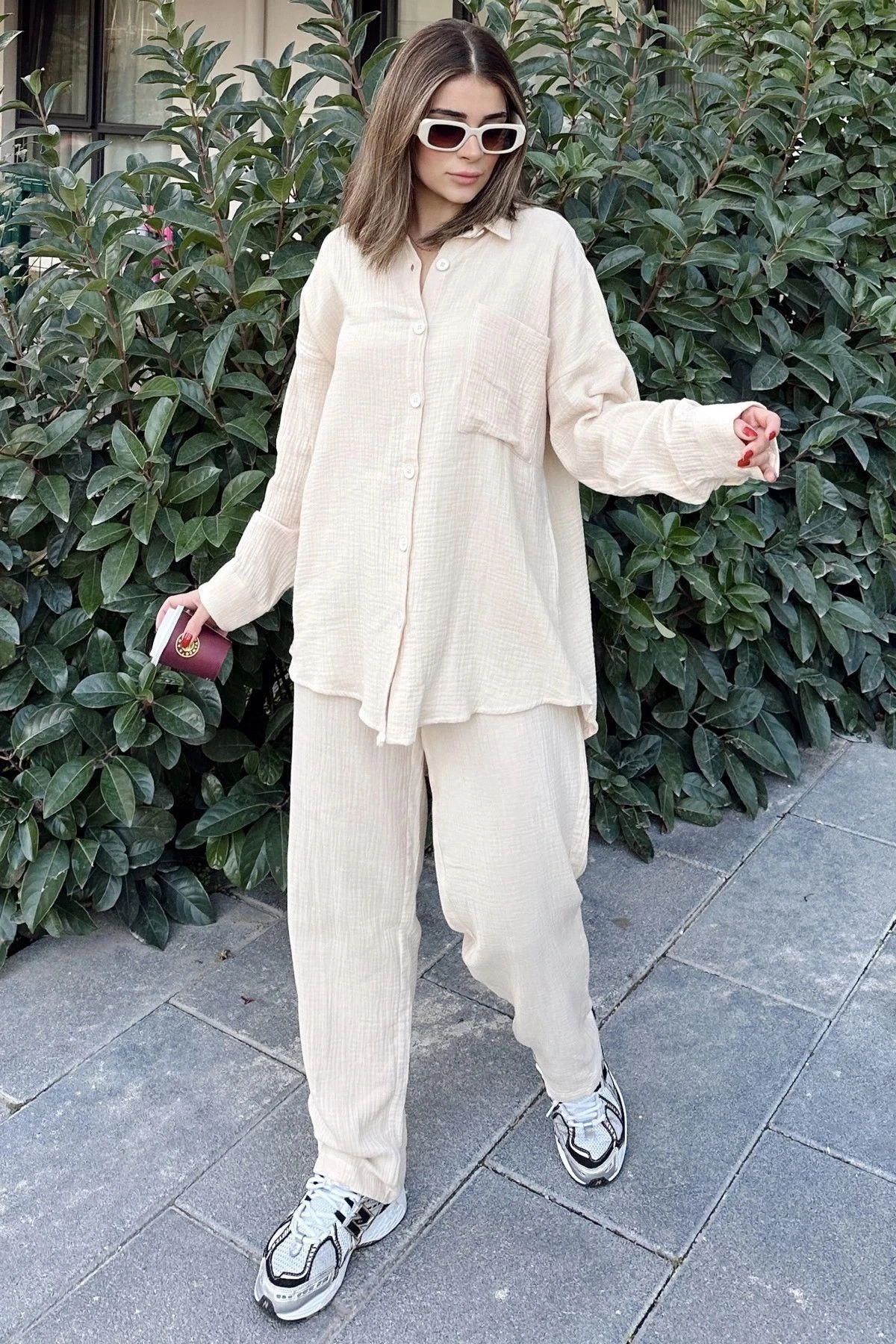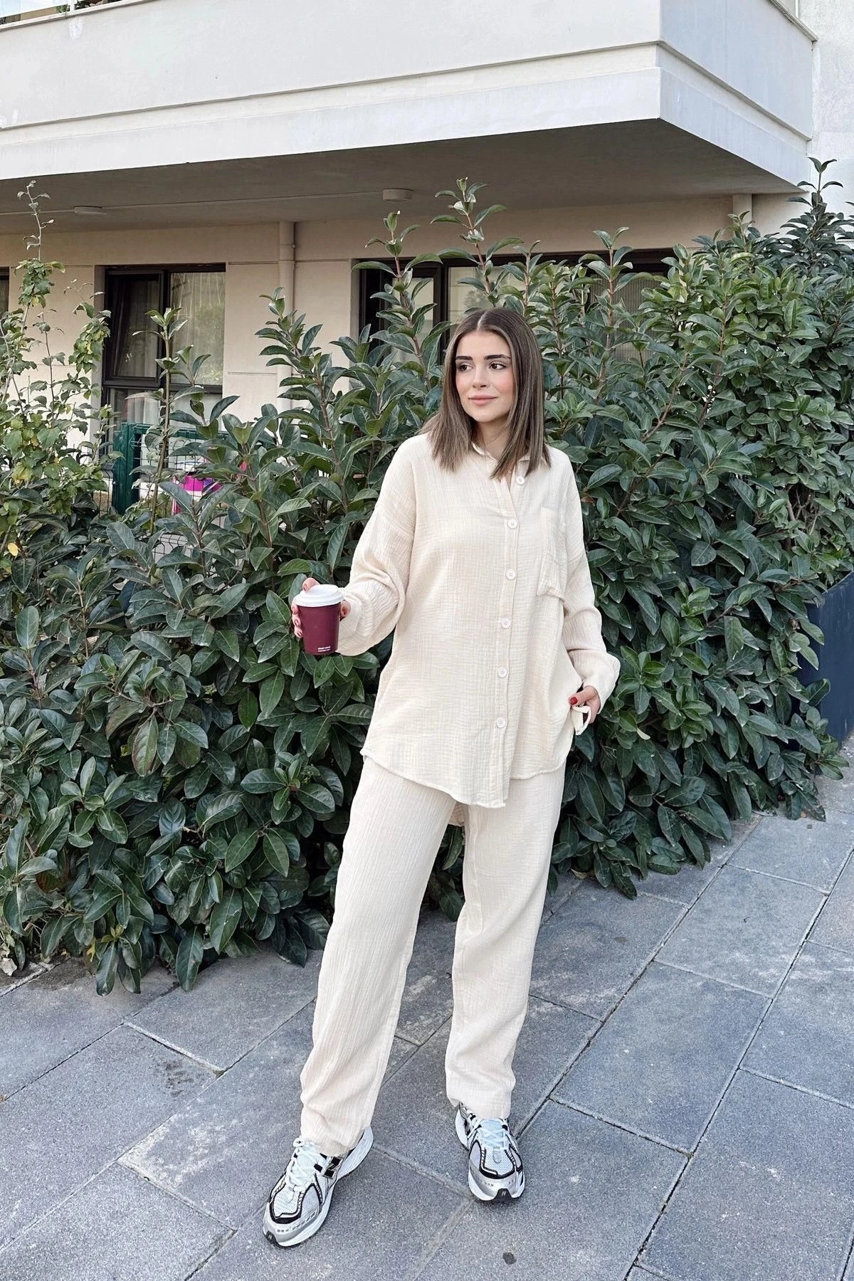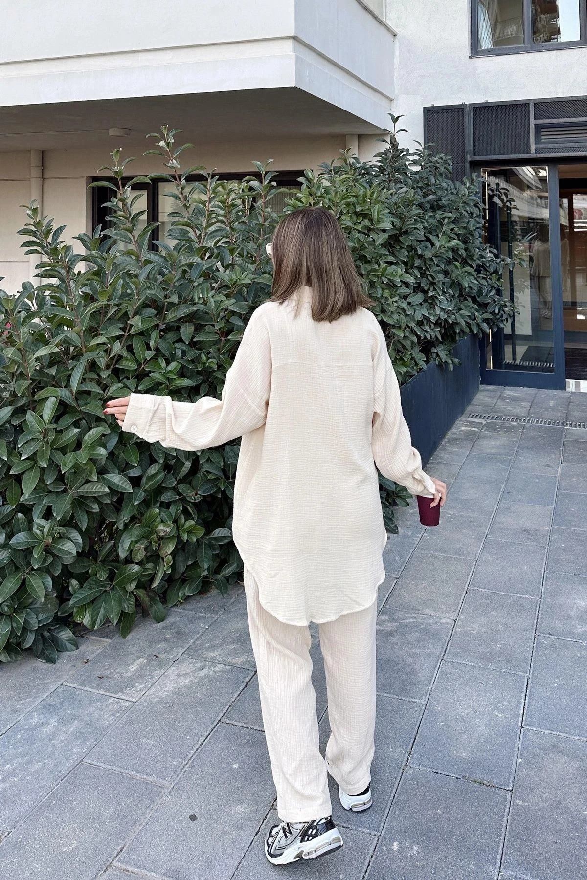 Kadın Bej Salaş Uzun Gömlek & Beli Lastikli Pantolon - Alt & Üst Müslin Kumaş Takım