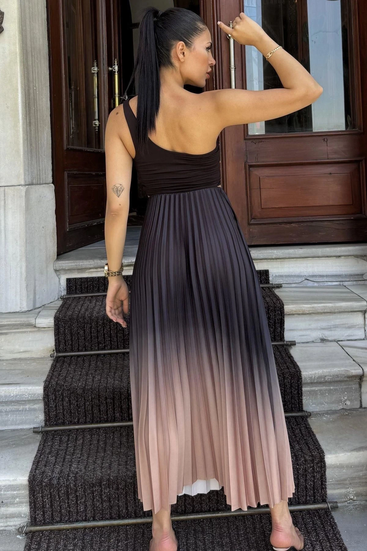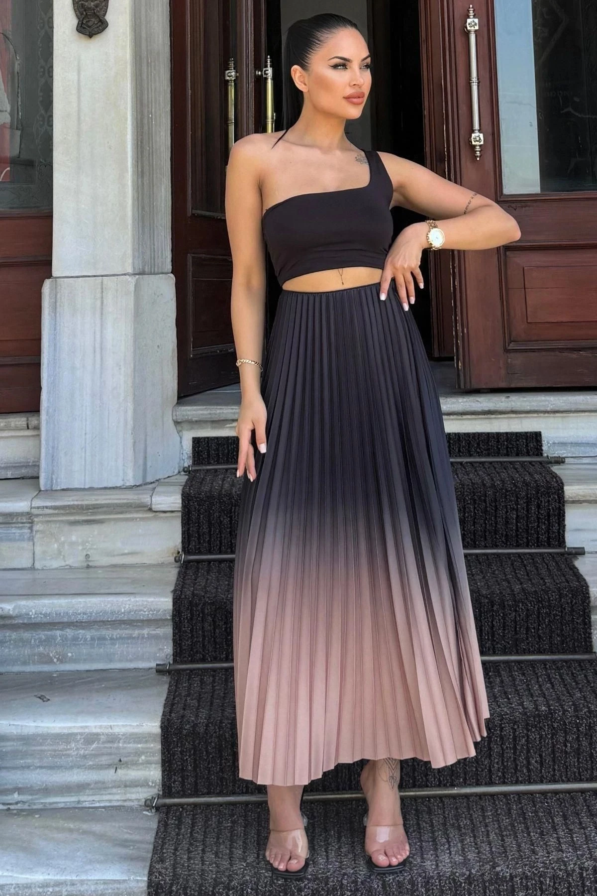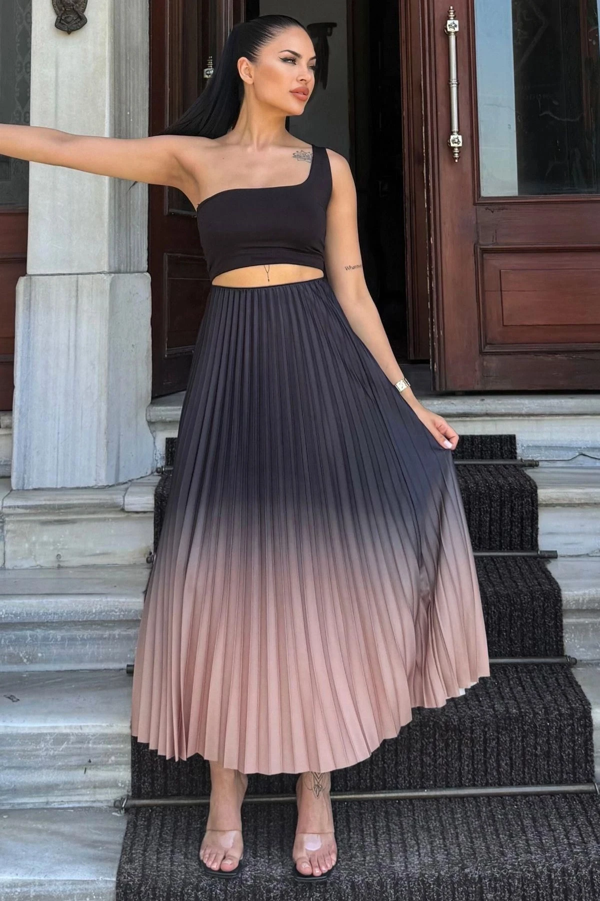 Kadın Bej & Siyah Ombre Desen, Pilili Maxi Etek