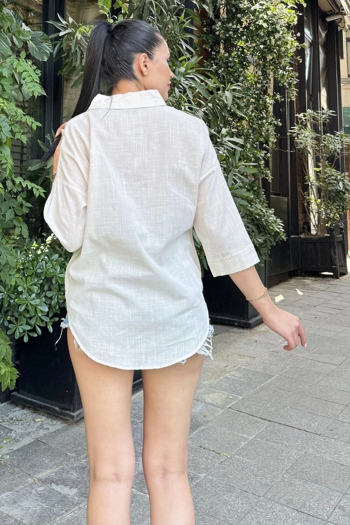 Kadın Bej Truvakar Kol, Oval Kesim, Terletmez, Flamlı Keten Salaş Gömlek