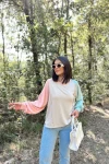 Kadın Bej Uzun Balon Kol, Yuvarlak Yaka, Kolları Double Color Block Basic Sweatshirt Bluz