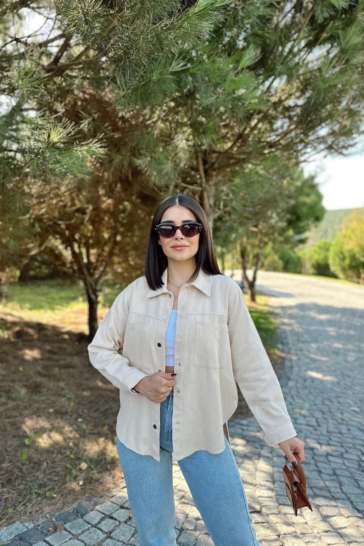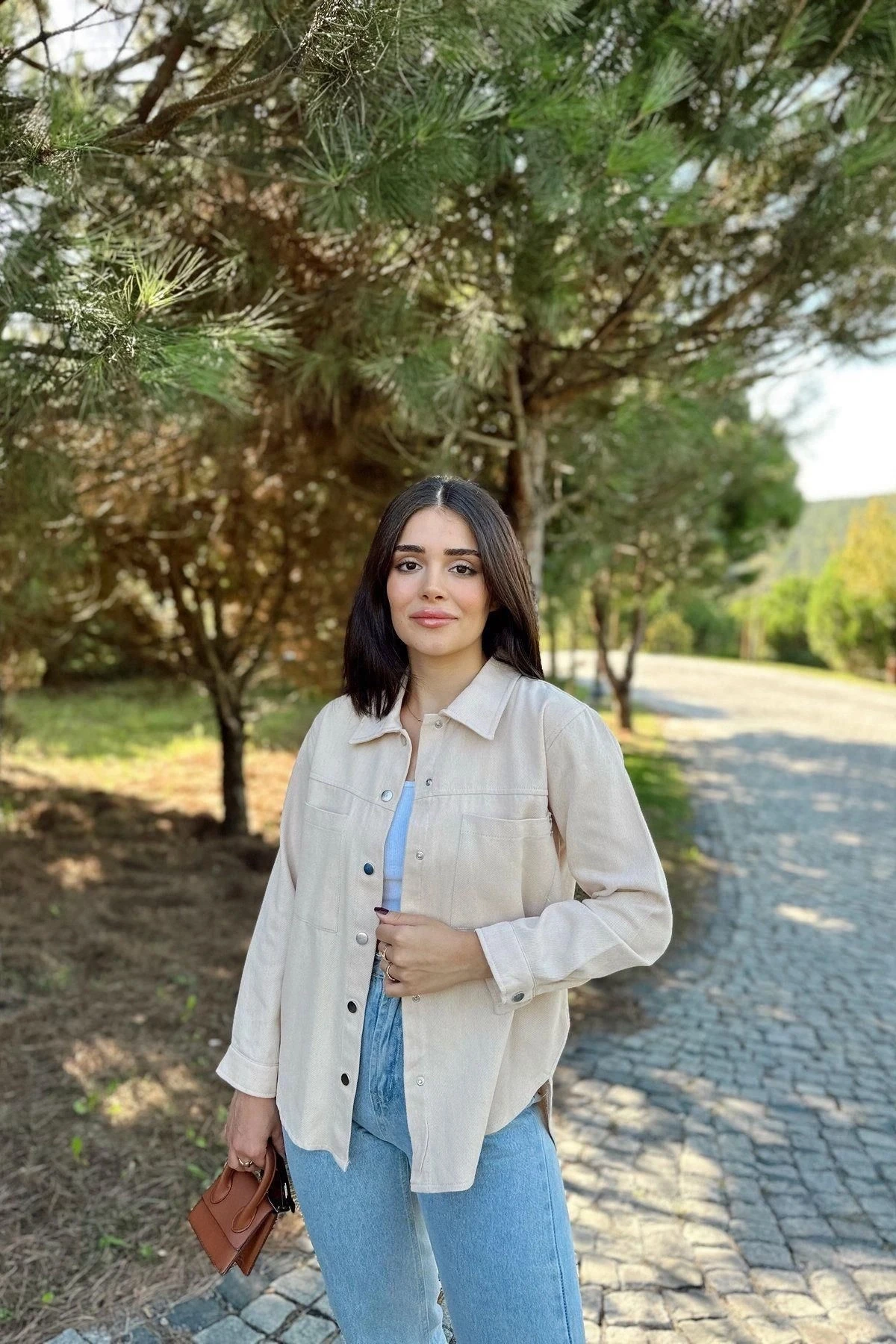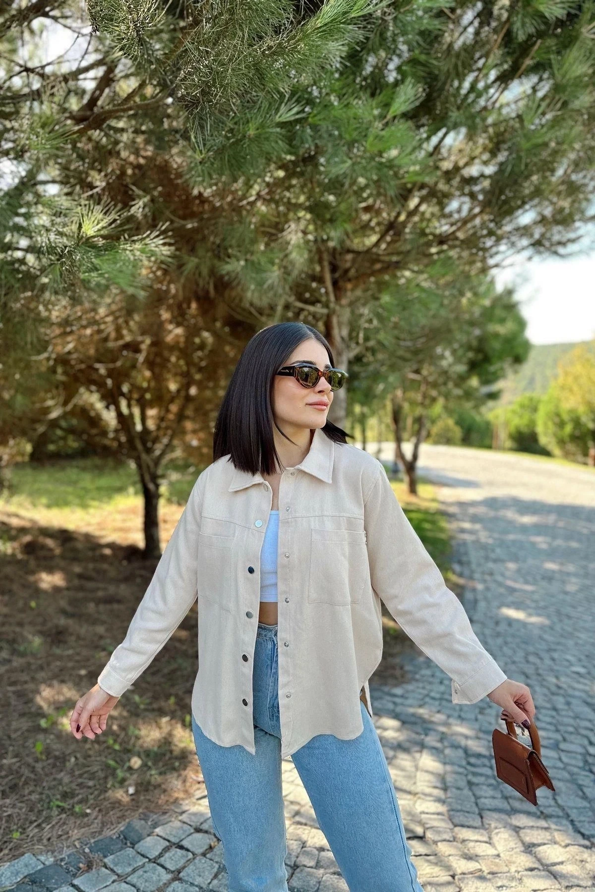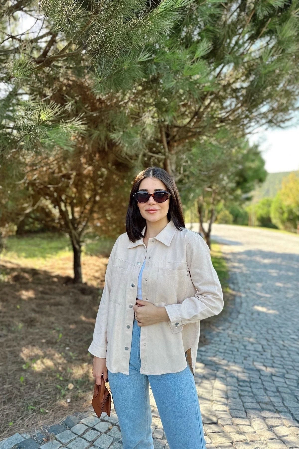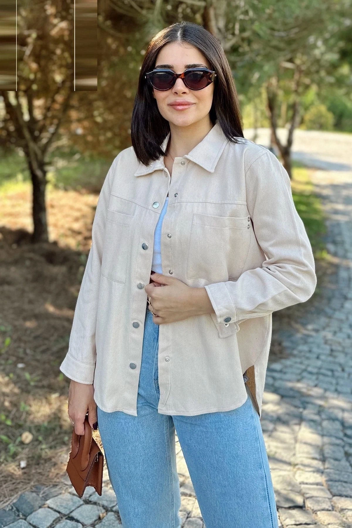 Kadın Bej Uzun Kol, Çift Cep, Arkası Pliseli, Eteği Oval Kesim, Yırtmaçlı, Gabardin Gömlek Ceket