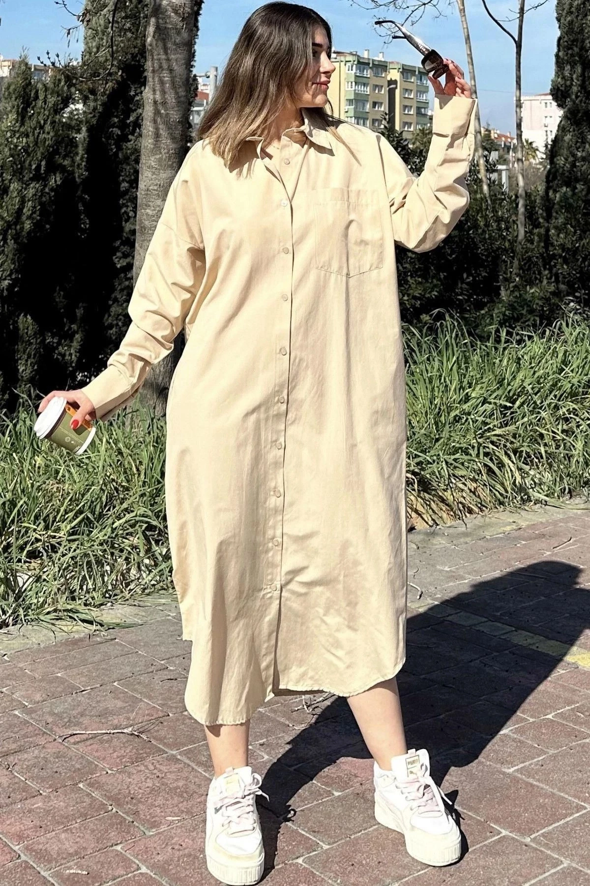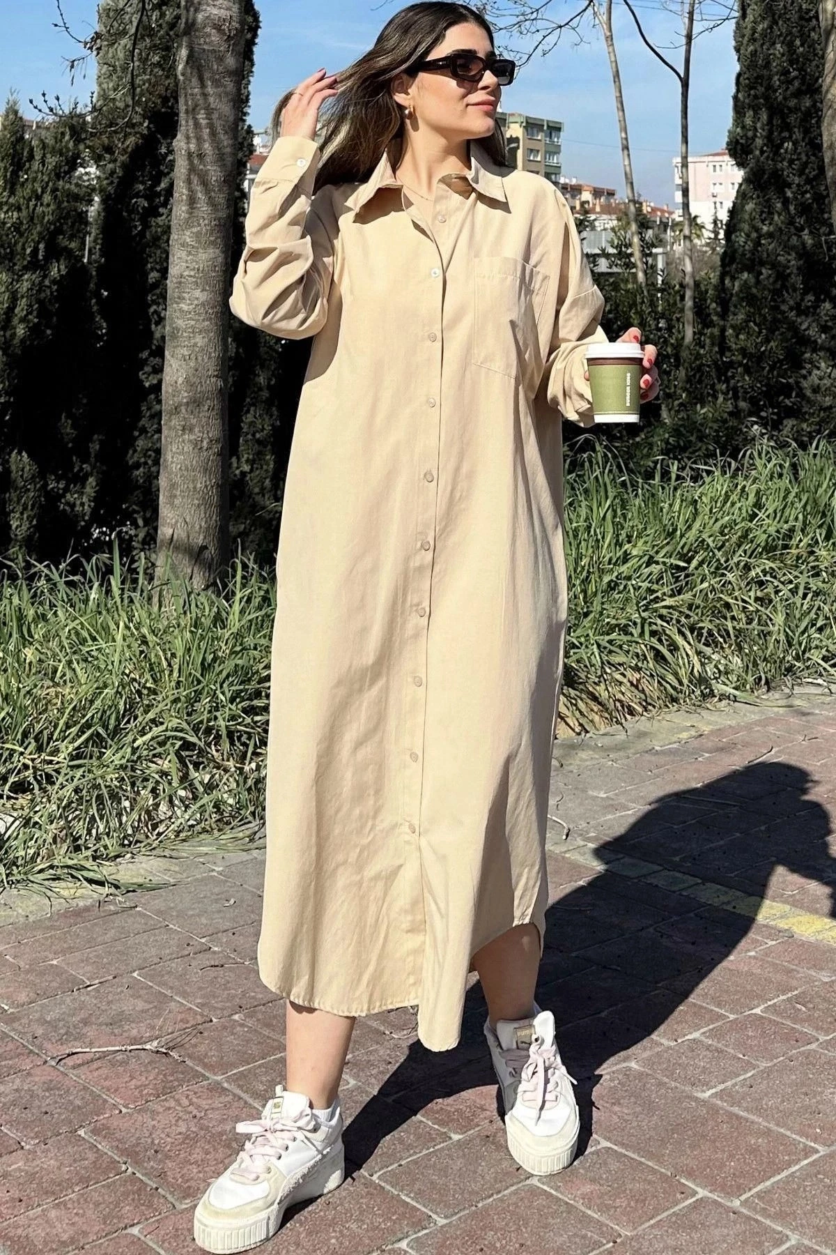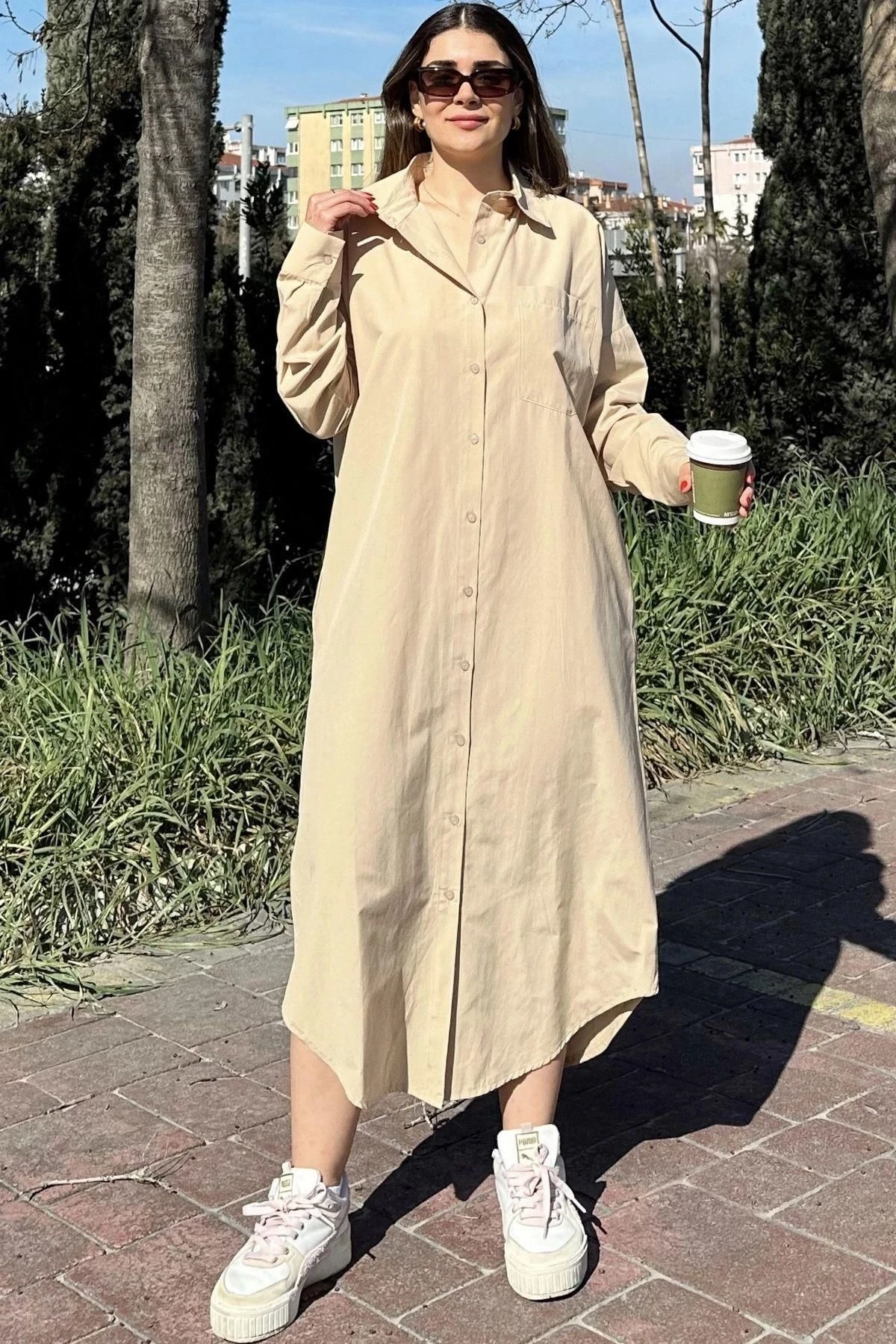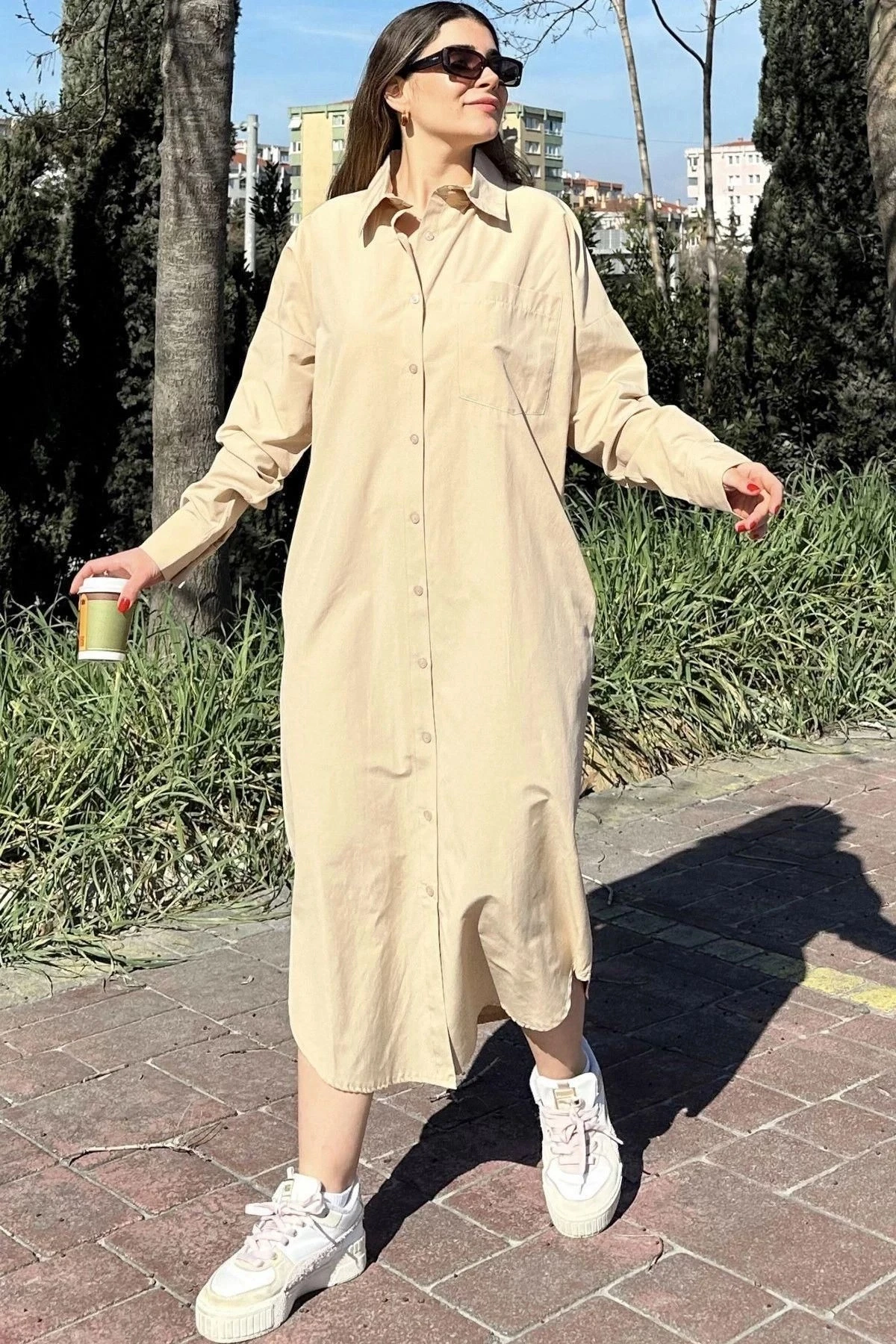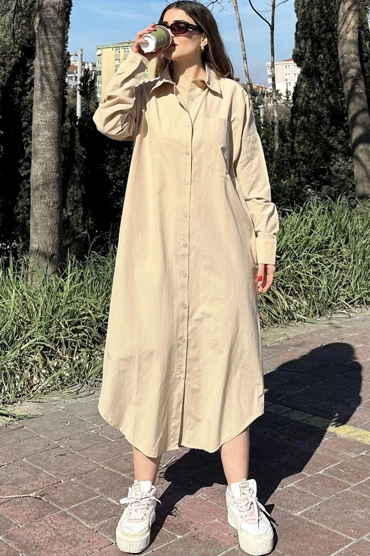 Kadın Bej Uzun Kol, Eteği Oval Kesim, Uzun Ve Salaş, Poplin Gömlek Elbise