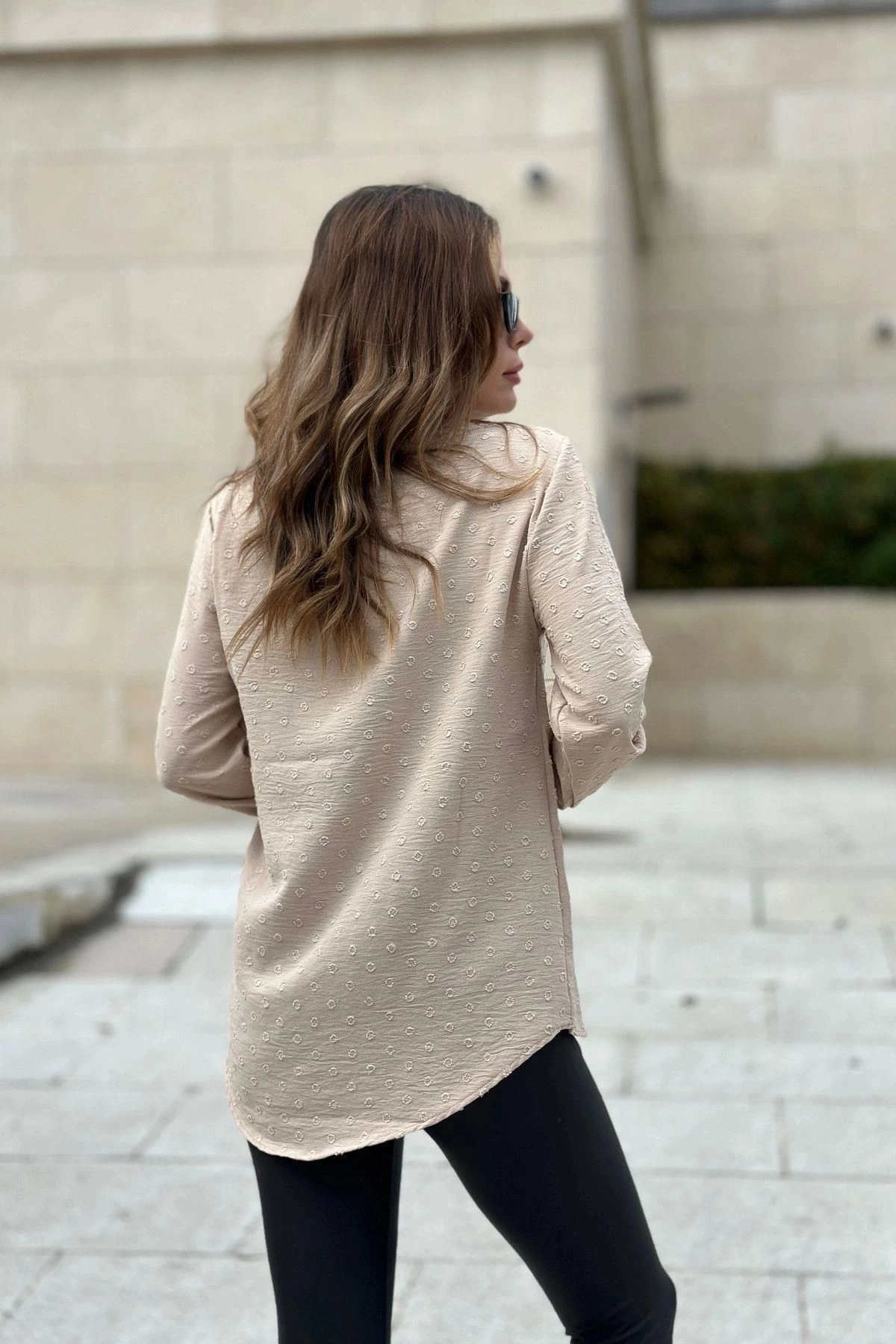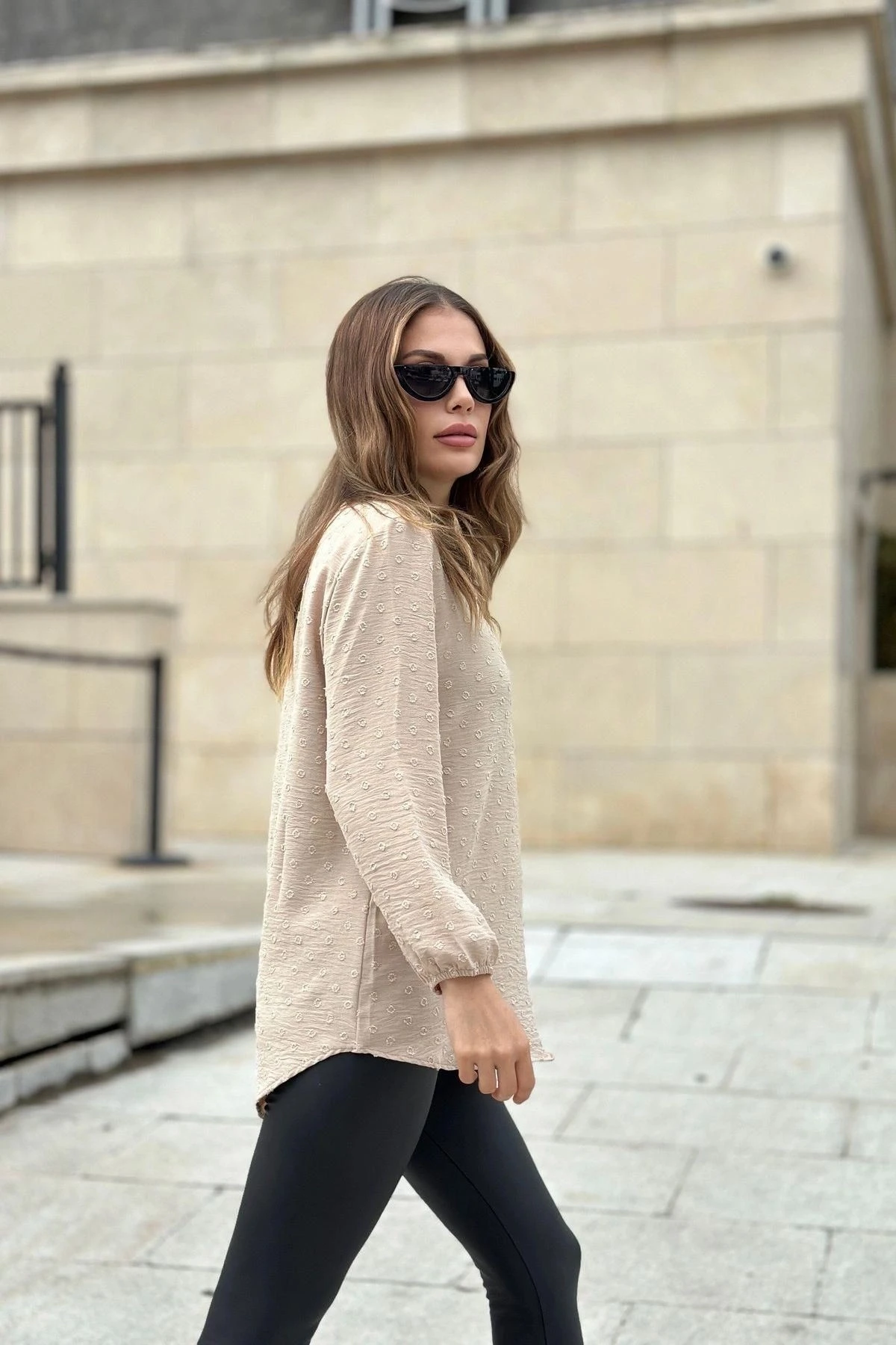 Kadın Bej Uzun Truvakar Kol, Öpücük Yaka, Ponponlu Kumaş Basic Kesim Bluz - Tesettüre Uygun