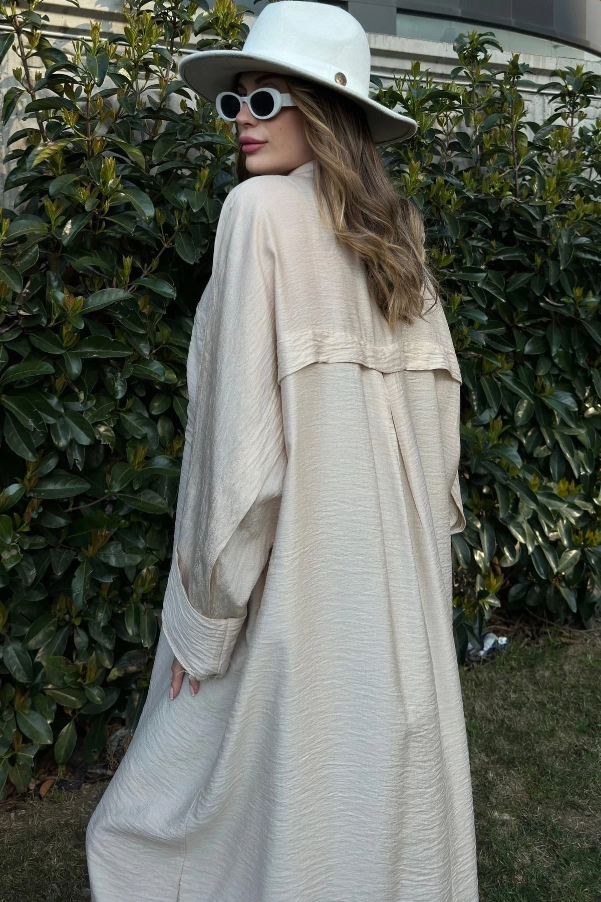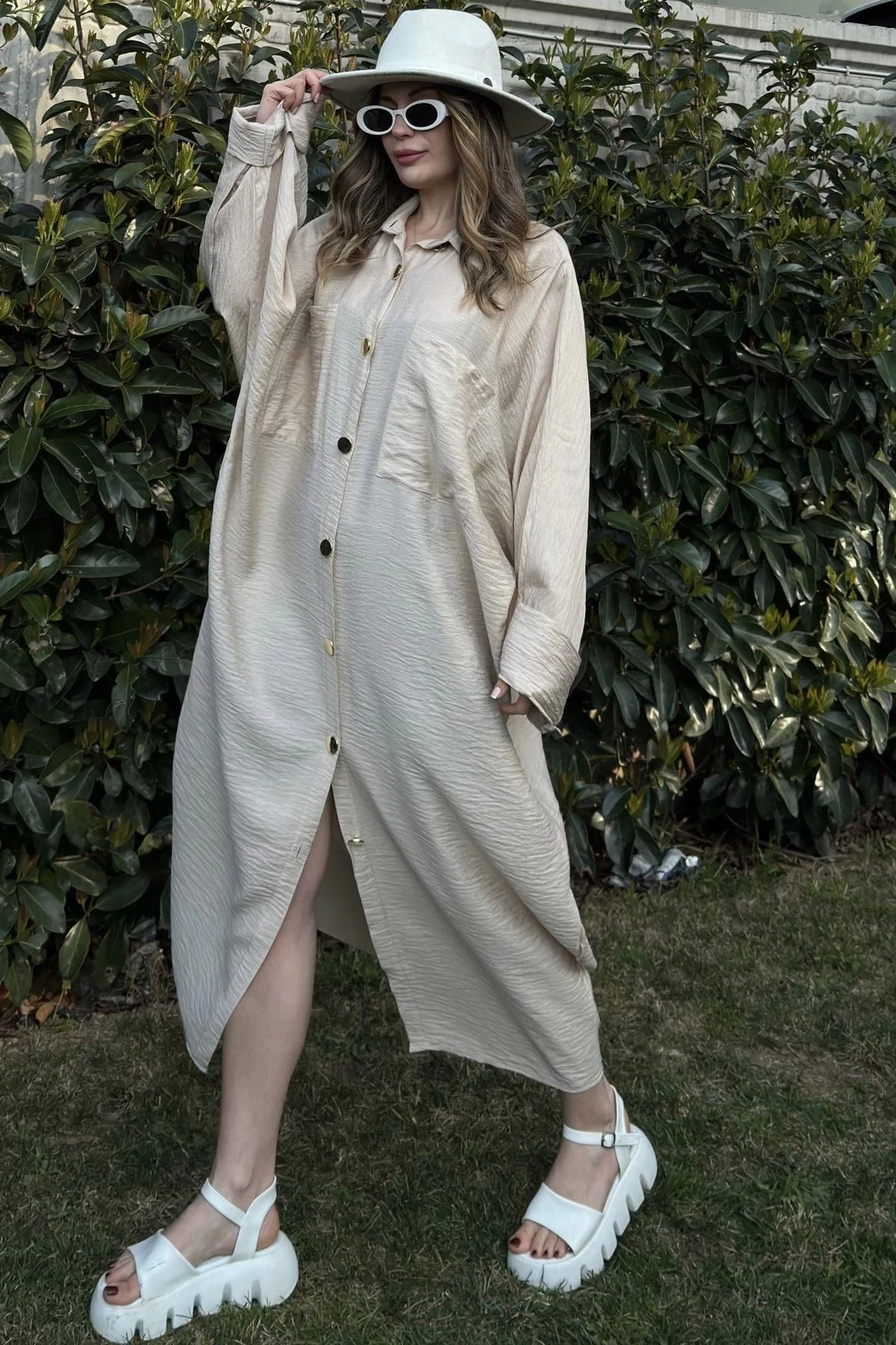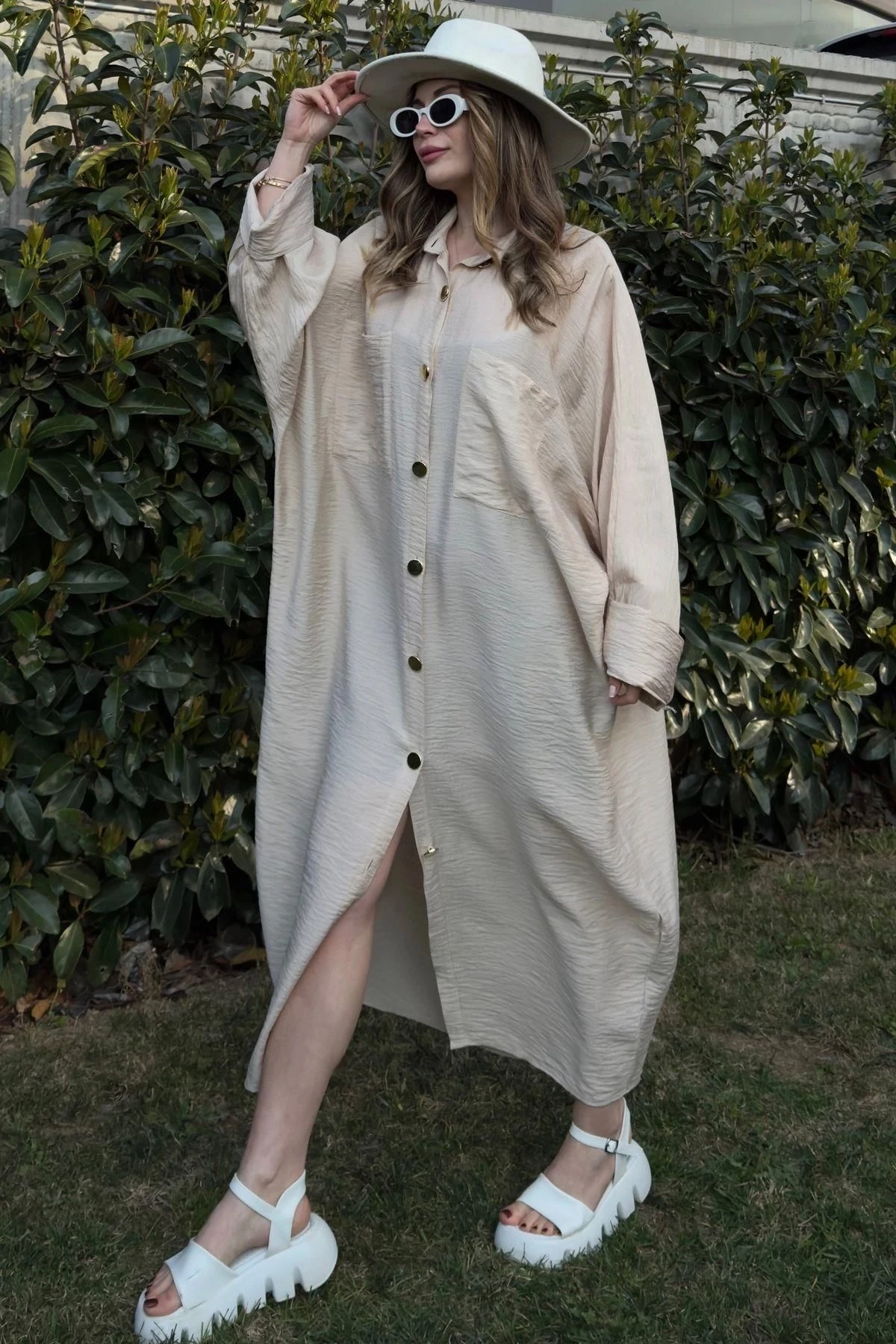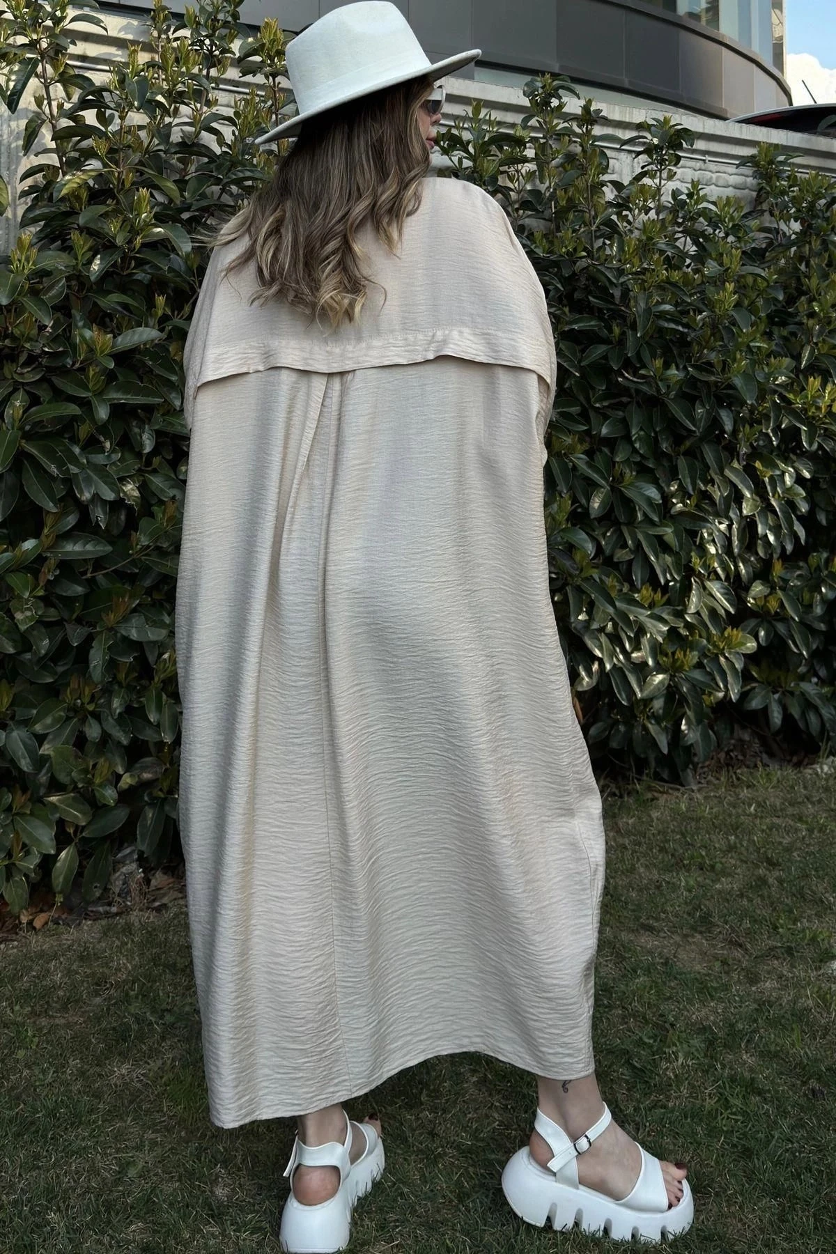 Kadın Bej Yarasa Kol, Arkası Pliseli, Çift Cepli, Uzun Oversize Salaş Gömlek Elbise