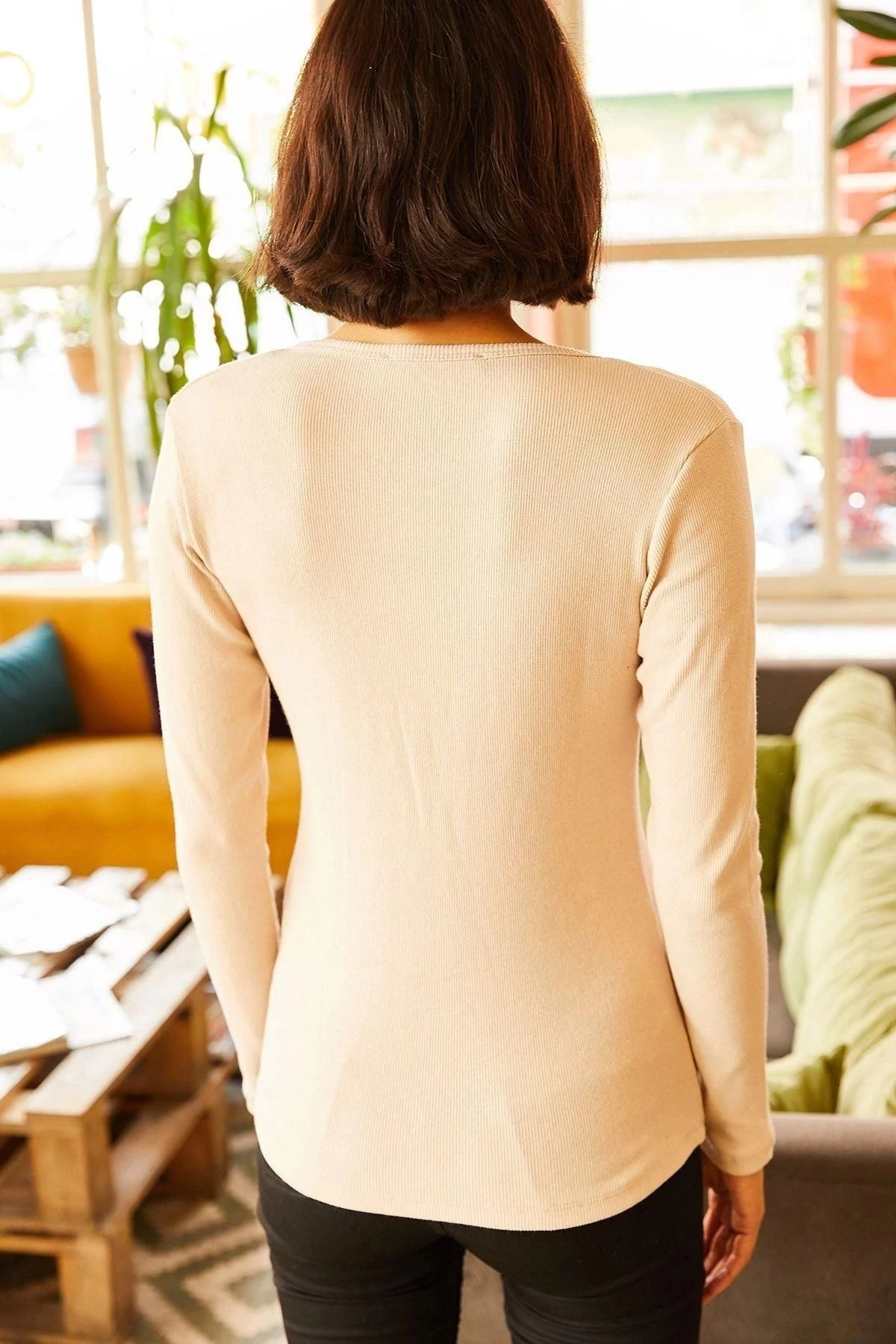 Kadın Bej Yarım Patlı Uzun Kollu Kaşkorse Bluz Geniş Yuvarlak Yaka ve Çıtçıtlı Detaylı