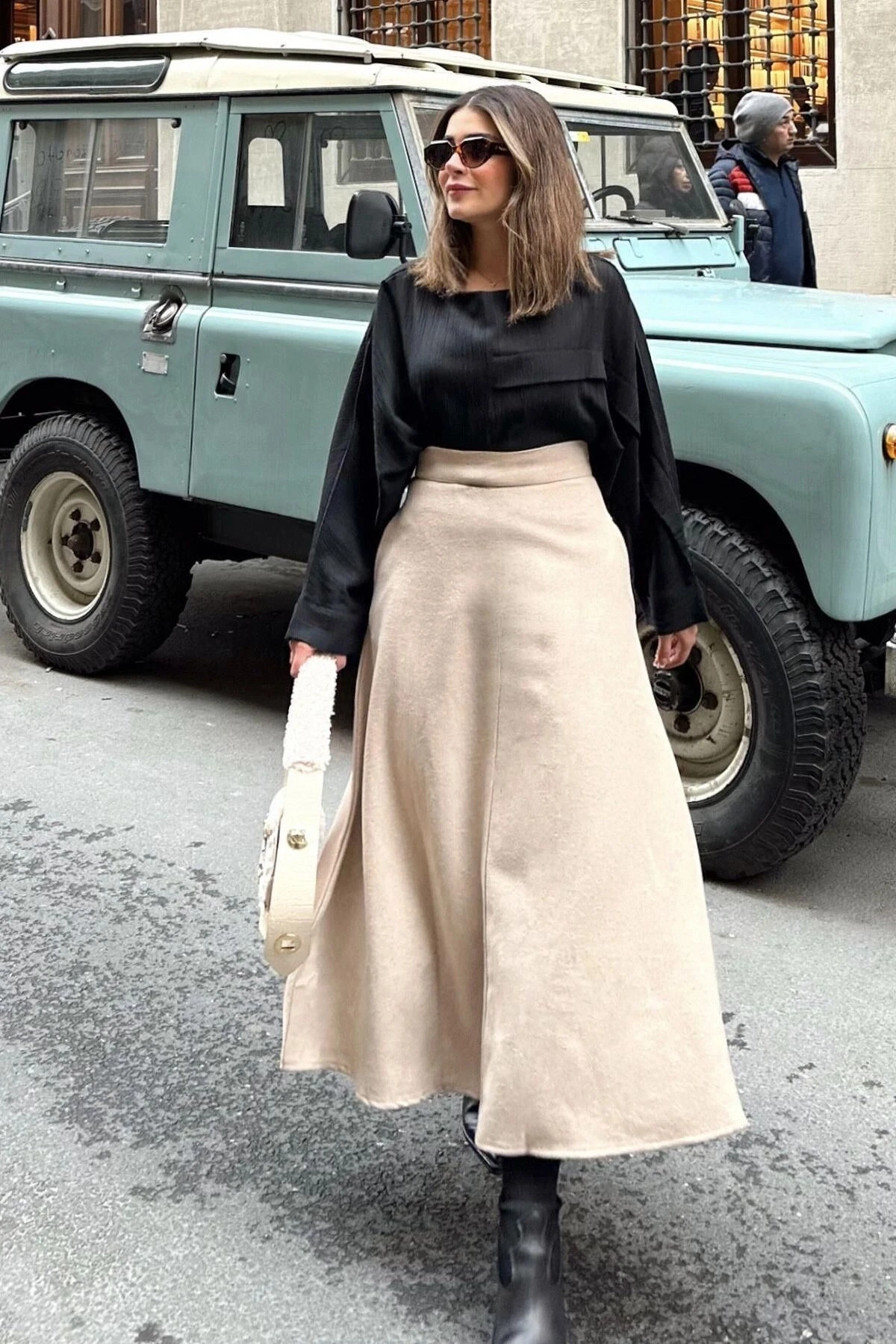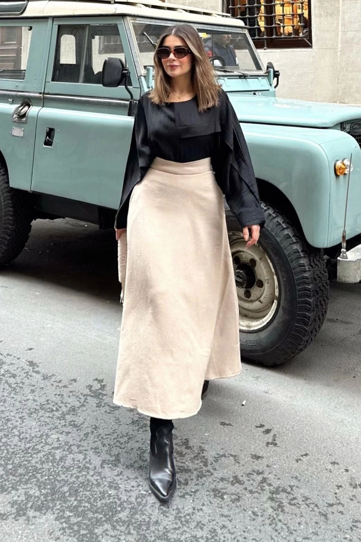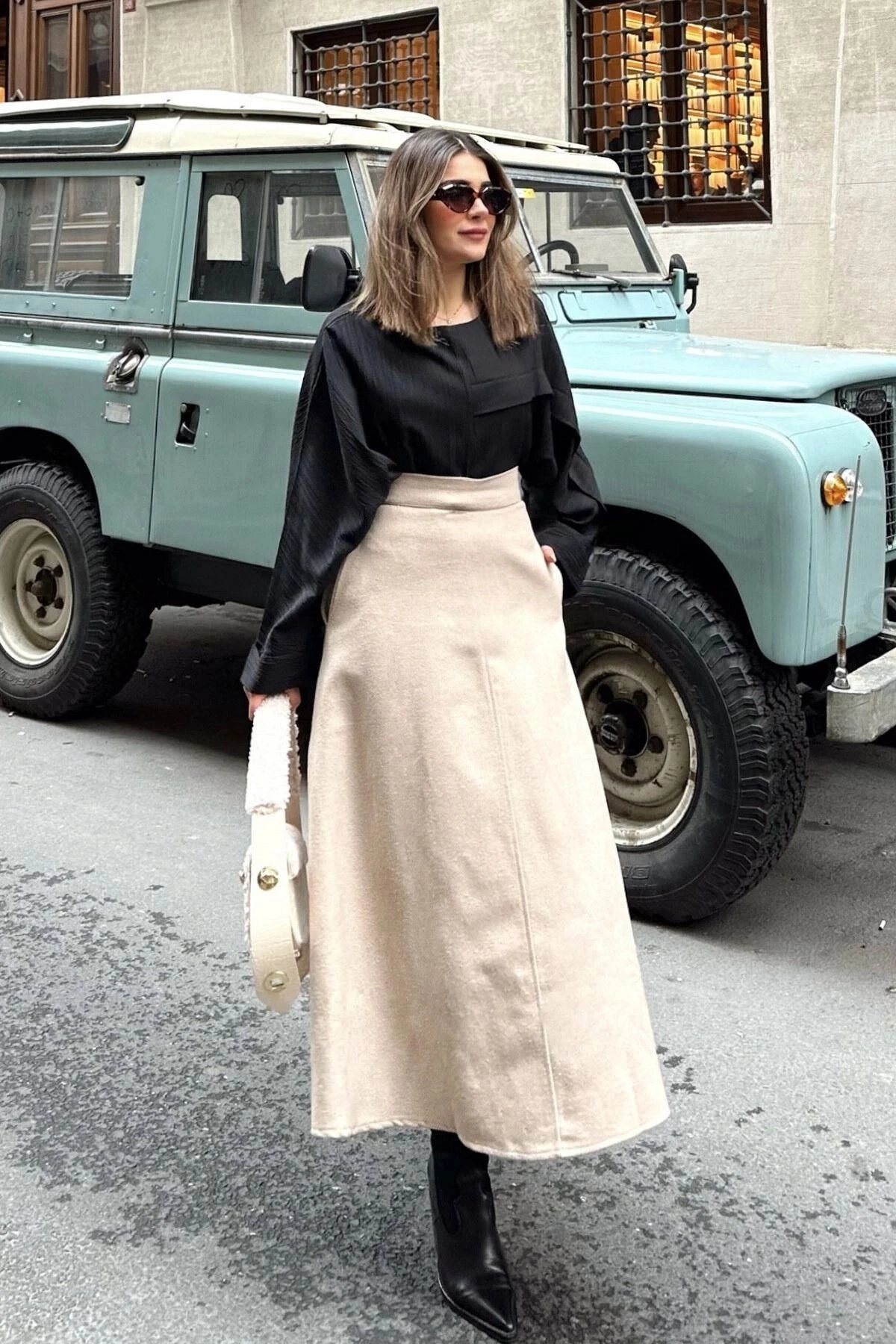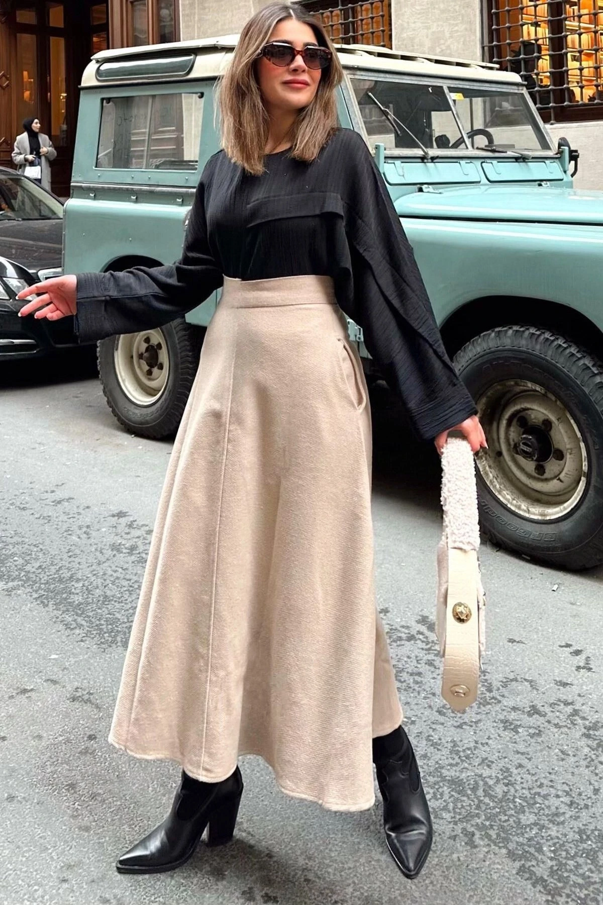 Kadın bej Yüksek Bel, Cepli, Uzun, Fitilli Kaşe Kumaş, Maksi Kiloş Etek (Dar Kalıp)
