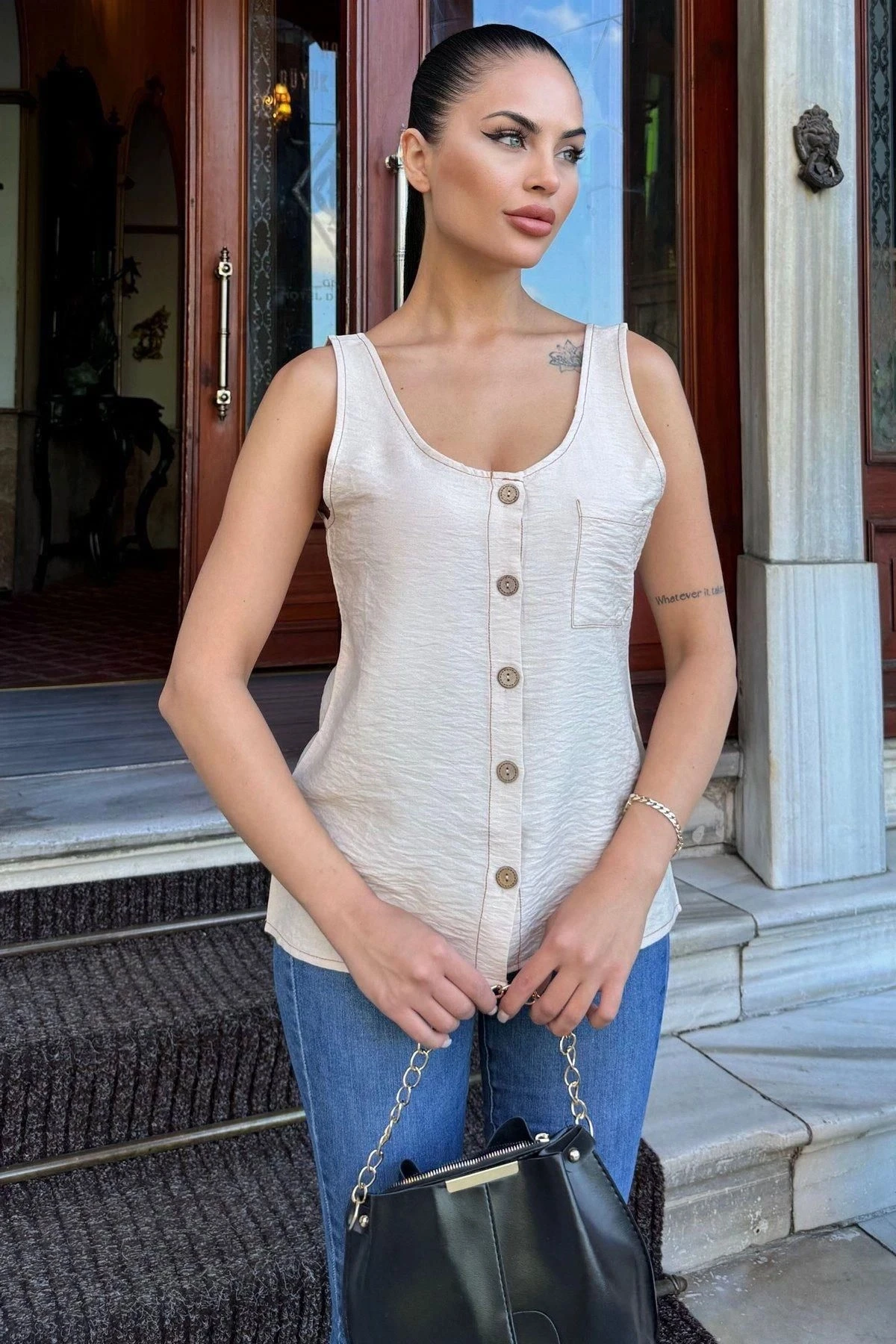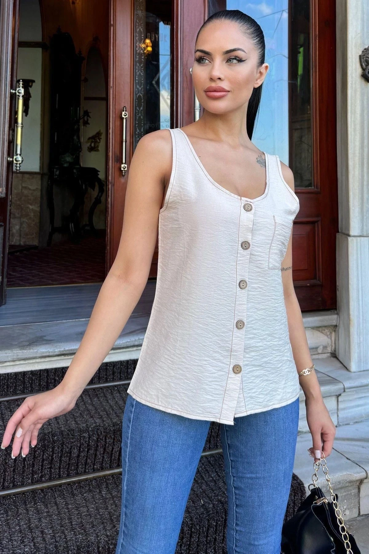 Kadın Bej Yuvarlak Yaka Ve Düğme Detaylı, Kalın Askılı Keten Atlet Bluz