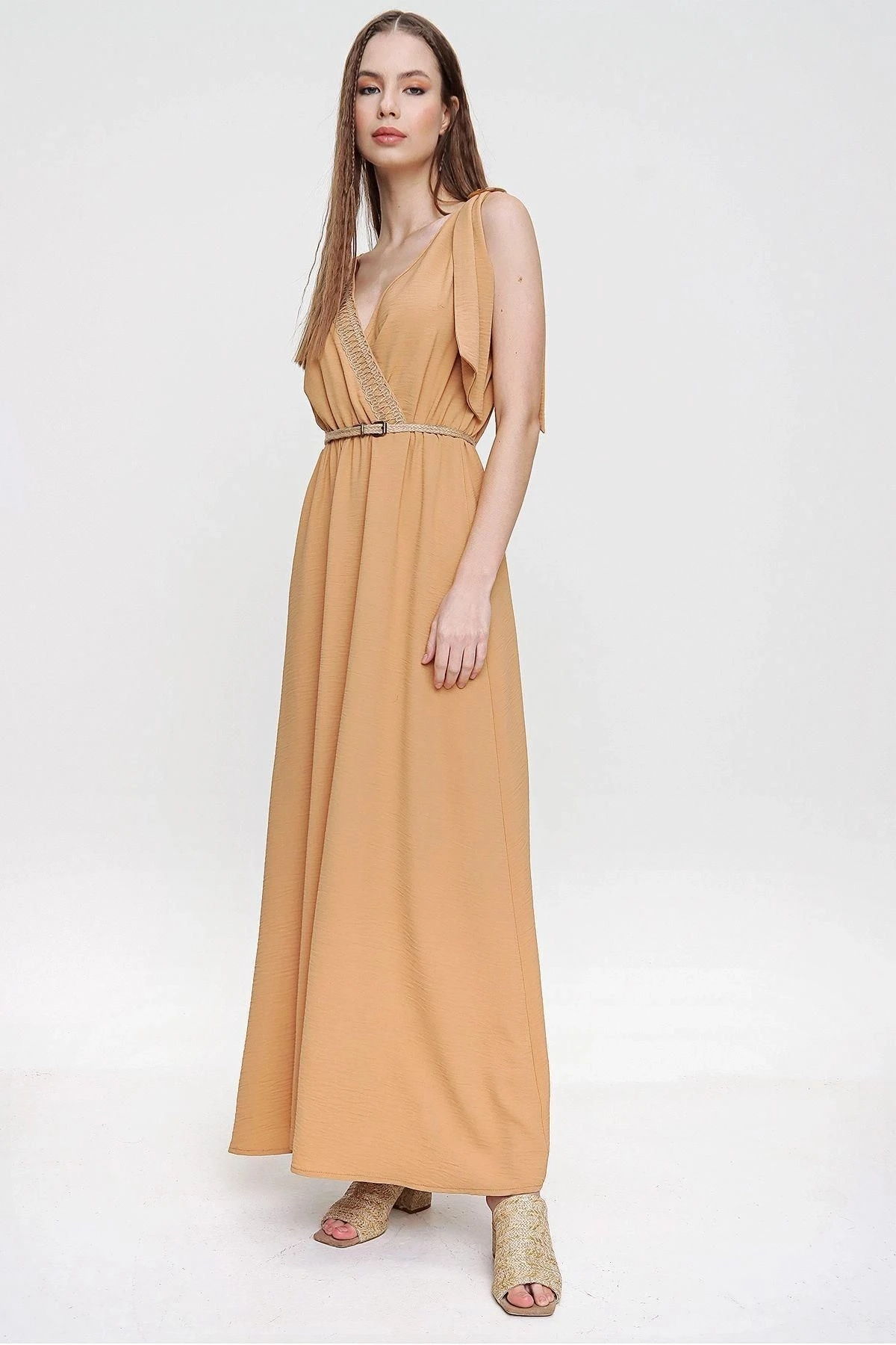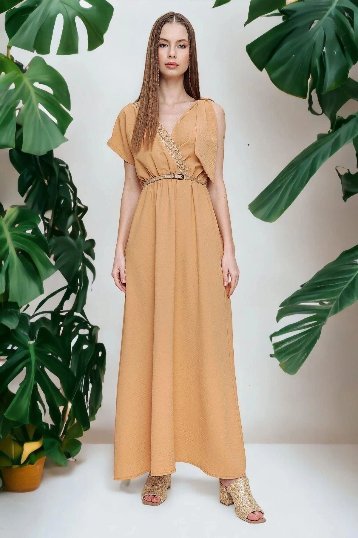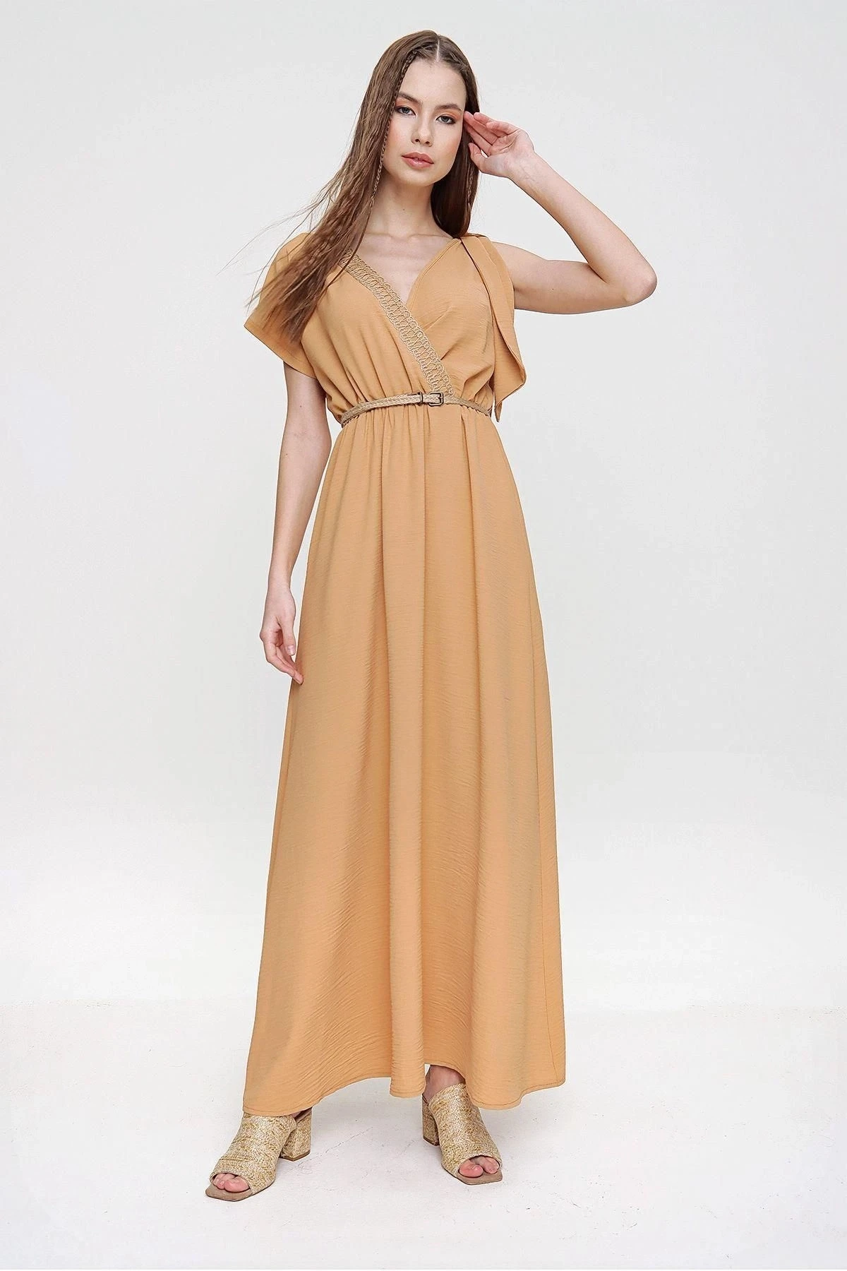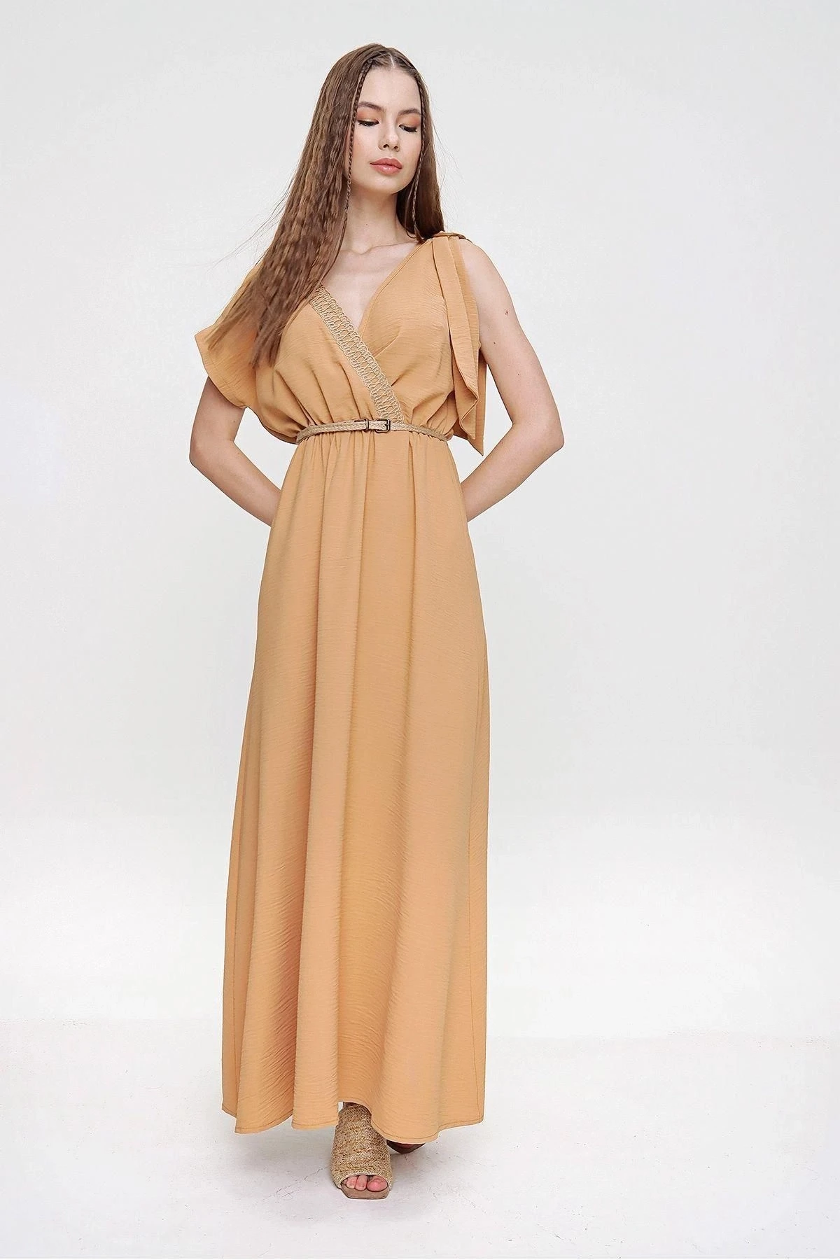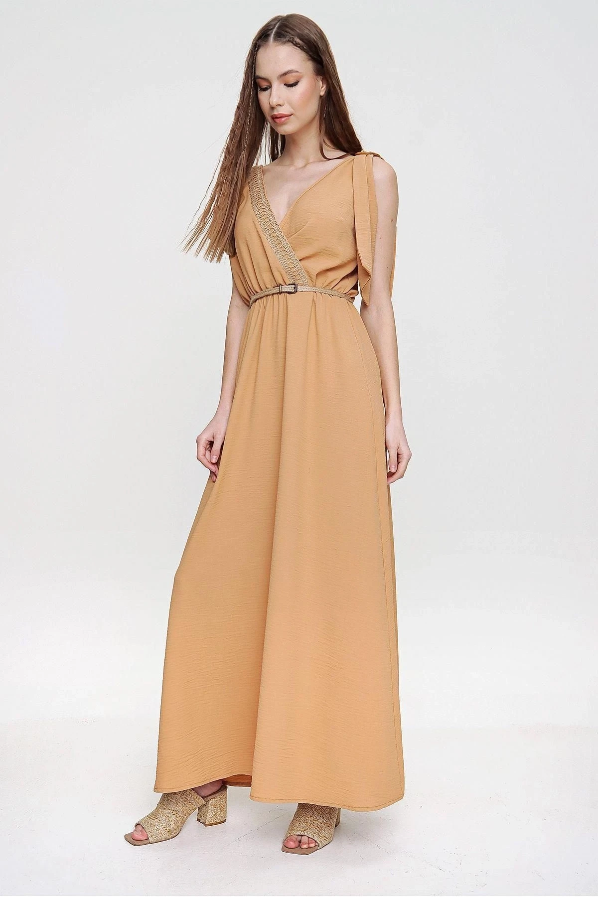 Bu şık ve rahat Airobin uzun elbise, özellikle günlük kullanım için mükemmel bir seçenektir.; Beli büzgülü detayıyla vücut hatlarınıza hoş bir vurgu yaparken, omuzlardaki hasır detaylarıyla da dikkat çekici bir görünüm elde edersiniz.; Elbisenin kumaş içeriği %60 polyester ve %40 pamuktan oluşur.; Bu malzeme kombinasyonu, dayanıklılık ve nefes alabilirlik sağlayarak hem konforlu hem de uzun ömürlü bir kullanım sunar.; Aynı zamanda kolay bakım özelliği sayesinde elbisenin temizliği de oldukça pratiktir.; Elbisenin bej rengi, zamansız ve şık bir seçimdir.; Bu nötr ton, herhangi bir duruma veya mevsime uyum sağlar ve çeşitli aksesuarlarla kolayca kombinlenebilir.; Bej rengi, sıcak ve samimi bir hava yaratırken, detaylarıyla da özgün bir tarz sunar.; Kruvaze kesim ve salaş tasarımıyla, bu elbise modern ve ferah bir görünüm kazanır.; Sırt ve göğüs kısmındaki hasır dekoltesi ise zarif bir detaydır ve şıklığına şıklık katar.; Kısa kollu yapısı, elbiseyi daha hafif ve yazlık bir hale getirirken, maksi boyu da size zarif bir duruş sağlar.; Bu Bej Renk Hasır Detaylı Omzu Tokalı Beli Büzgülü Airobin Uzun Elbise, her gün giyebileceğiniz bir parça olarak gardırobunuzda öne çıkacak.; Şıklık, rahatlık ve tarzı bir arada sunan bu elbise, sizin için mükemmel bir seçenek olacaktır.