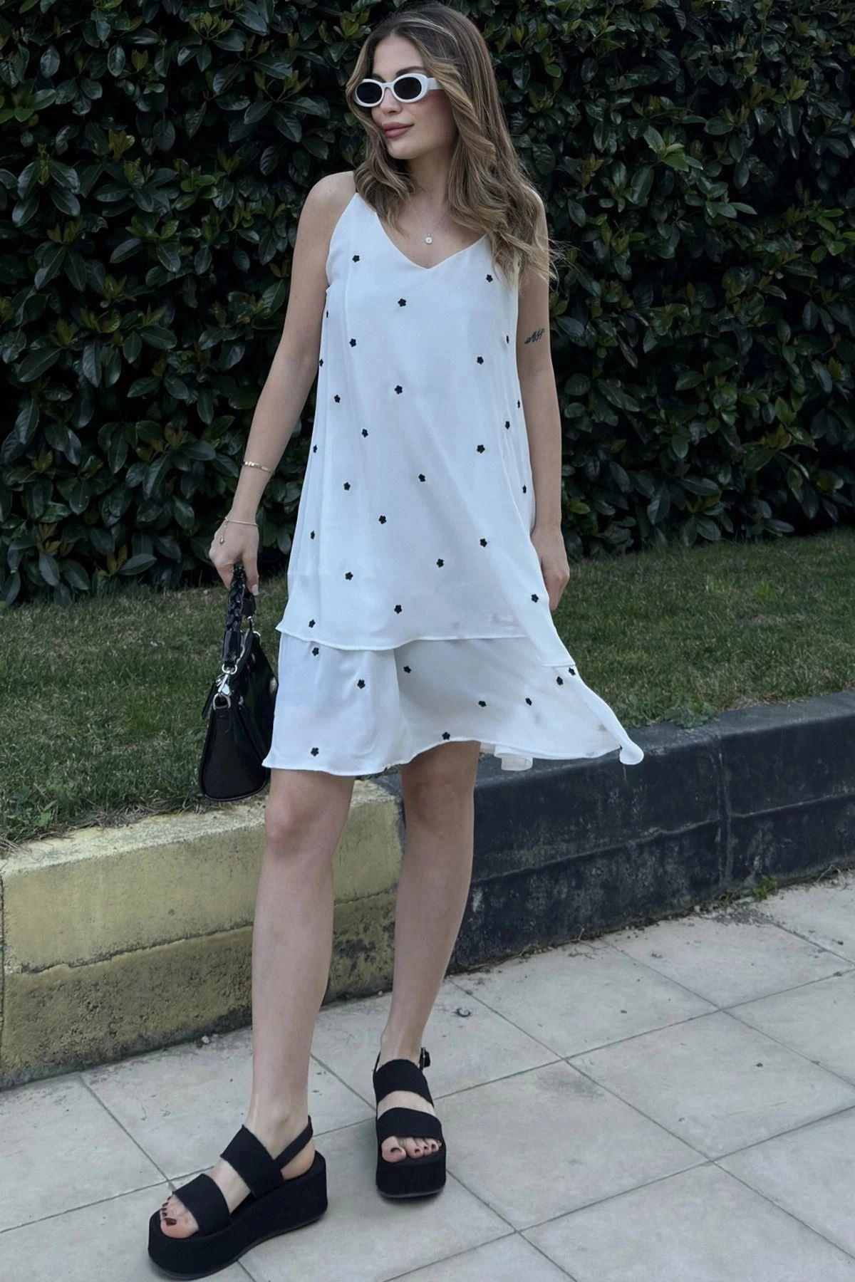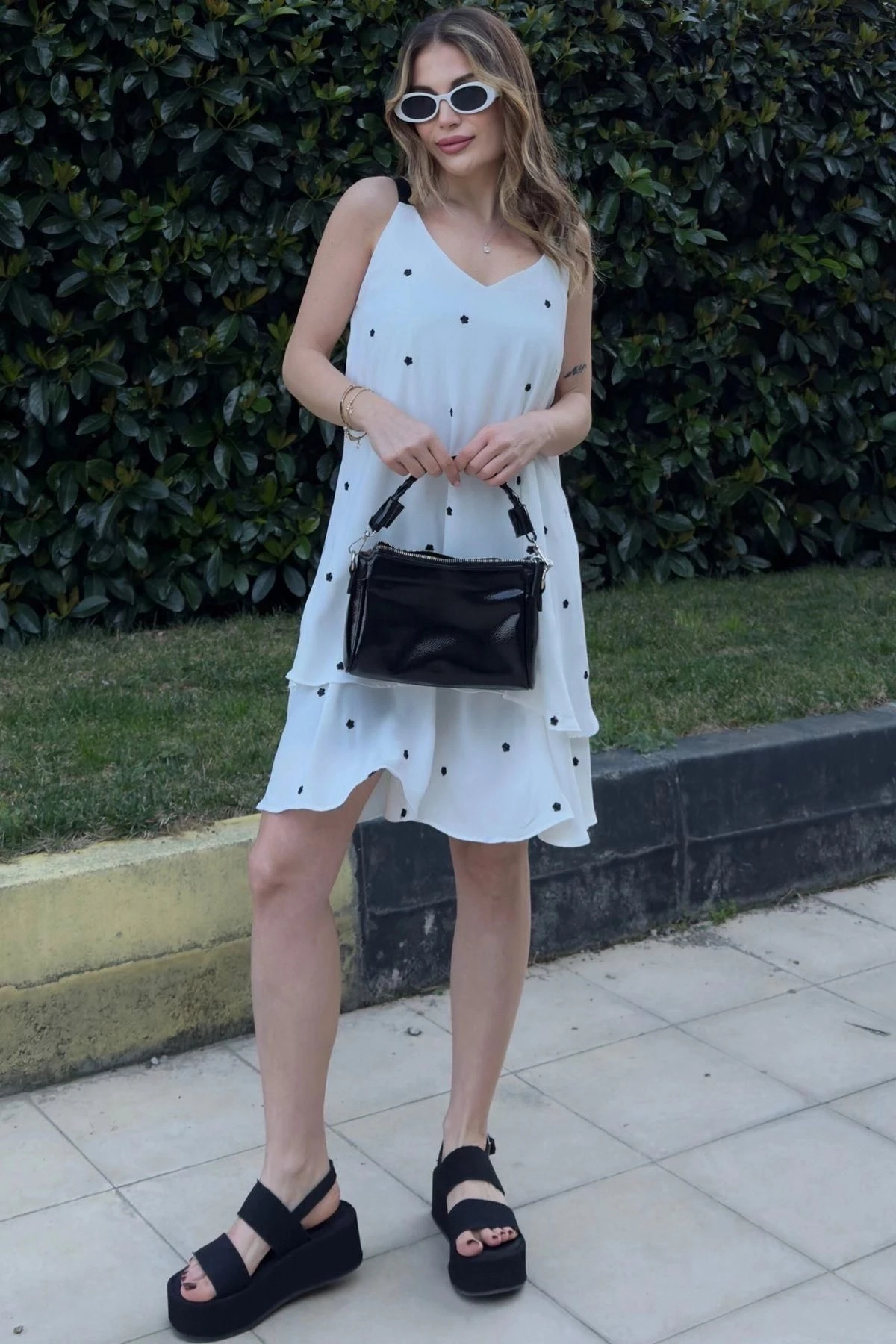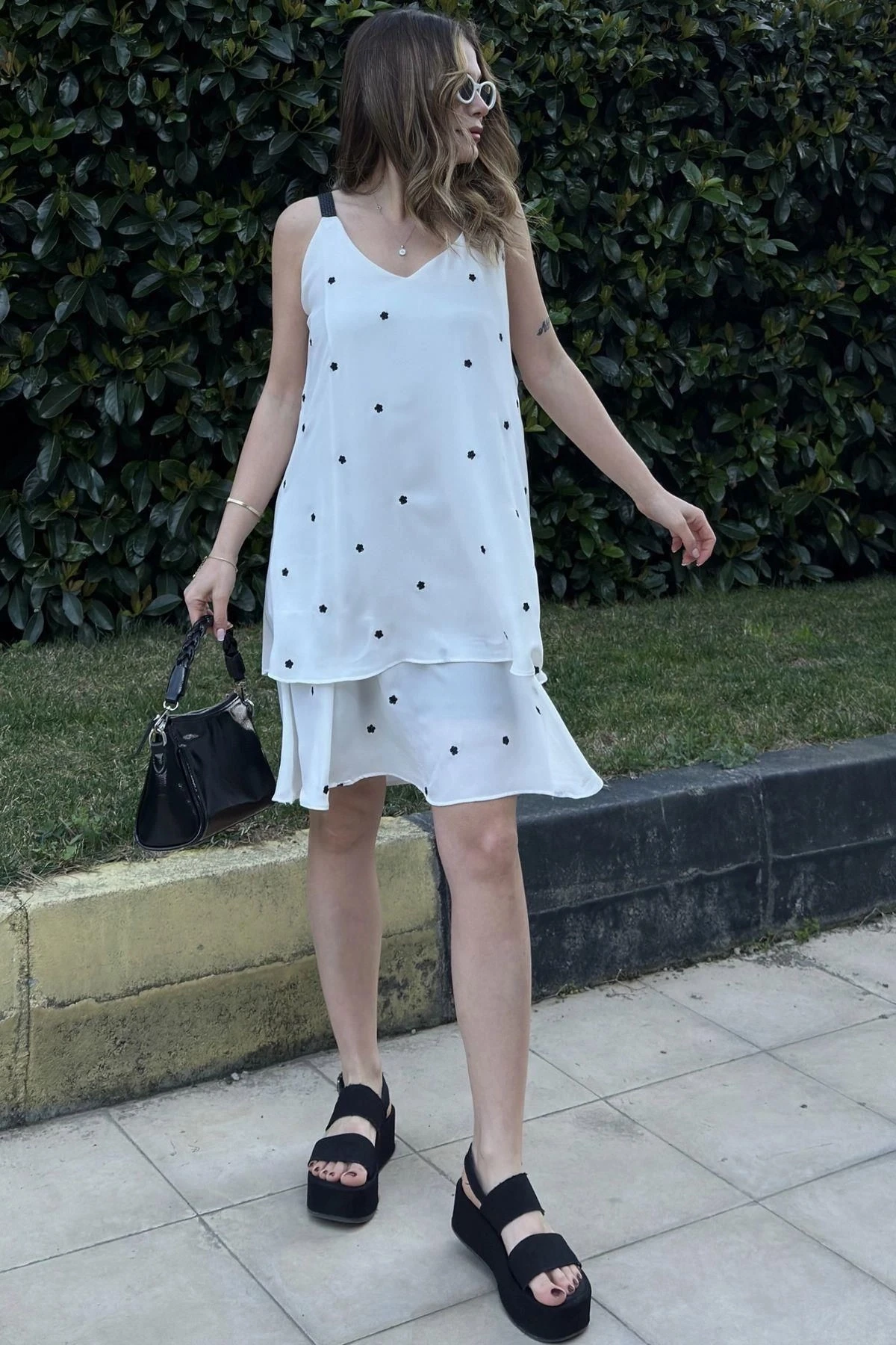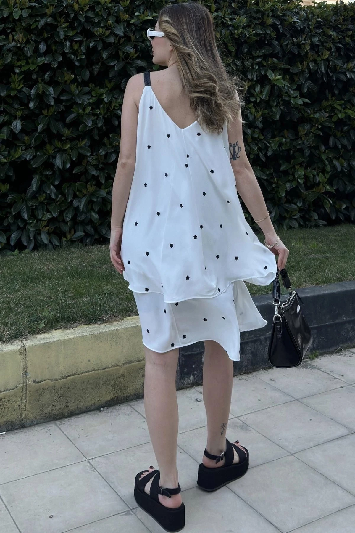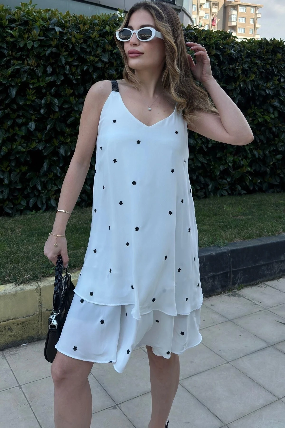 Kadın Beyaz A Kesim, Deri Askı Ve Çiçek Nakış Detaylı, Şifon Kumaş, Midi Kiloş Elbise