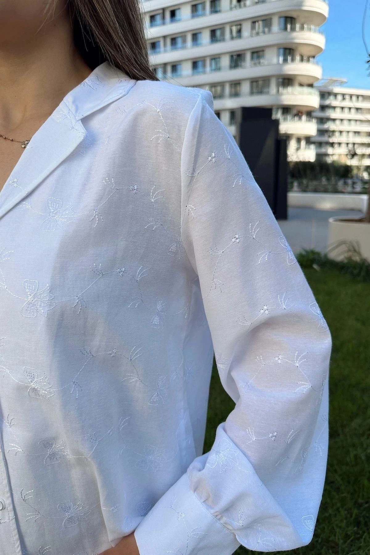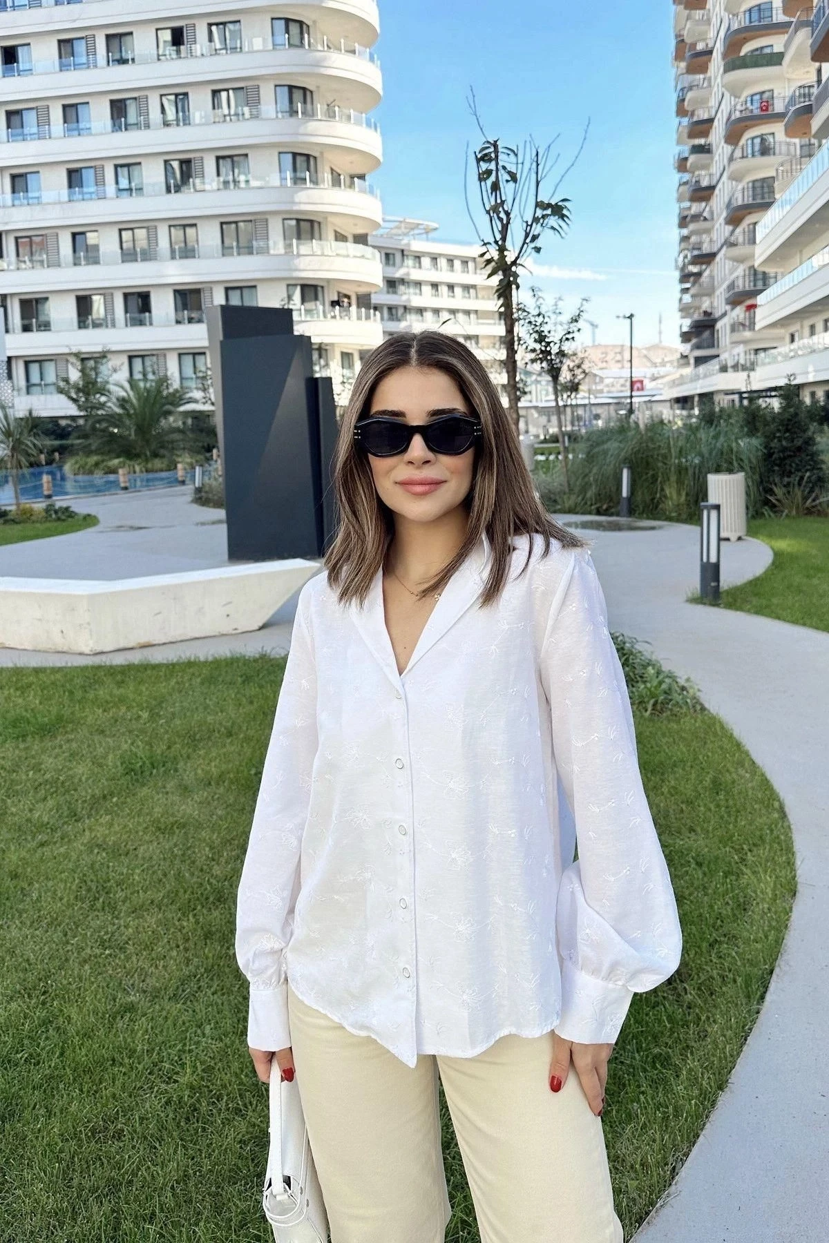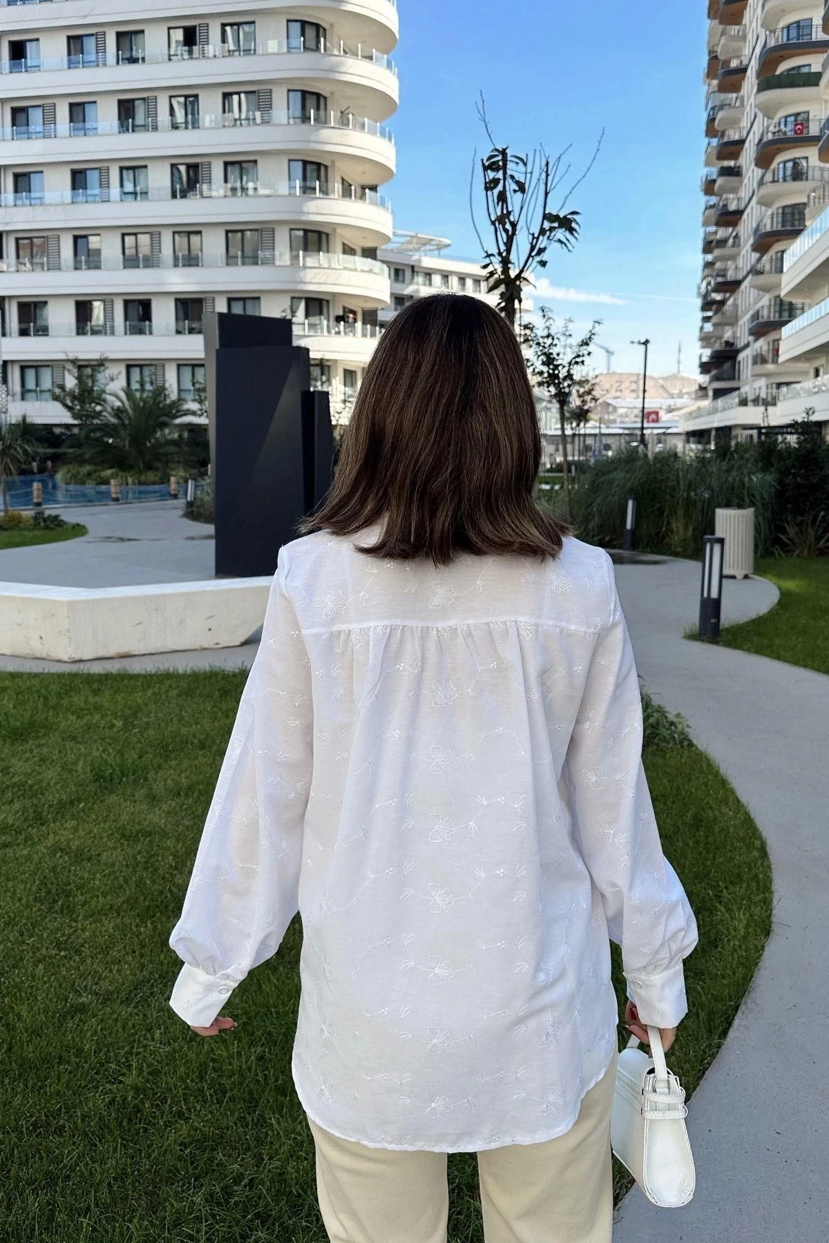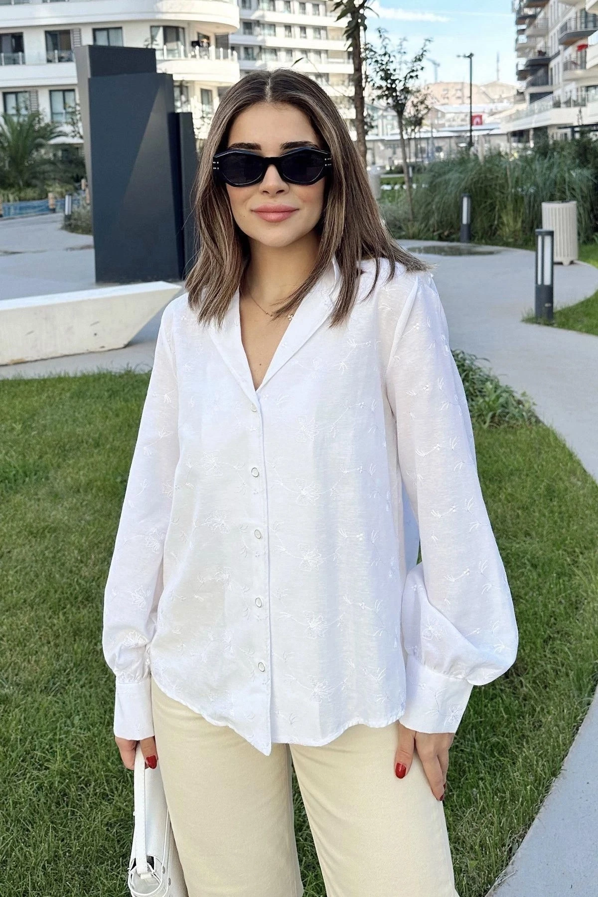 Kadın Beyaz Apaş Yaka, Uzun Balon Kol, Nakış İşlemeli Kumaş, Salaş Gömlek