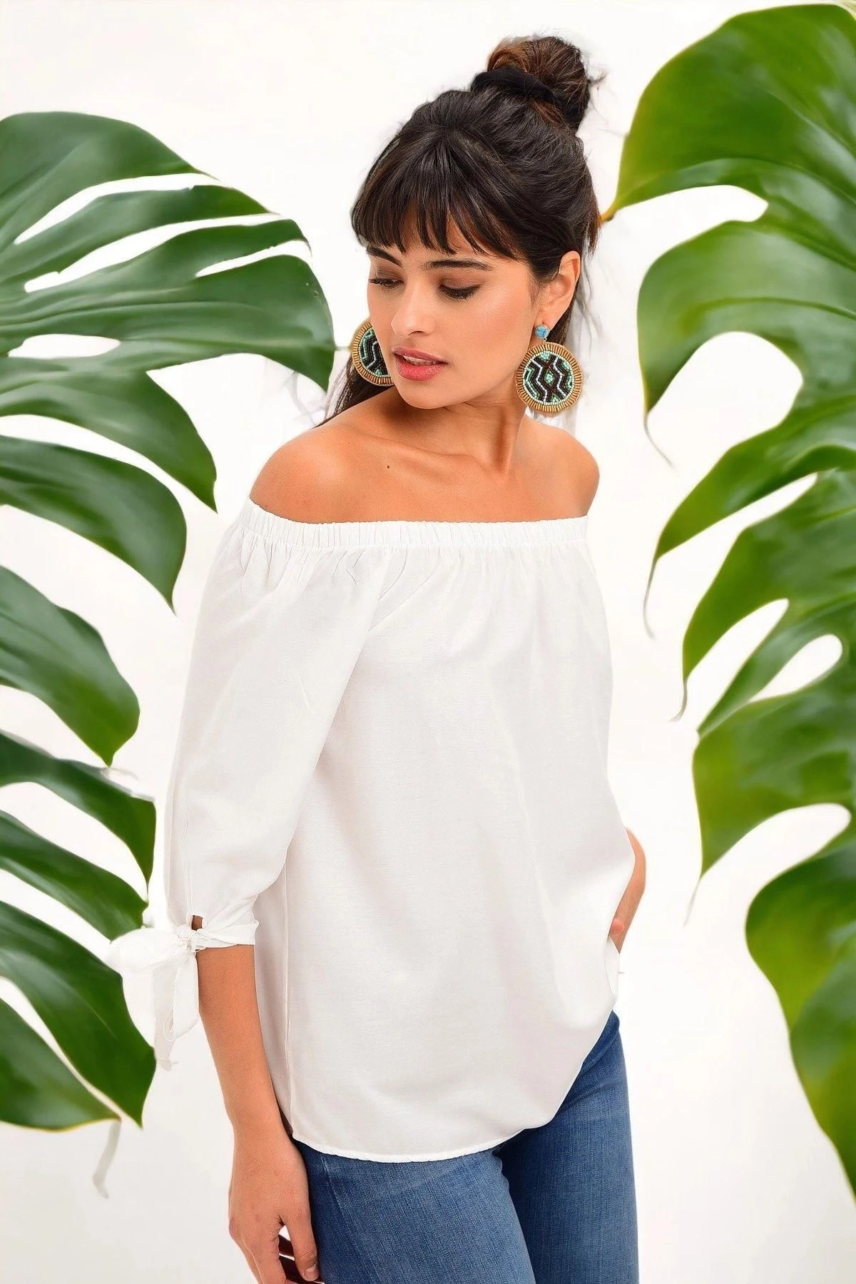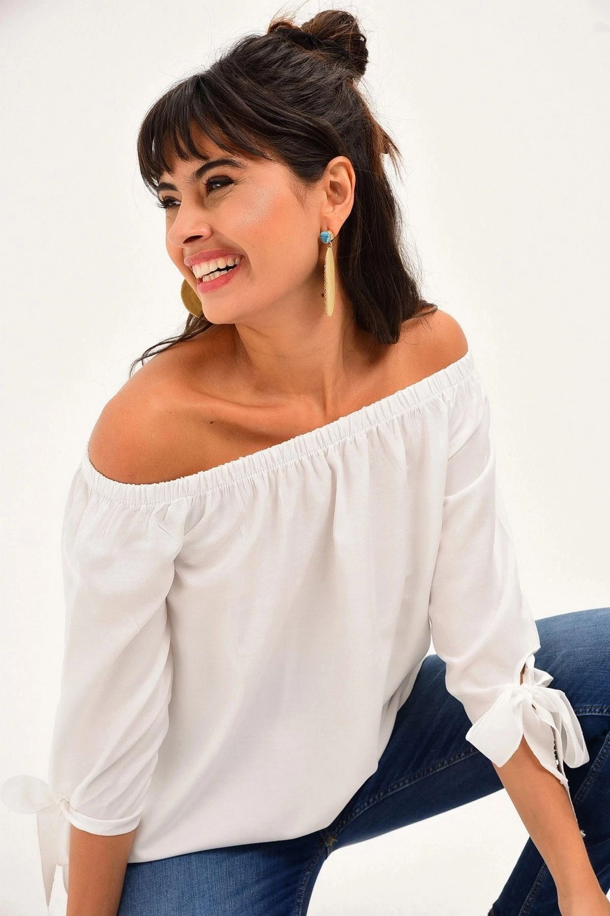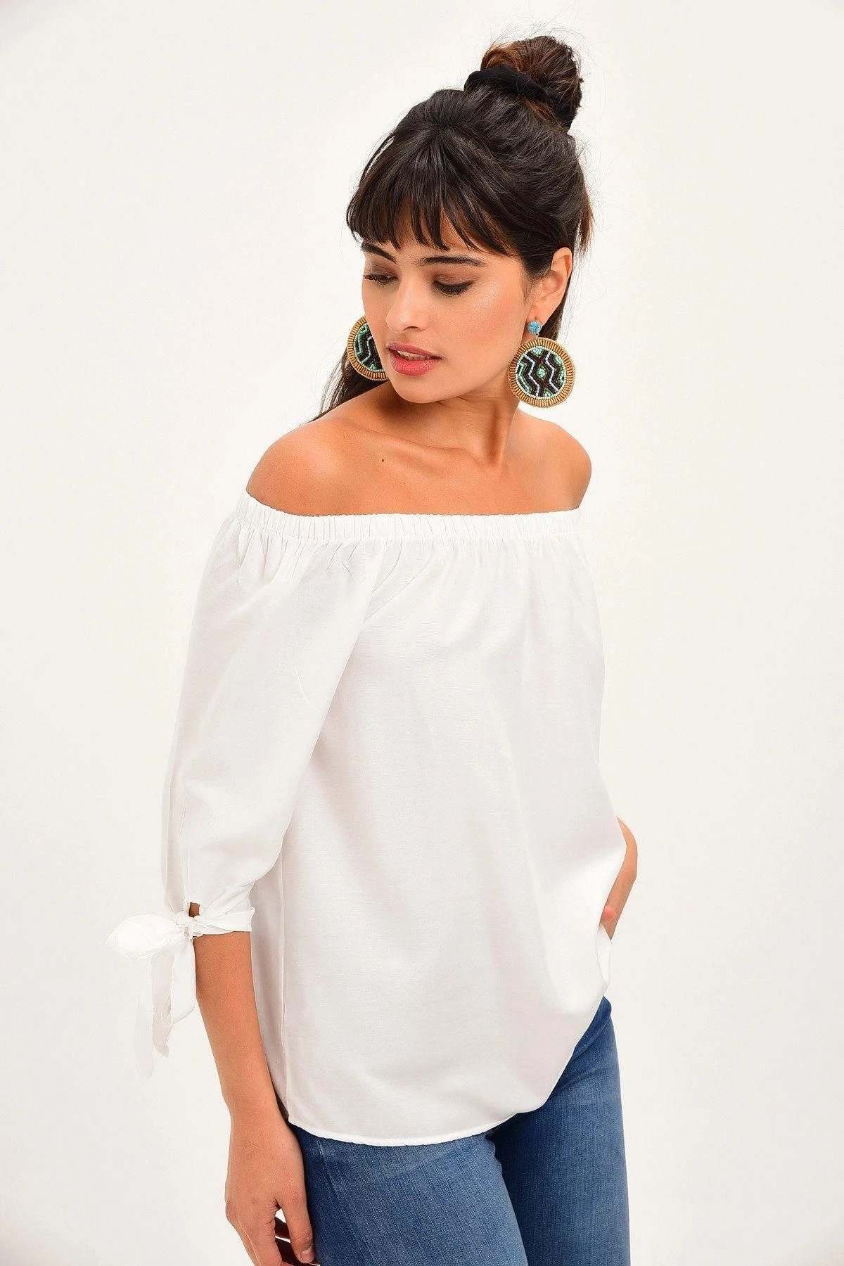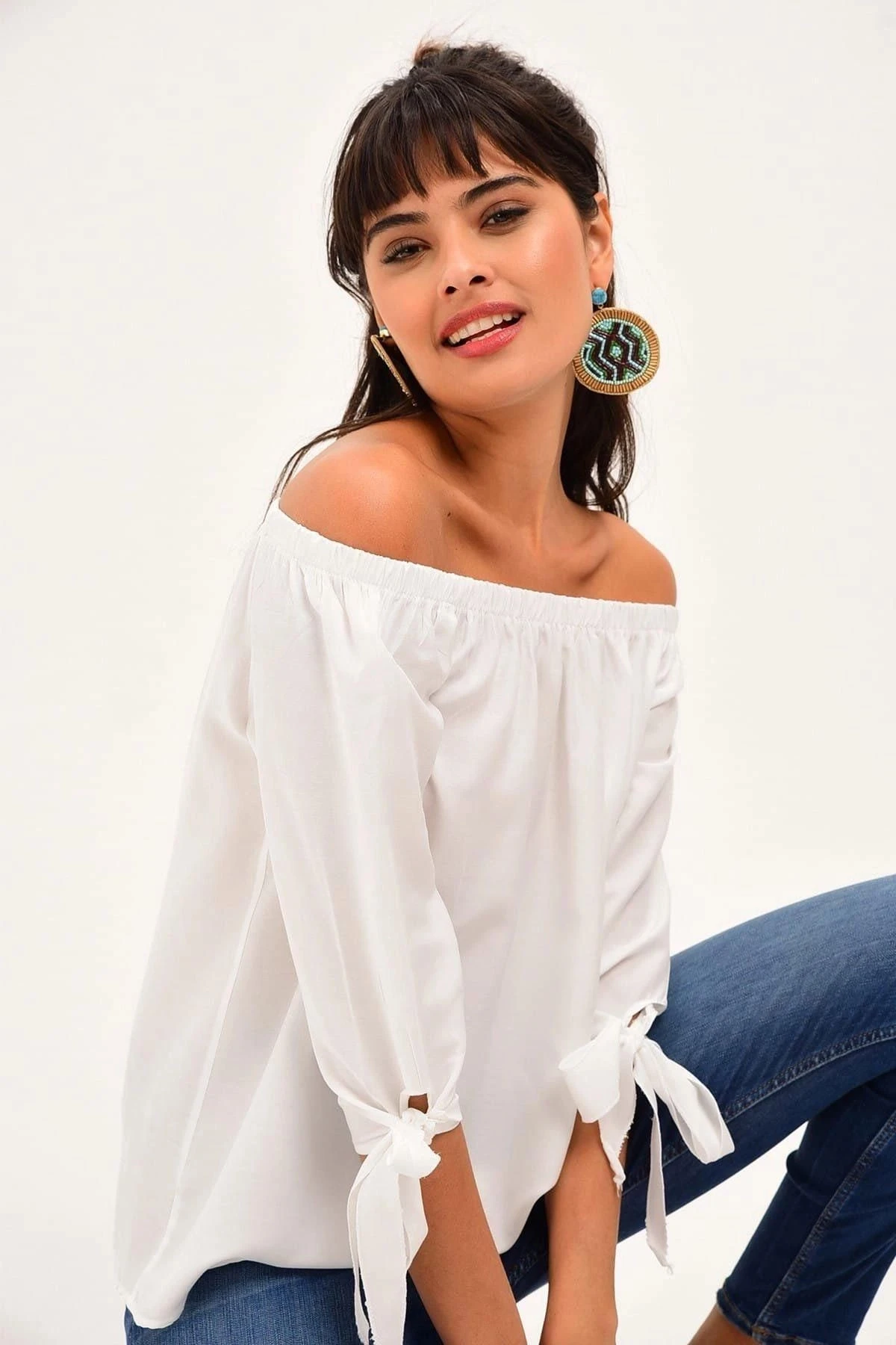 Bu beyaz renkli bluz, şık ve zarif bir görünüm sağlamak için tasarlanmıştır.; Bağcık detaylarıyla süslenmiş olan bu truvakar kol straplez yaka bluz, her türlü özel ve günlük kombinlerinizde şıklığı yakalamanıza yardımcı olacaktır.; Bluzun kumaş içeriği %80 pamuk ve %20 polyesterden oluşmaktadır.; Bu karışım, hem yumuşak ve rahat bir his sağlar, hem de dayanıklılığı artırır.; Pamuk, nefes alabilirlik özelliği sayesinde cildinizi rahat tutarken, polyester ise bluzun şeklini korumasına yardımcı olur.; Bluzun beyaz rengi, zamansız bir şıklık ve zarafet sunar.; Beyaz, her türlü mekanda ve her mevsimde kolaylıkla kombin yapabileceğiniz bir renktir.; Bu bluz, standart boyutlarda üretilmiştir ve genel olarak her bedene uyum sağlar.; Rahat ve esnek yapısı sayesinde vücut hatlarınıza hoş bir şekilde oturur ve hareket özgürlüğü sunar.; Truvakar kol detayları ve straplez yaka tasarımı, bu bluza farklı bir görünüm katar.; Straplez yaka, omuz ve dekolte bölgesini vurgulayarak feminen bir tarz sunarken, truvakar kollar da bluza modern bir dokunuş sağlar.; Bu bluz, herhangi bir özel gün, davet veya günlük giyim için mükemmel bir seçimdir.; Şıklığıyla sizi ön plana çıkaracak ve tarzınıza sofistike bir dokunuş katacaktır.