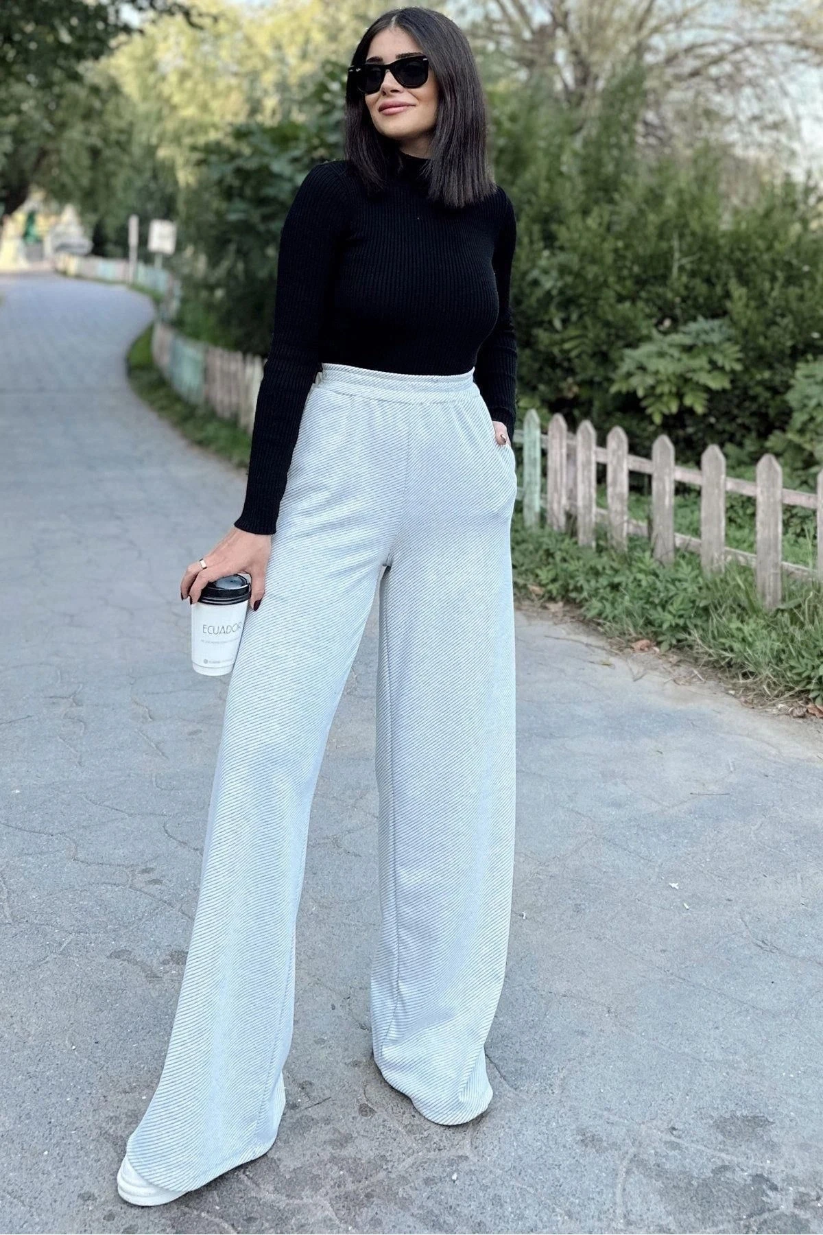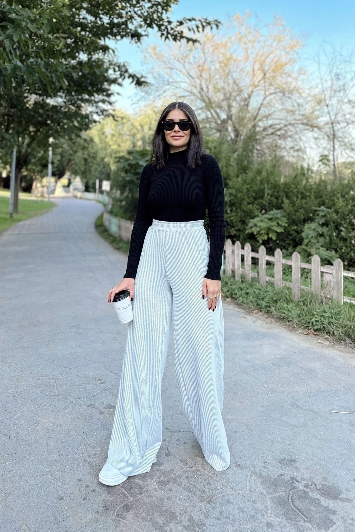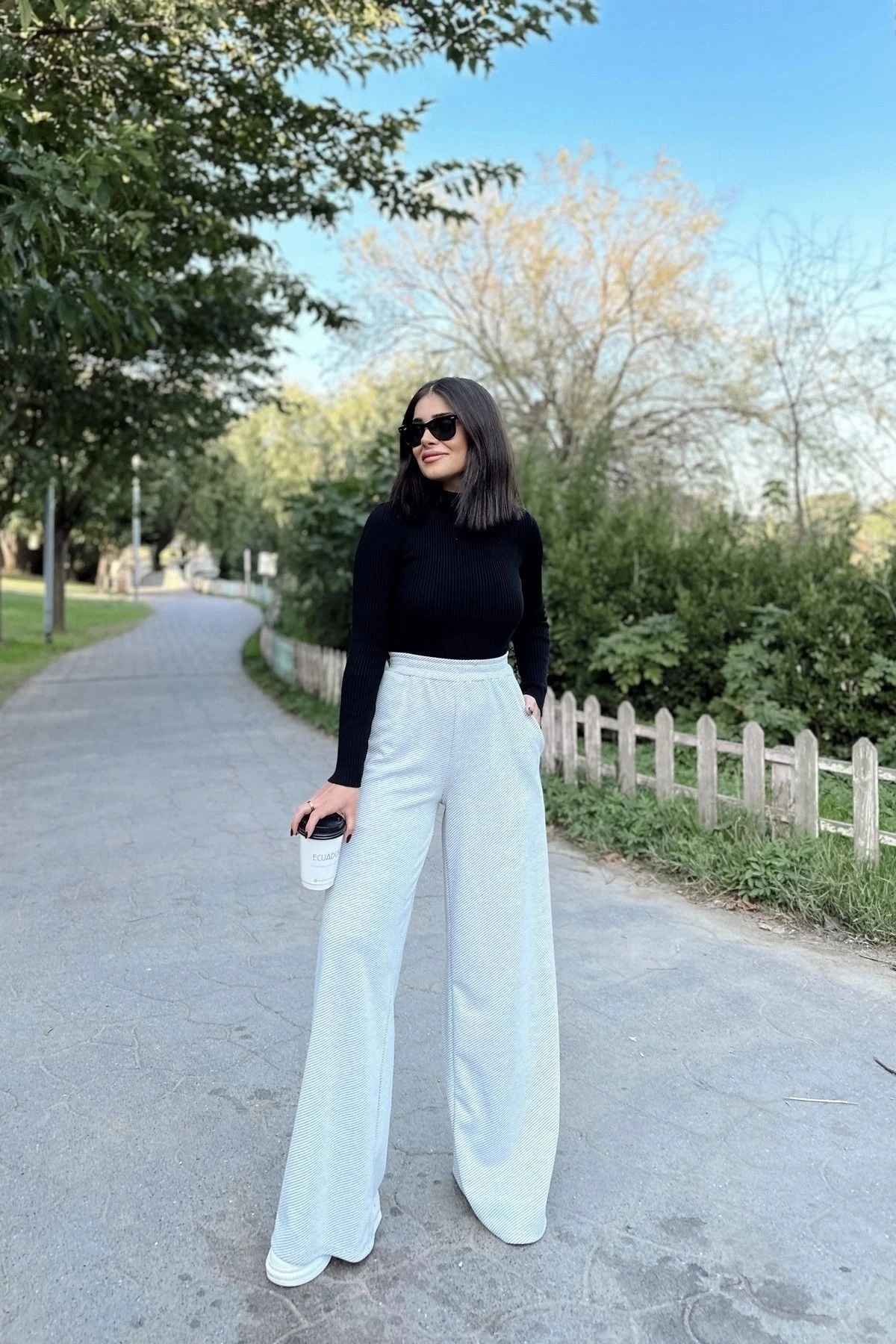 Kadın Beyaz Beli Lastikli, Cepli Örme Dokuma Kumaş, Bol Paça, Salaş Pantolon