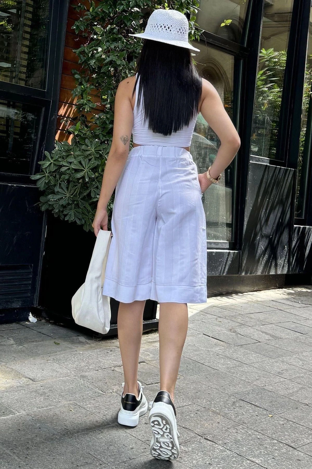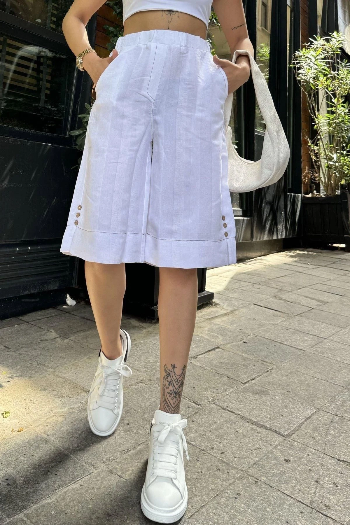 Kadın Beyaz Beli Lastikli Yanı Düğmeli Kendinden Dokulu Cepli Bermuda Şort