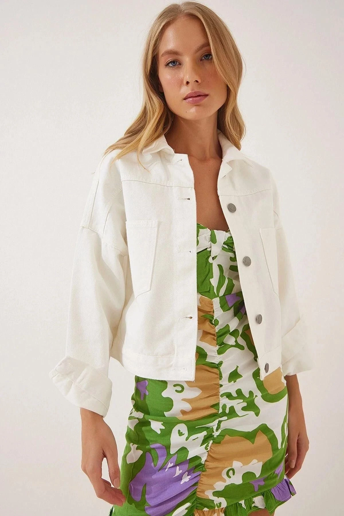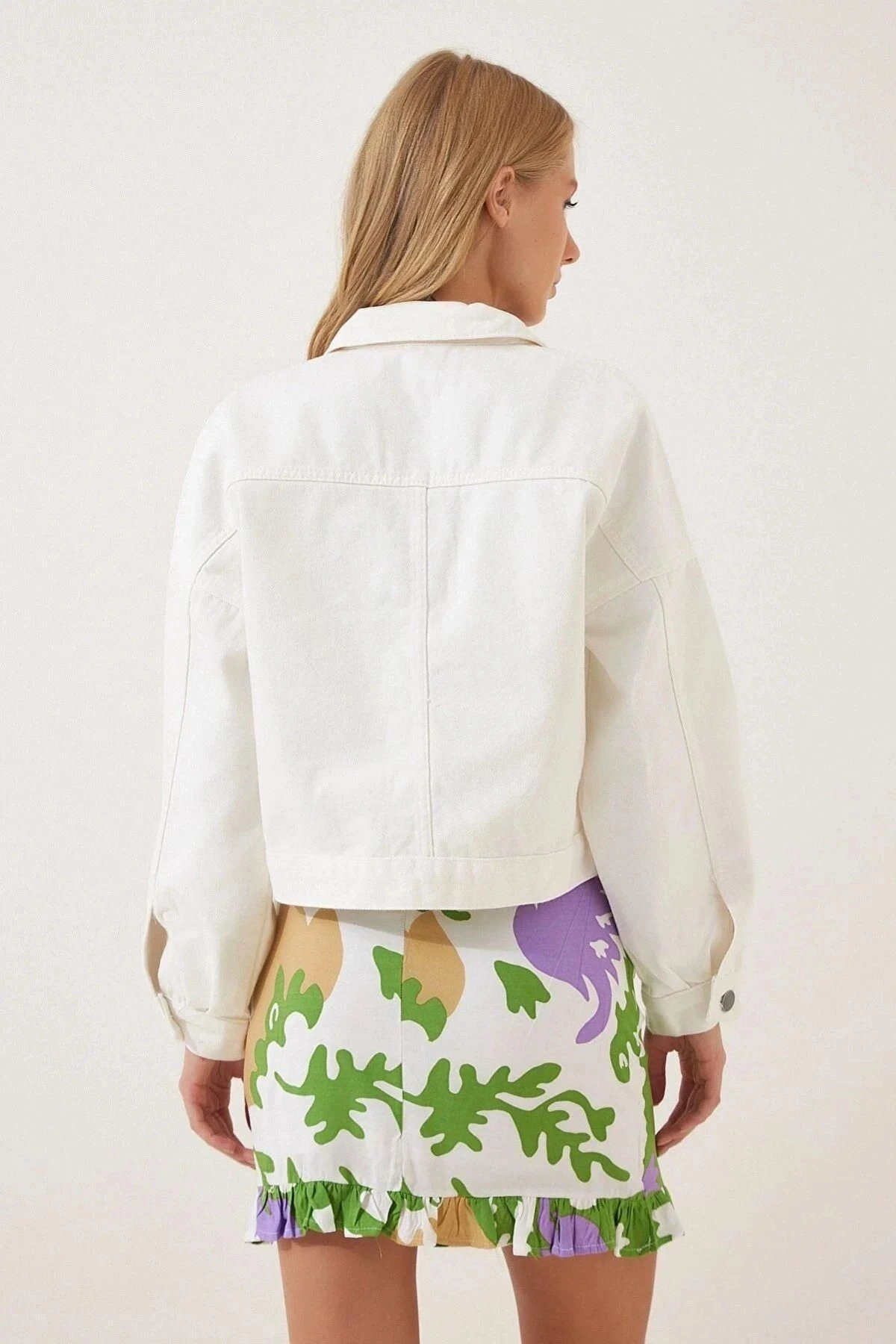 Kadın Beyaz Cep Detaylı Kot Jean Kot Kaliteli Kumaş Düz Kesim Uzun Kol Ceket