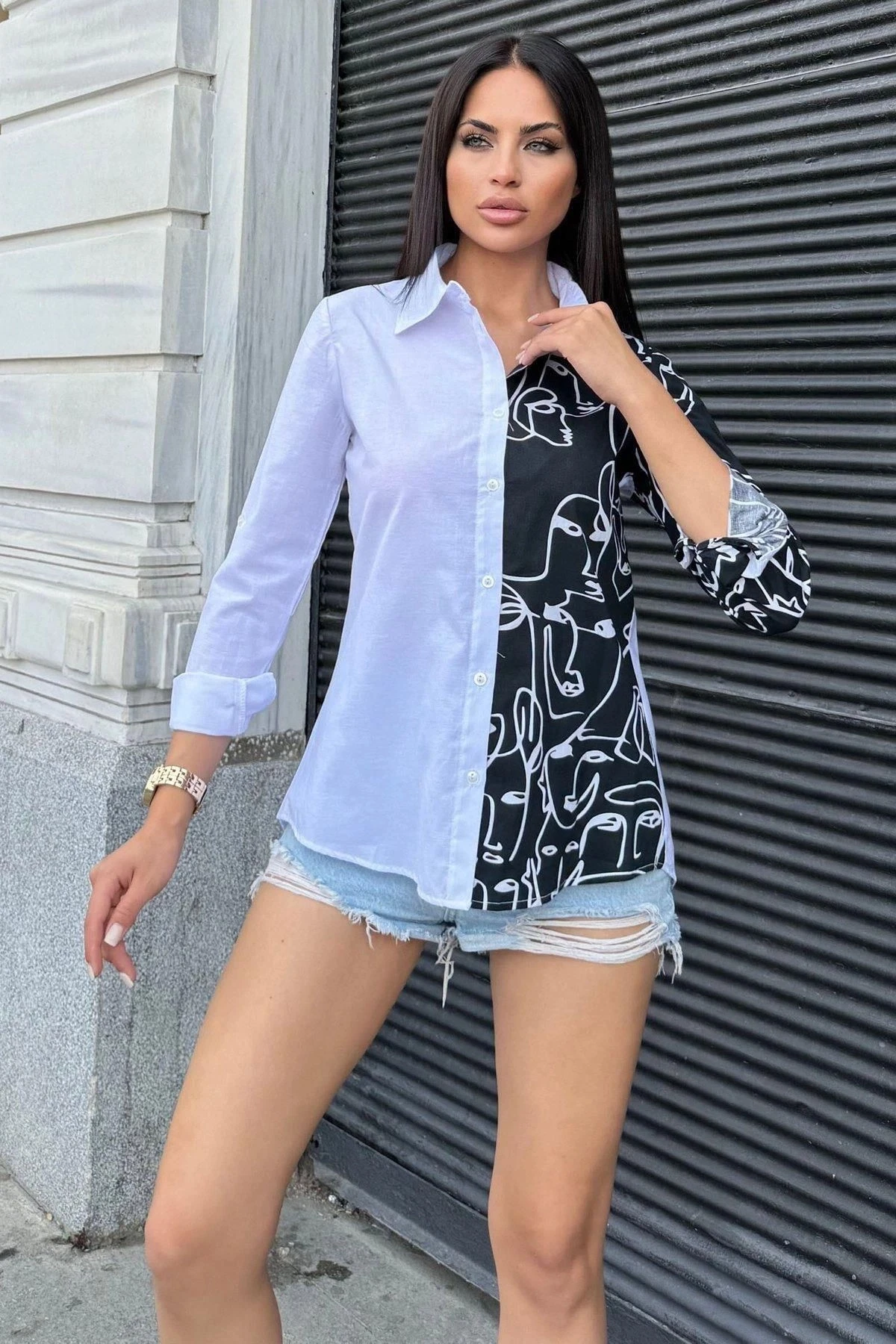 Kadın Beyaz Desenli İki Renkli Uzun Kol Regular Kesim Standart Boy Gömlek