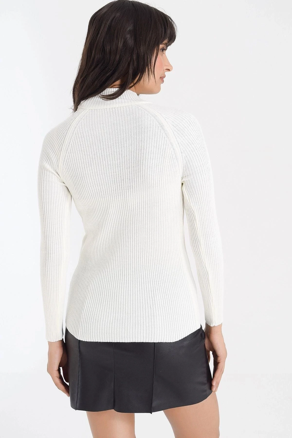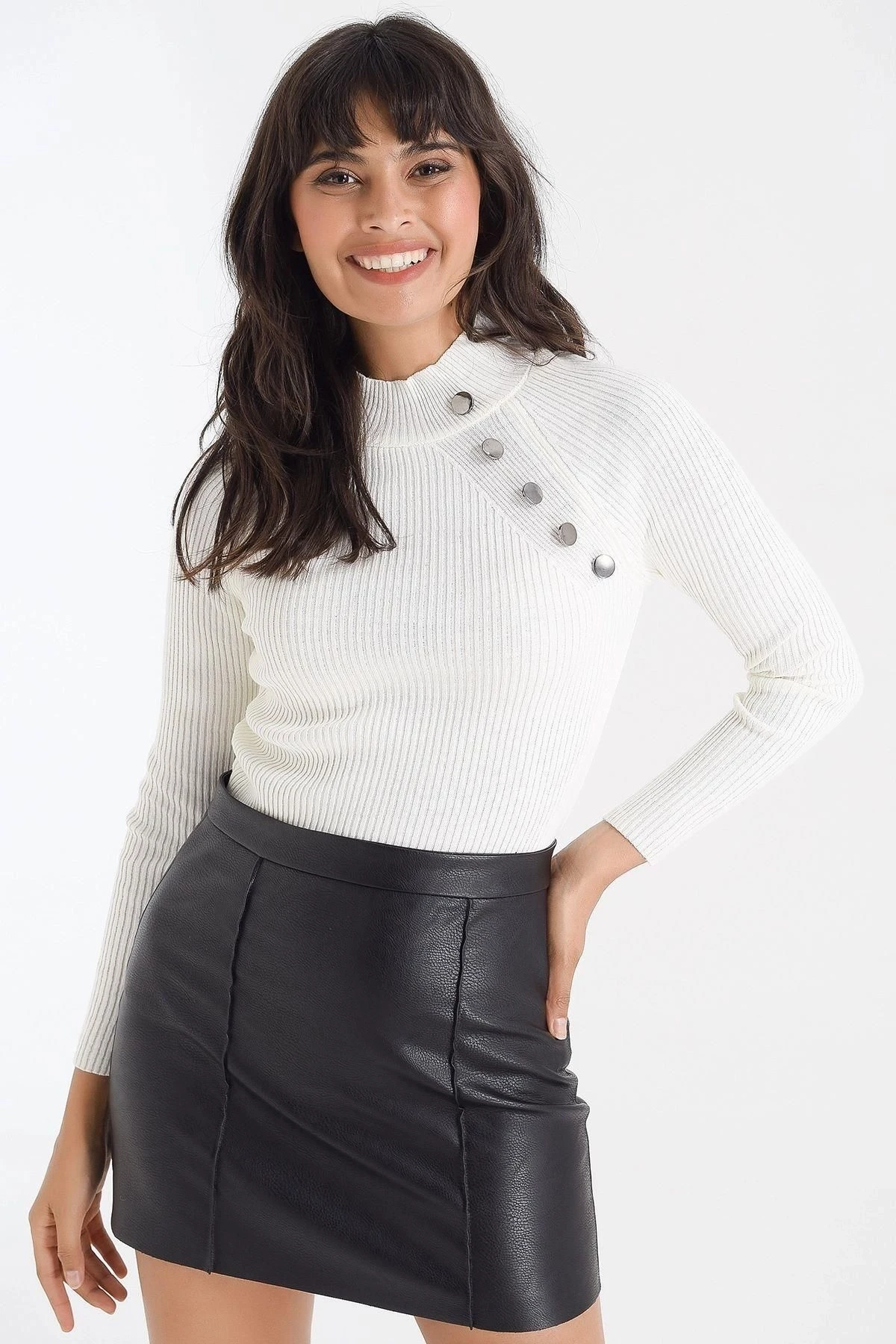 Kadın Beyaz Dik Yaka, Uzun Kollu, Düğme Detaylı, Kaliteli Kumaş Body, Fit Kesim, Standart Boy Triko