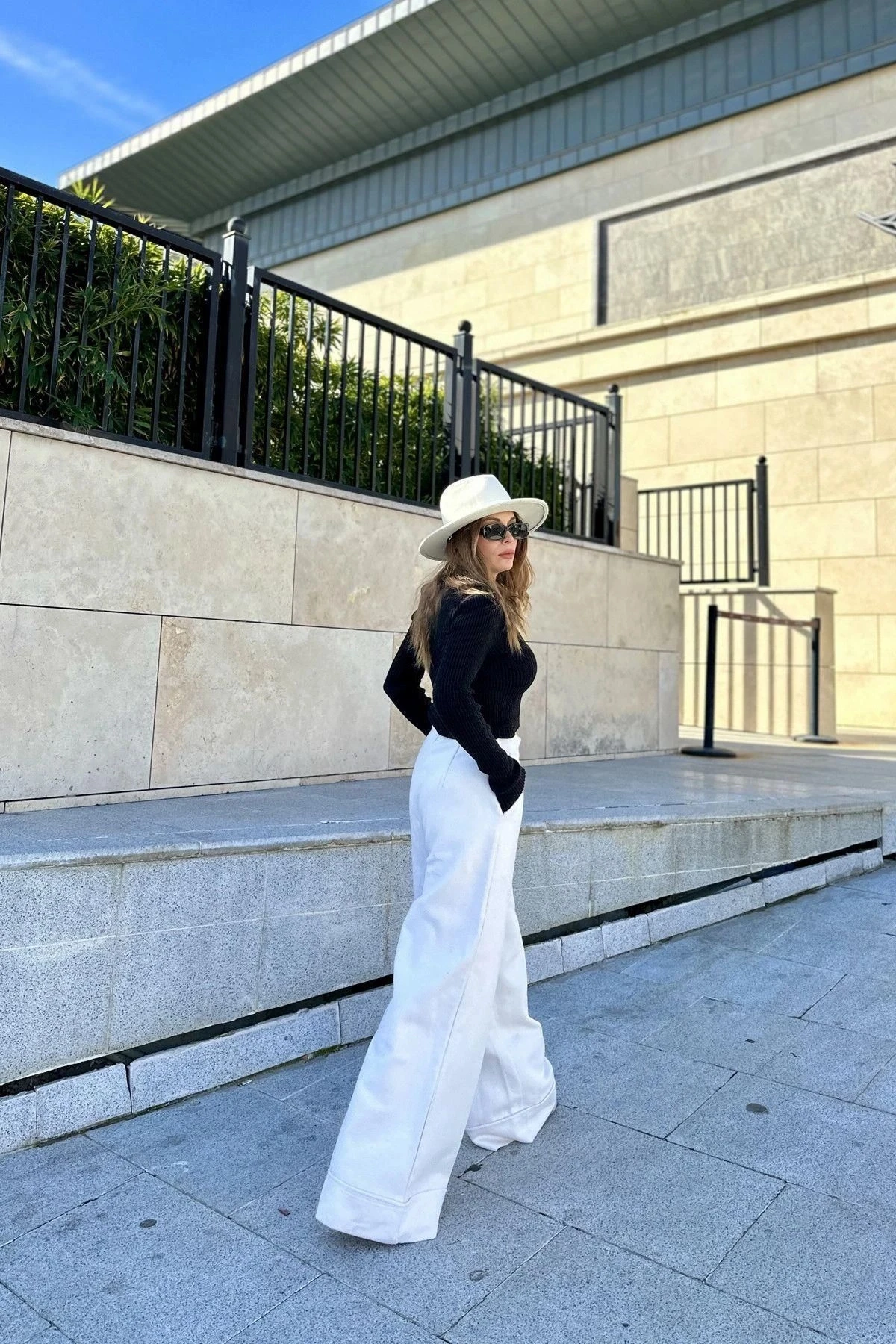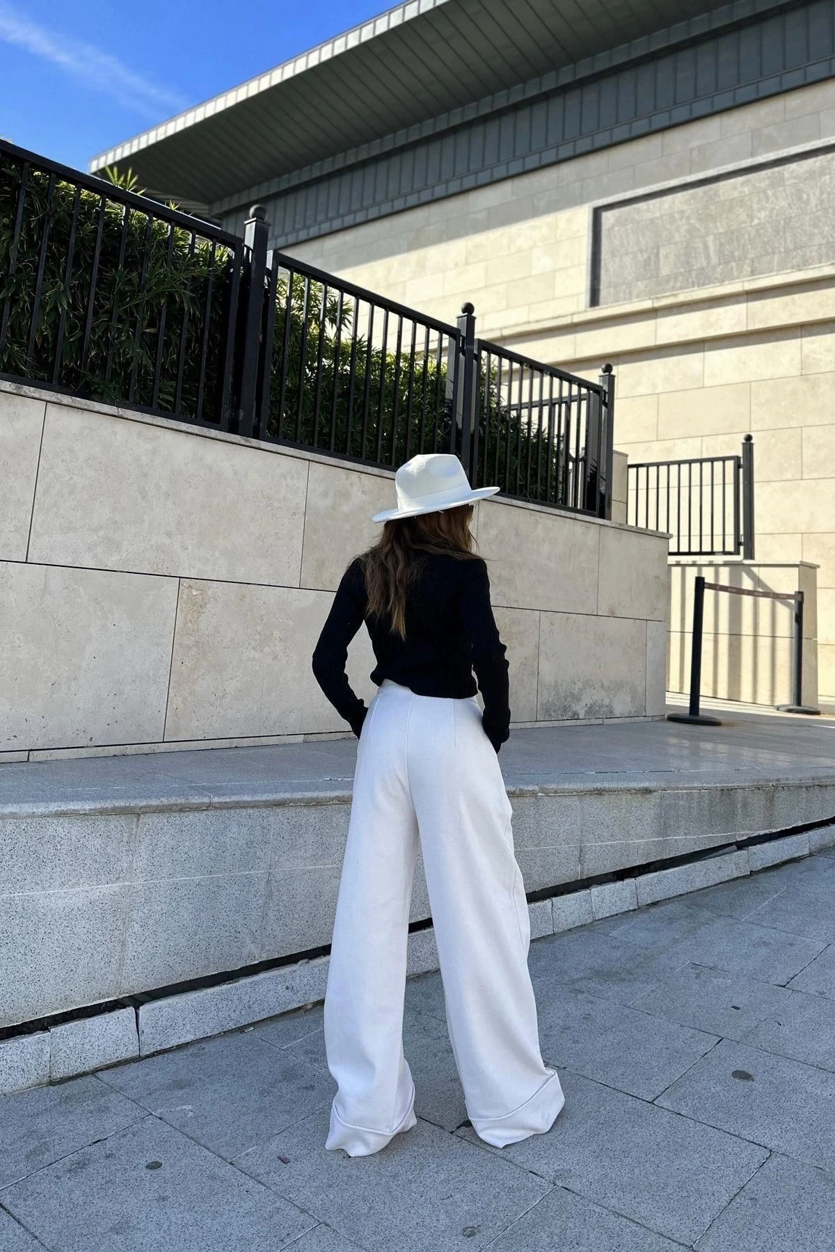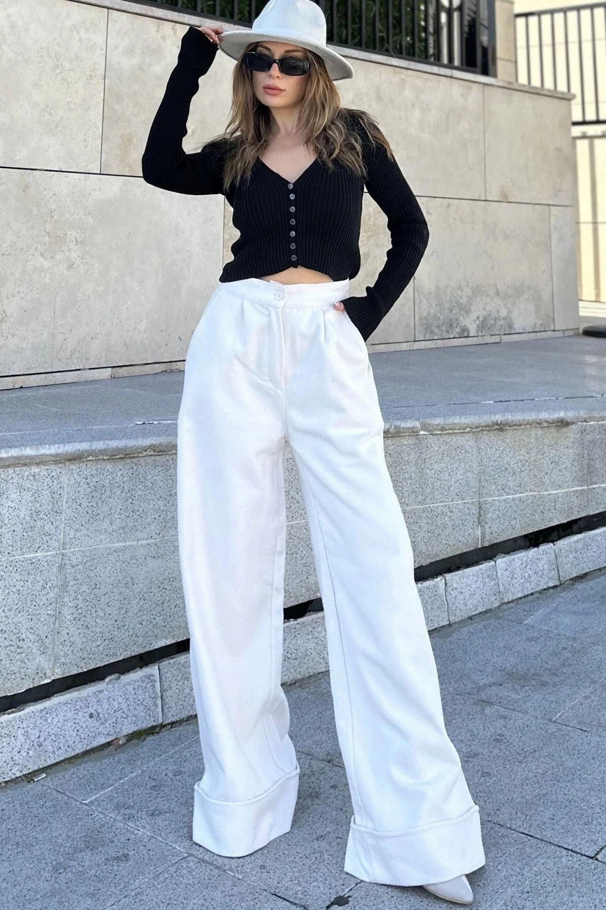 Kadın Beyaz Duble Paça, Beli Pliseli, Fitilli Kaşe Kumaş, İspanyol Pantolon