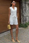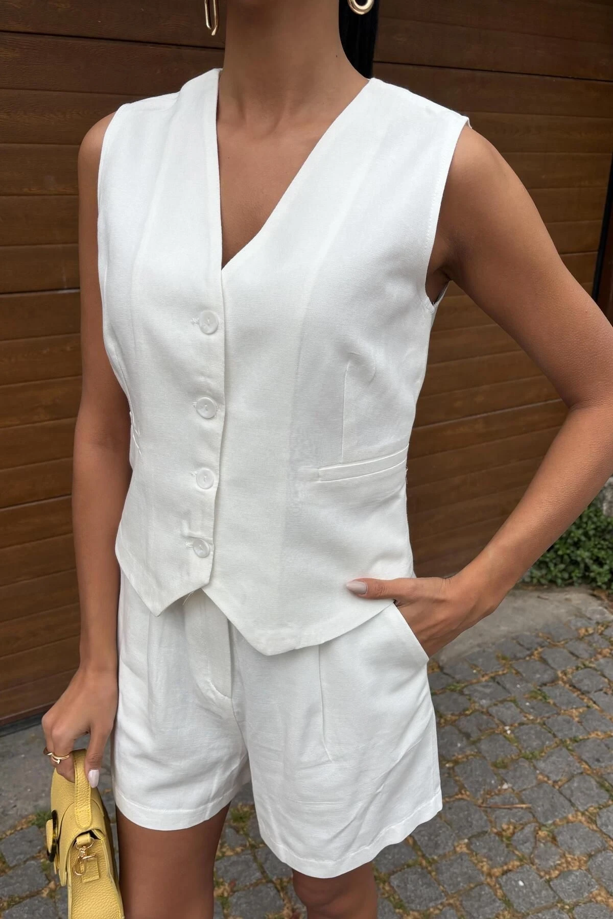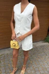 Kadın Beyaz Flamlı Keten İkili Kısa Takım