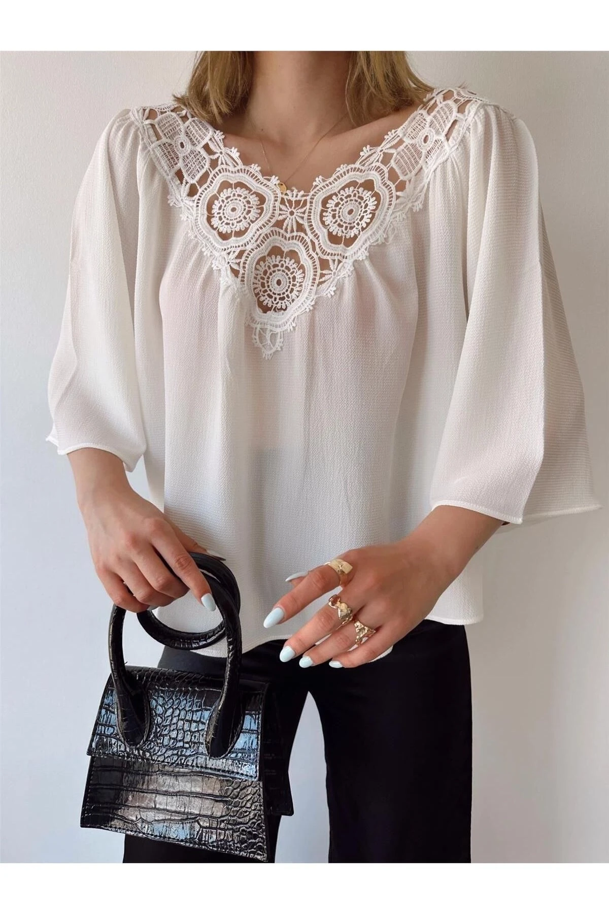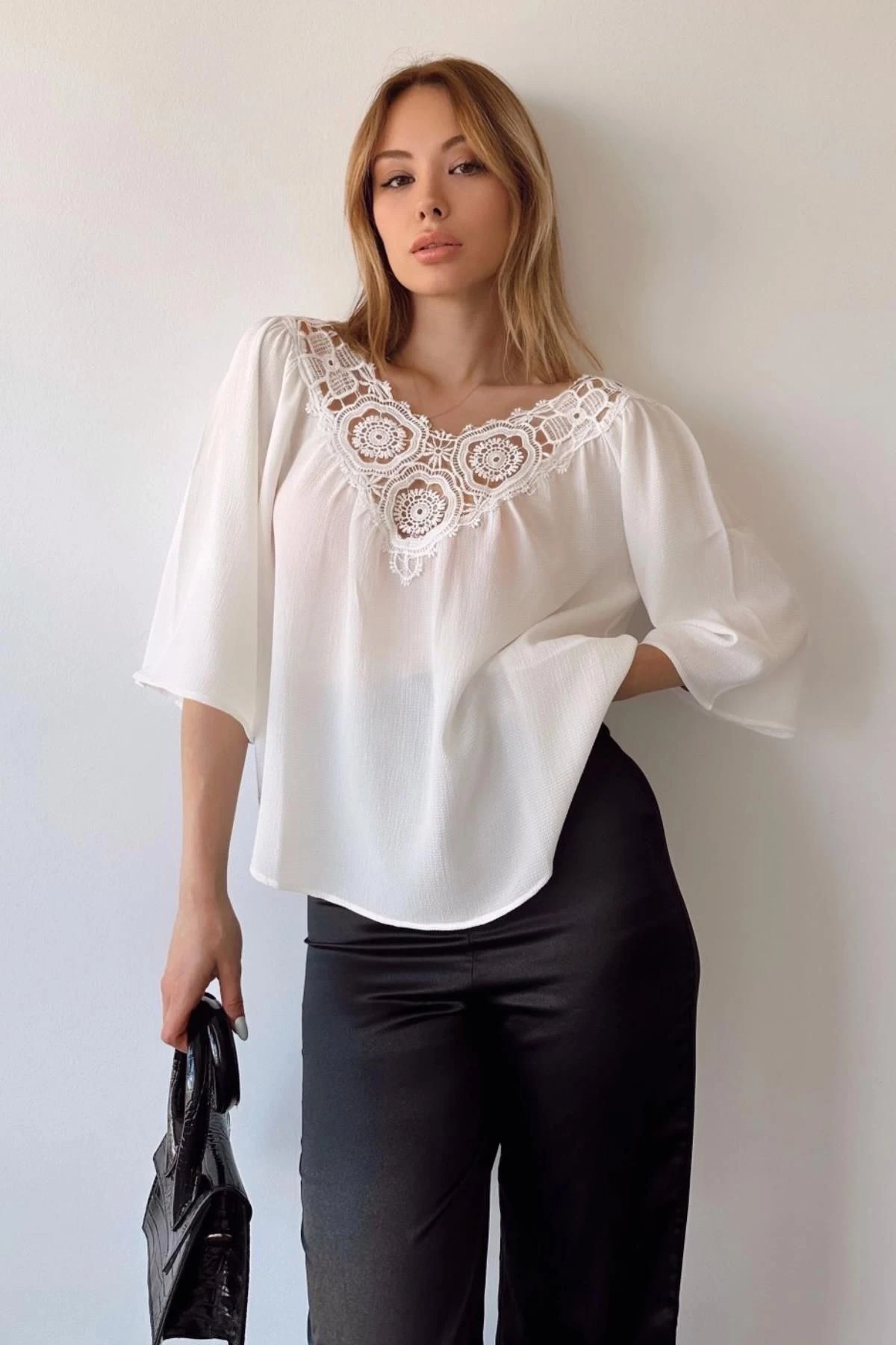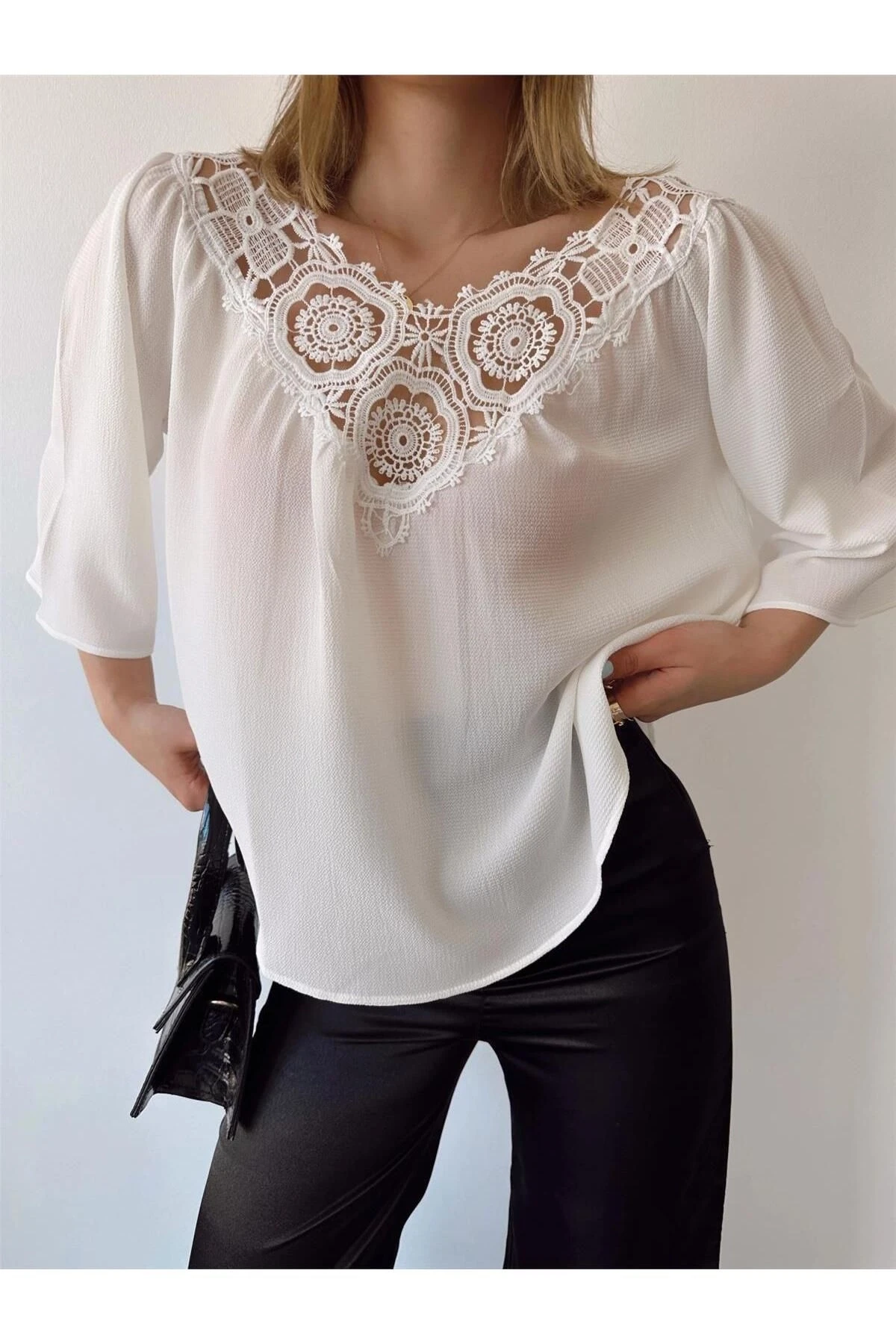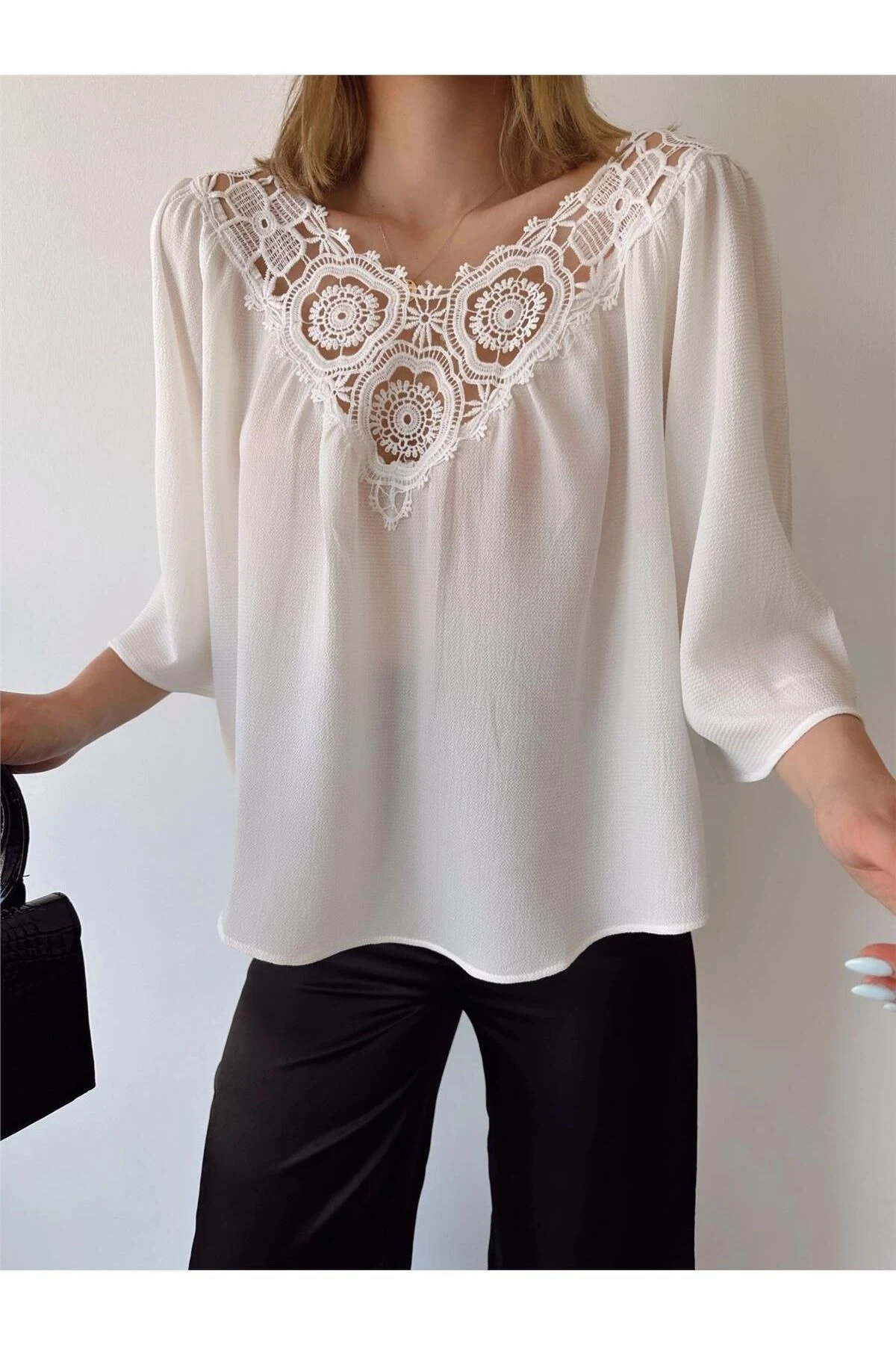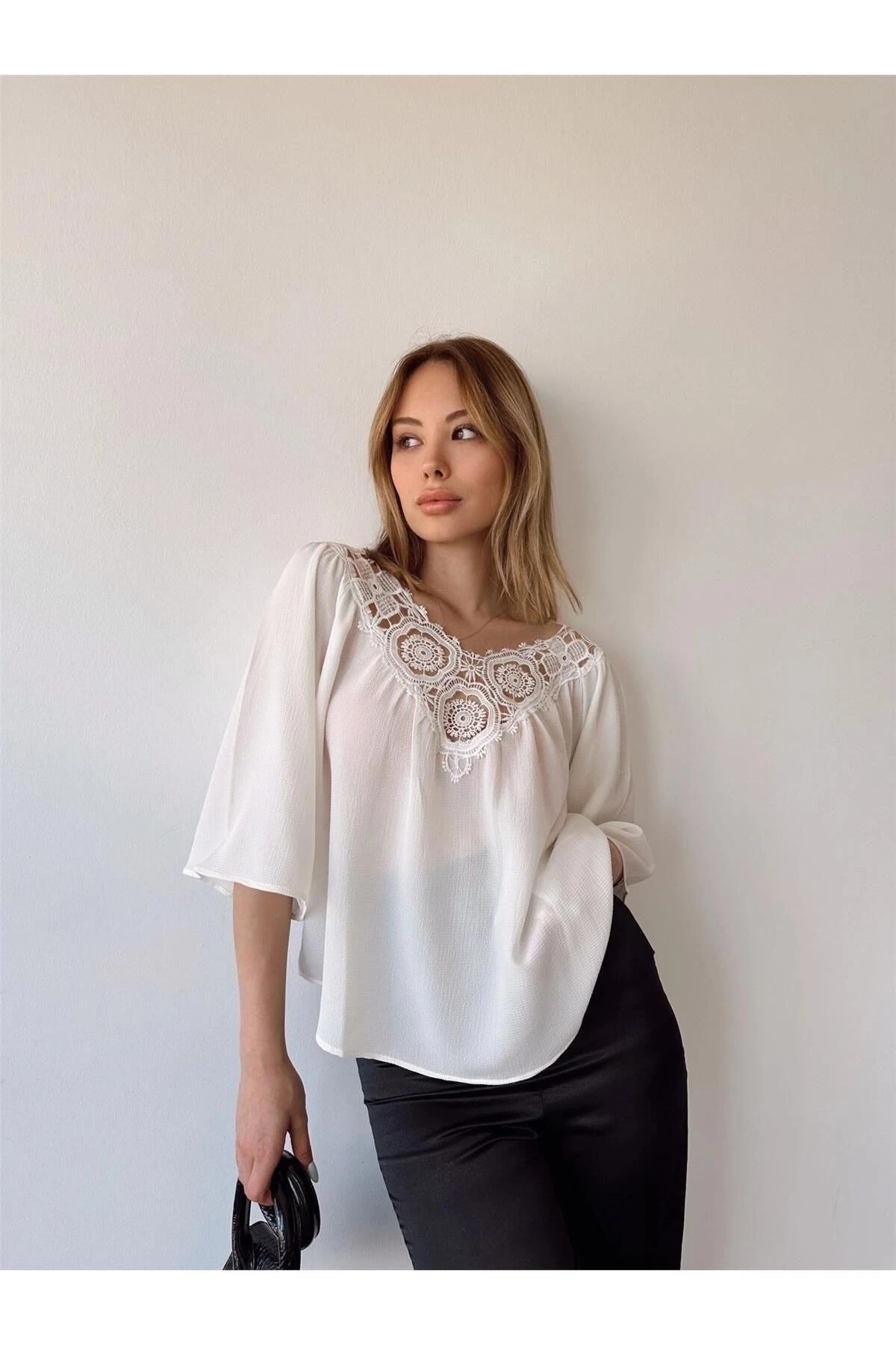 Bu kadın beyaz uzun bluz, zarafeti ve şıklığı bir araya getiriyor.; Bluzun kumaşı %60 polyester ve %40 pamuk karışımından oluşur.; Bu karışım, bluza dayanıklılık sağlarken aynı zamanda yumuşaklık ve konfor sunar.; V yaka tasarımı, bluza çekici bir görünüm kazandırır ve boyun bölgesini zarif bir şekilde çerçeveleyerek feminen bir hava yaratır.; Flare kol detayı, bluza hareketli ve etkileyici bir siluet katar.; Bu detay, bluzun stilini ve şıklığını vurgular.; Dantel ve güpür deseni, bluza romantik ve sofistike bir dokunuş sağlar.; Ön ve arkasındaki dantel detaylar, bluza zarif bir ayrıntı katarken aynı zamanda görsel ilgi çeker.; Geniş kesim kalıp ve kesimi, bluzun gevşek ve rahat bir oturuşa sahip olmasını sağlar.; Bu kesim, her vücut tipine uyum sağlar ve hareket özgürlüğü sunar.; Dokuma kumaşı, hafif ve nefes alabilir bir yapıya sahiptir, böylece gün boyu rahatlık sağlar.; Bu beyaz flare kol V yaka uzun bluz, zarif bir seçenektir.; Dantel ve güpür deseniyle görsel olarak çekicilik katarken geniş kesim kalıbı rahatlık sunar.; Bu bluz, özel etkinliklerden günlük kullanıma kadar birçok farklı durumda tarzınızı tamamlamak için idealdir.; Gardırobunuzun vazgeçilmez parçalarından biri olacak.