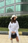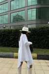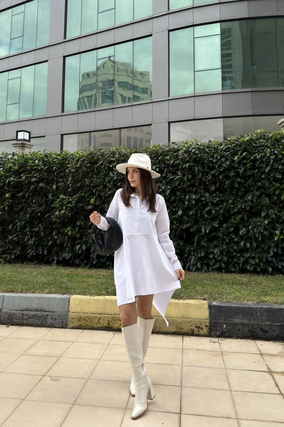 Kadın Beyaz Gömlek Yaka, Uzun Kol, Asimetrik Kesim, Salaş, Midi Tunik Elbise
