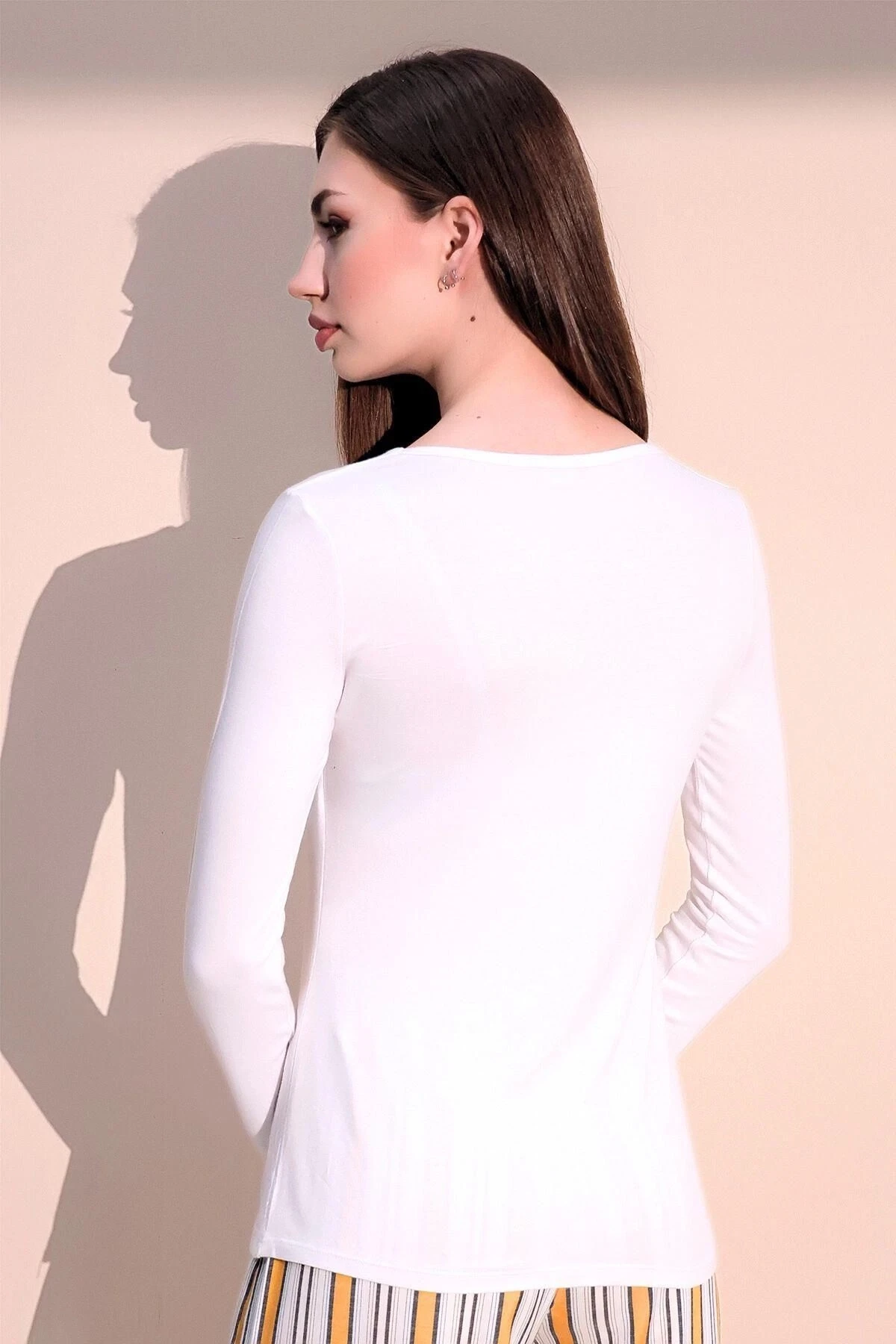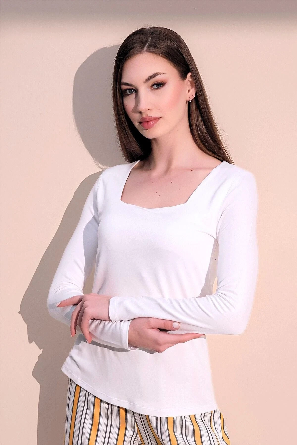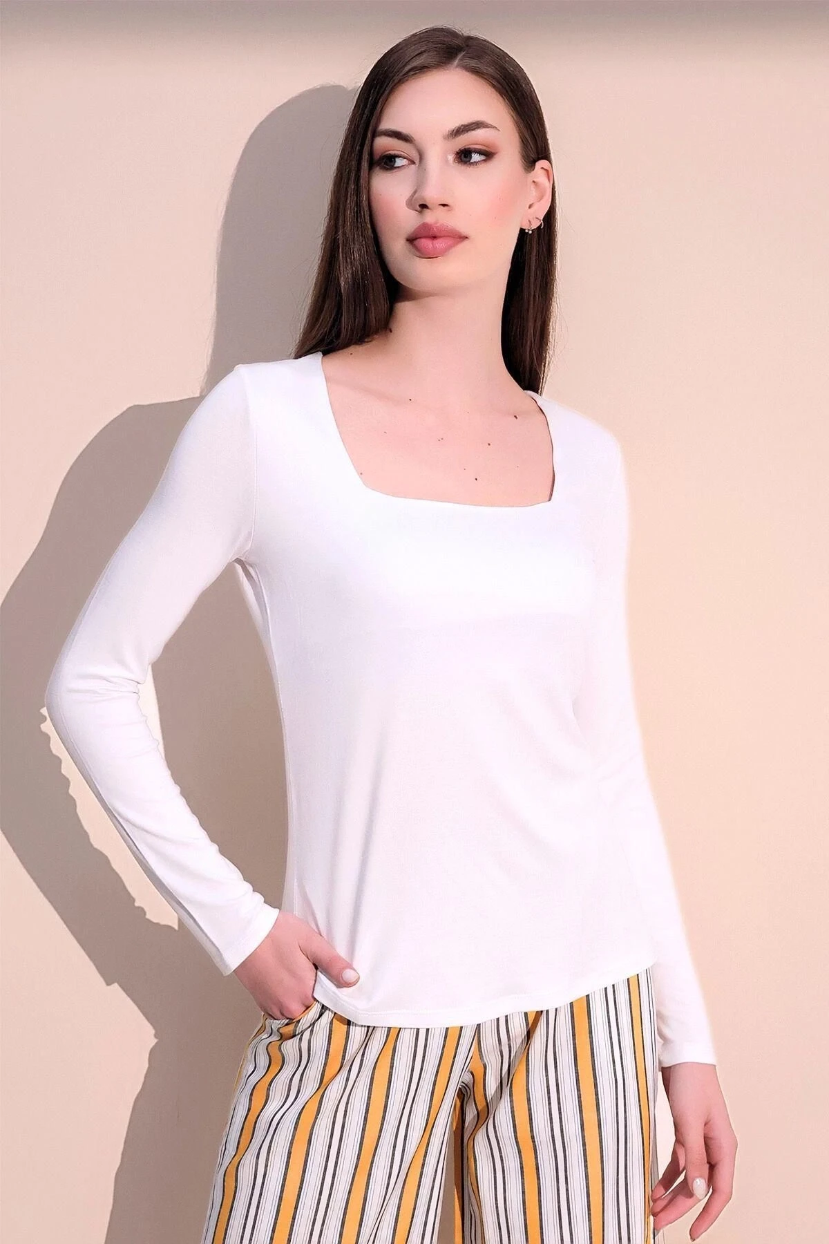 Kadın Beyaz Günlük Stil Basic Kare Yaka Uzun Kol Bluz