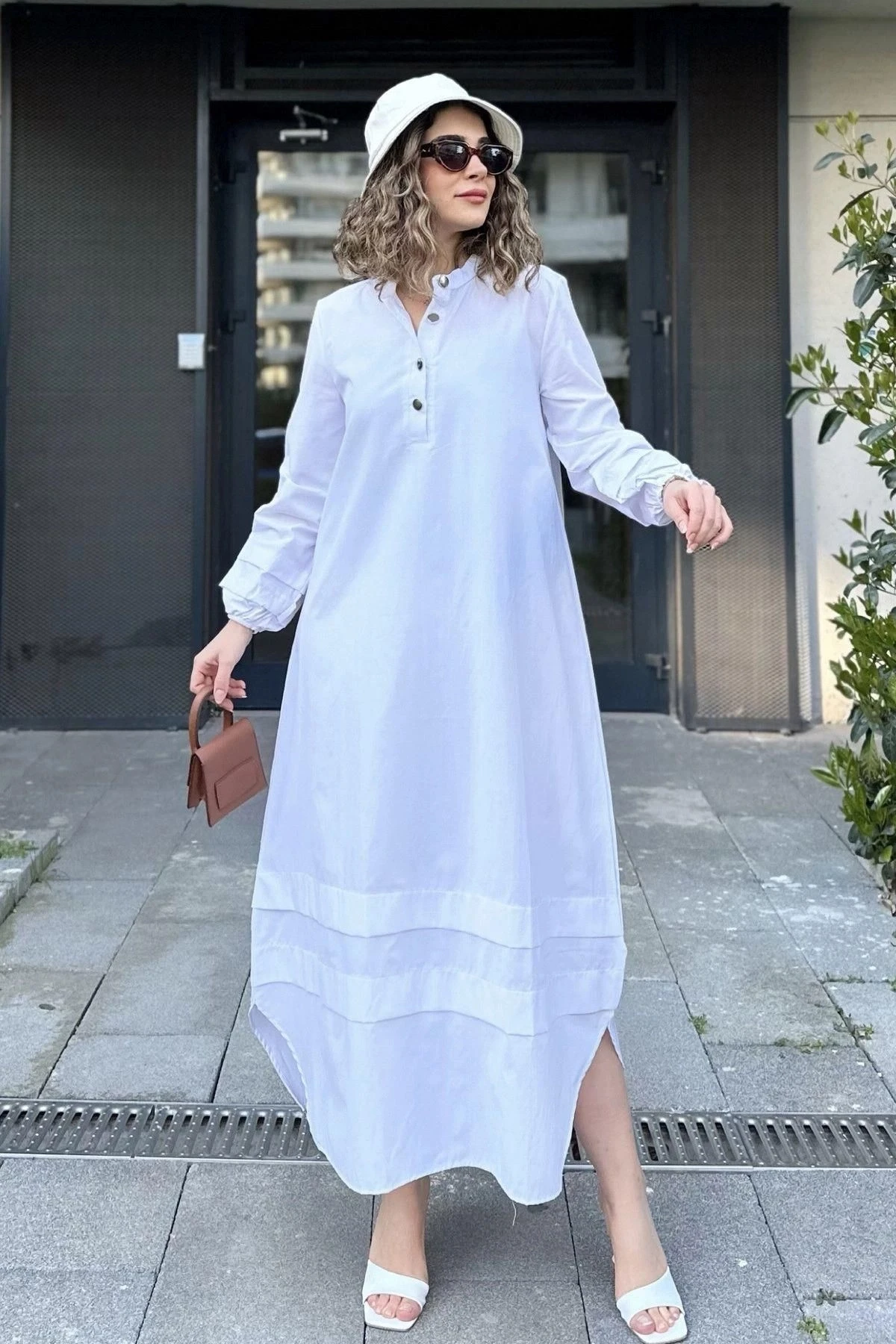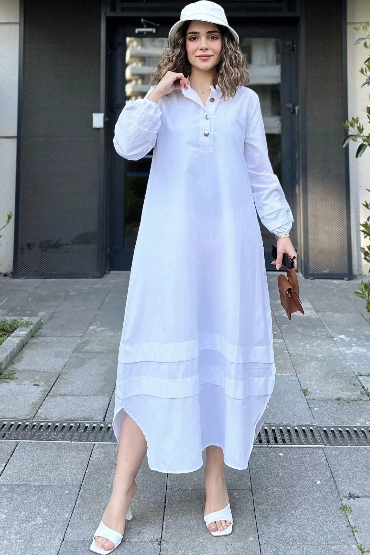 Kadın Beyaz Hakim Yaka, Lastikli Balon Kol, Etek Ve Kolu Kat Kumaş Dikişli, Uzun Salaş Elbise