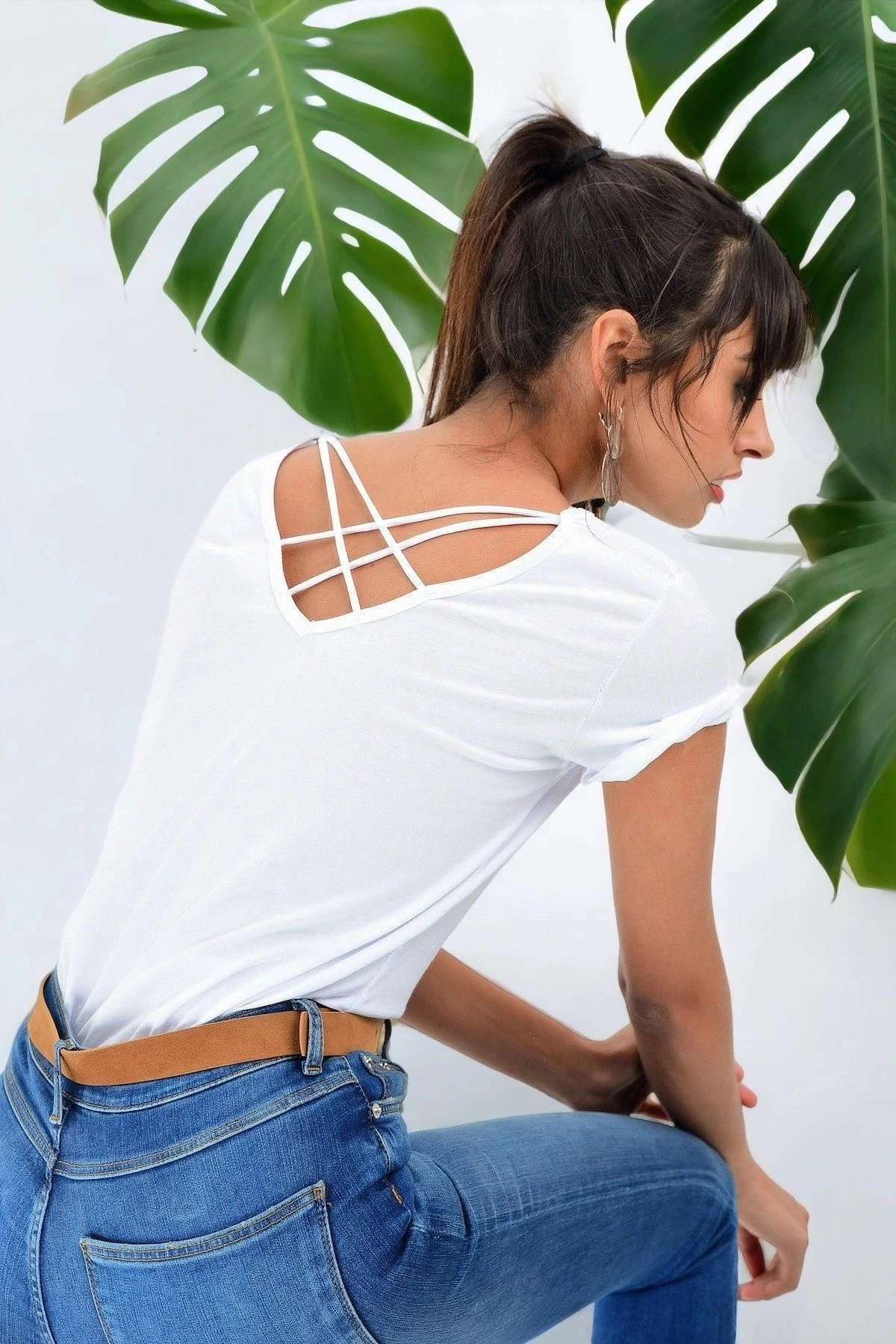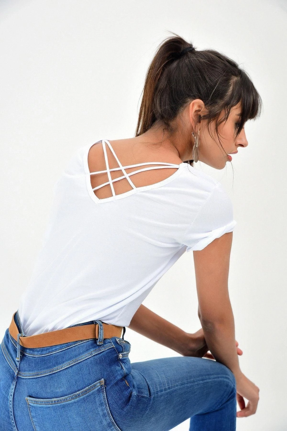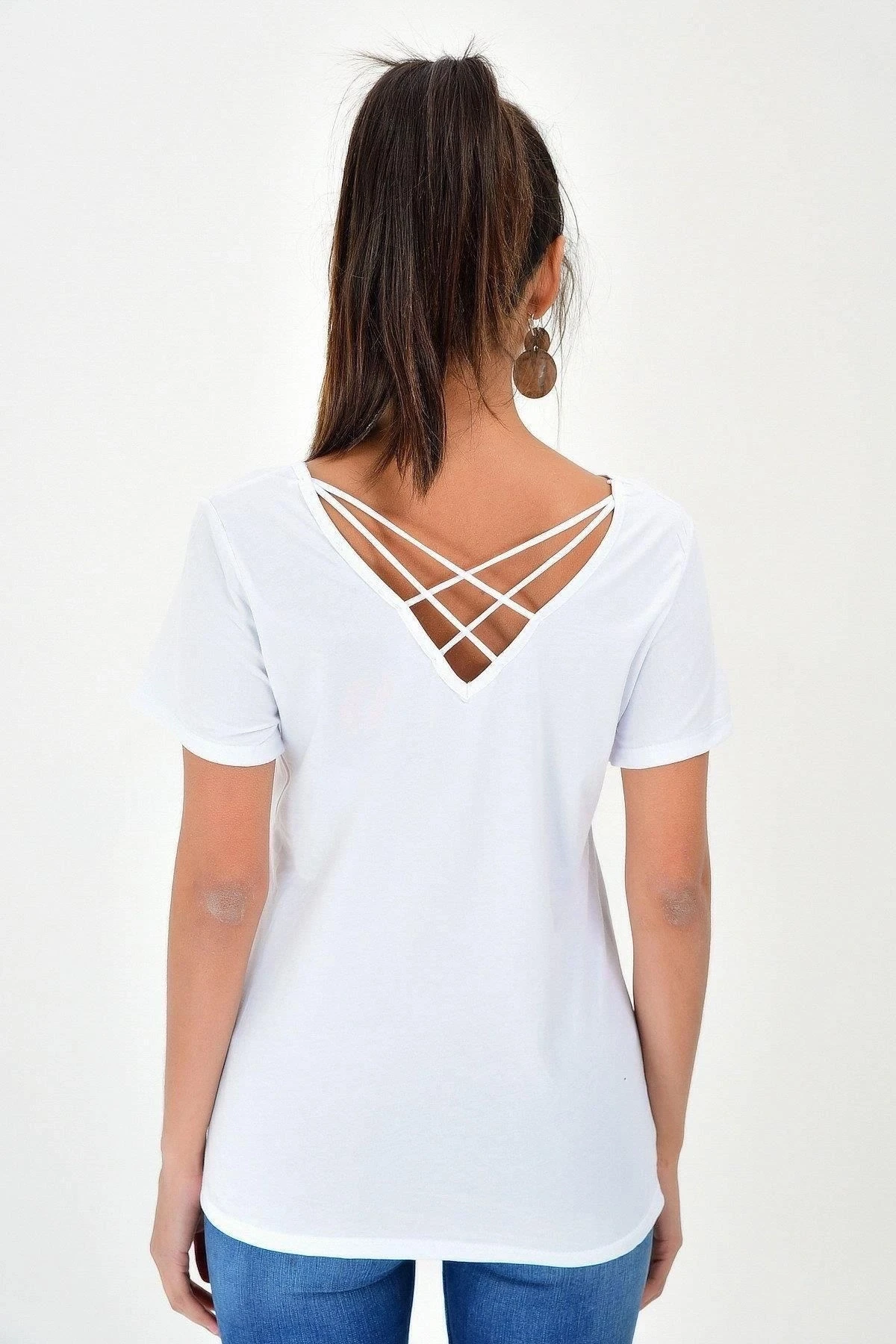 Kadın Beyaz Ip Detaylı, V Yaka, Kısa Kol, Regular Kesim, Standart Boy Bluz