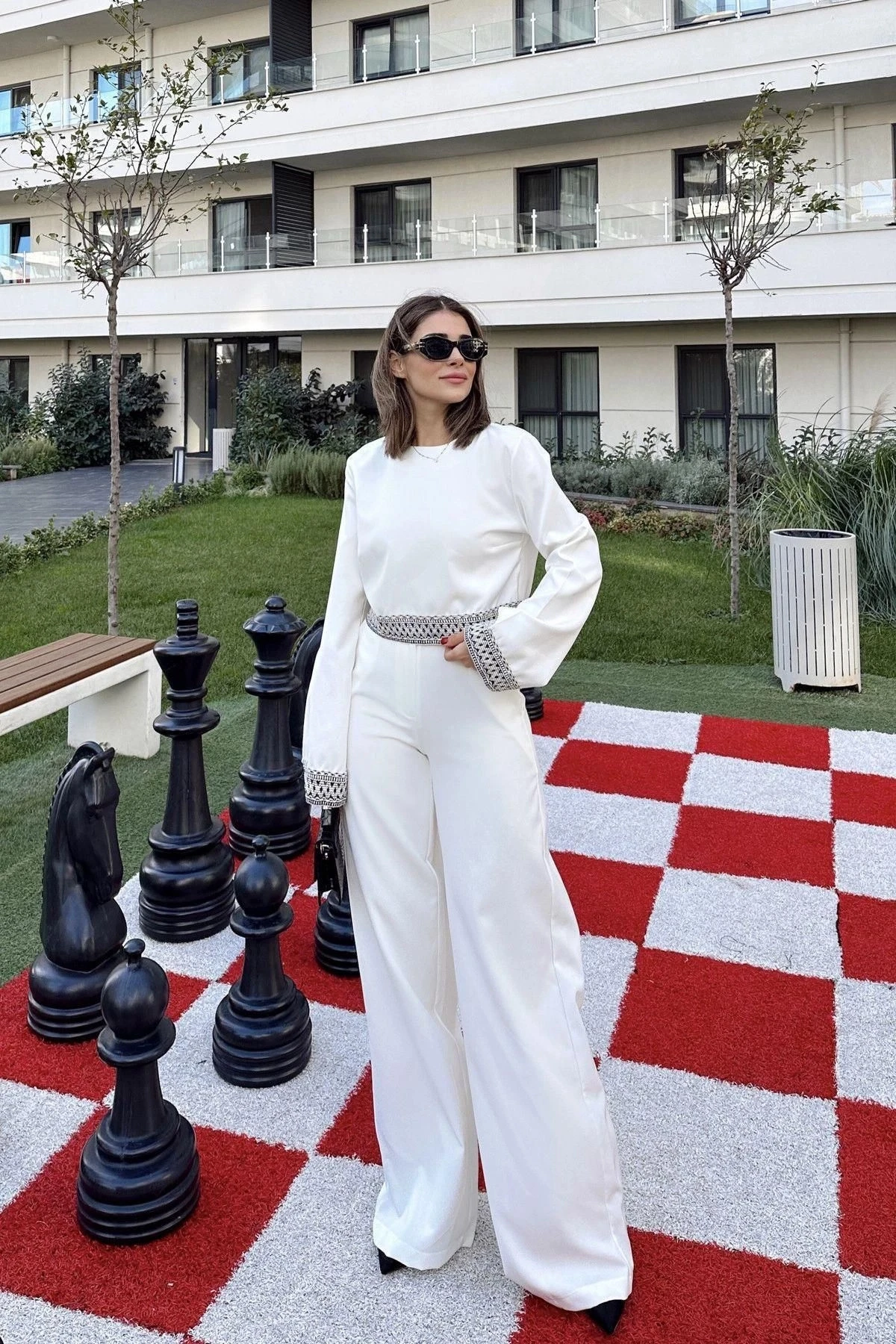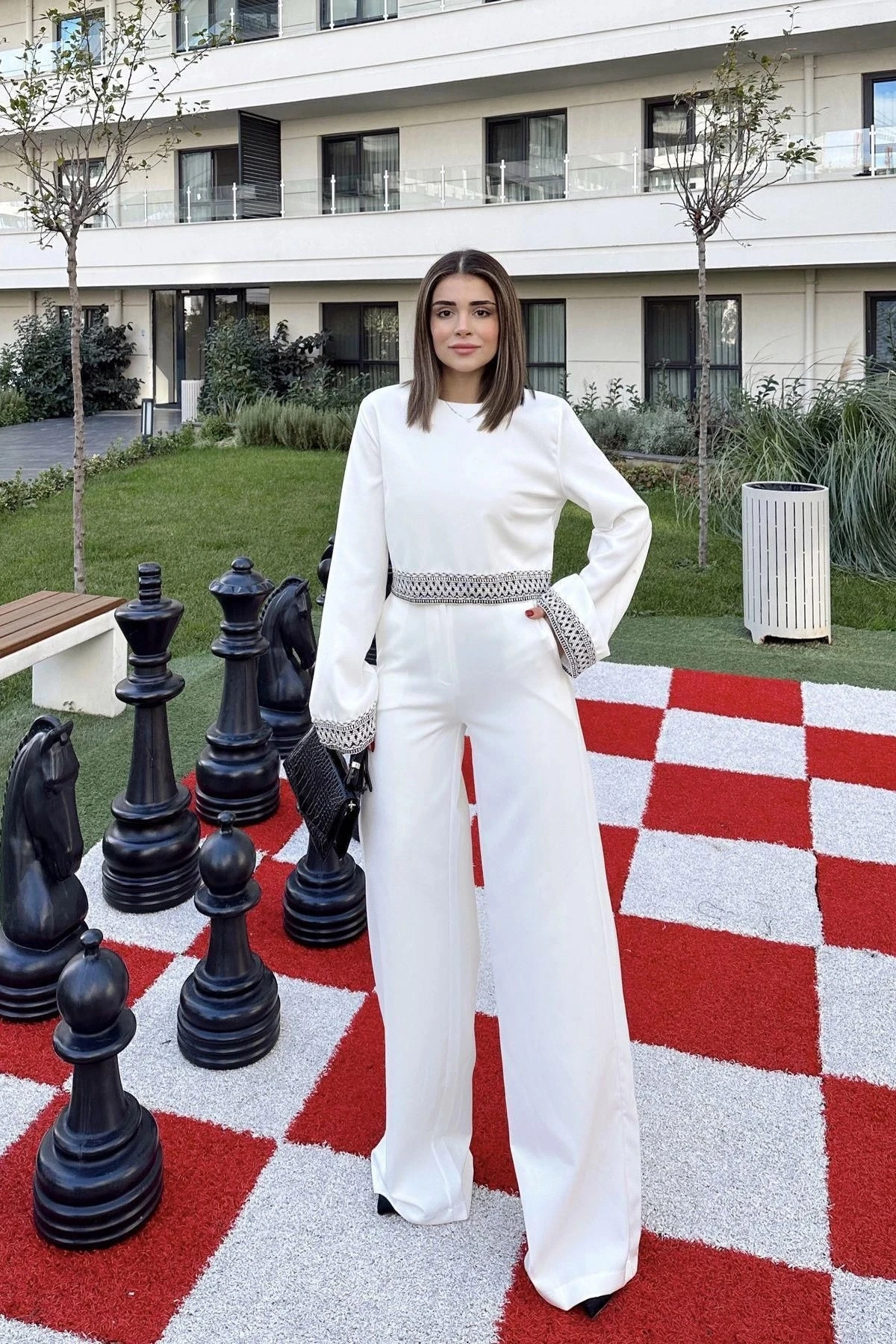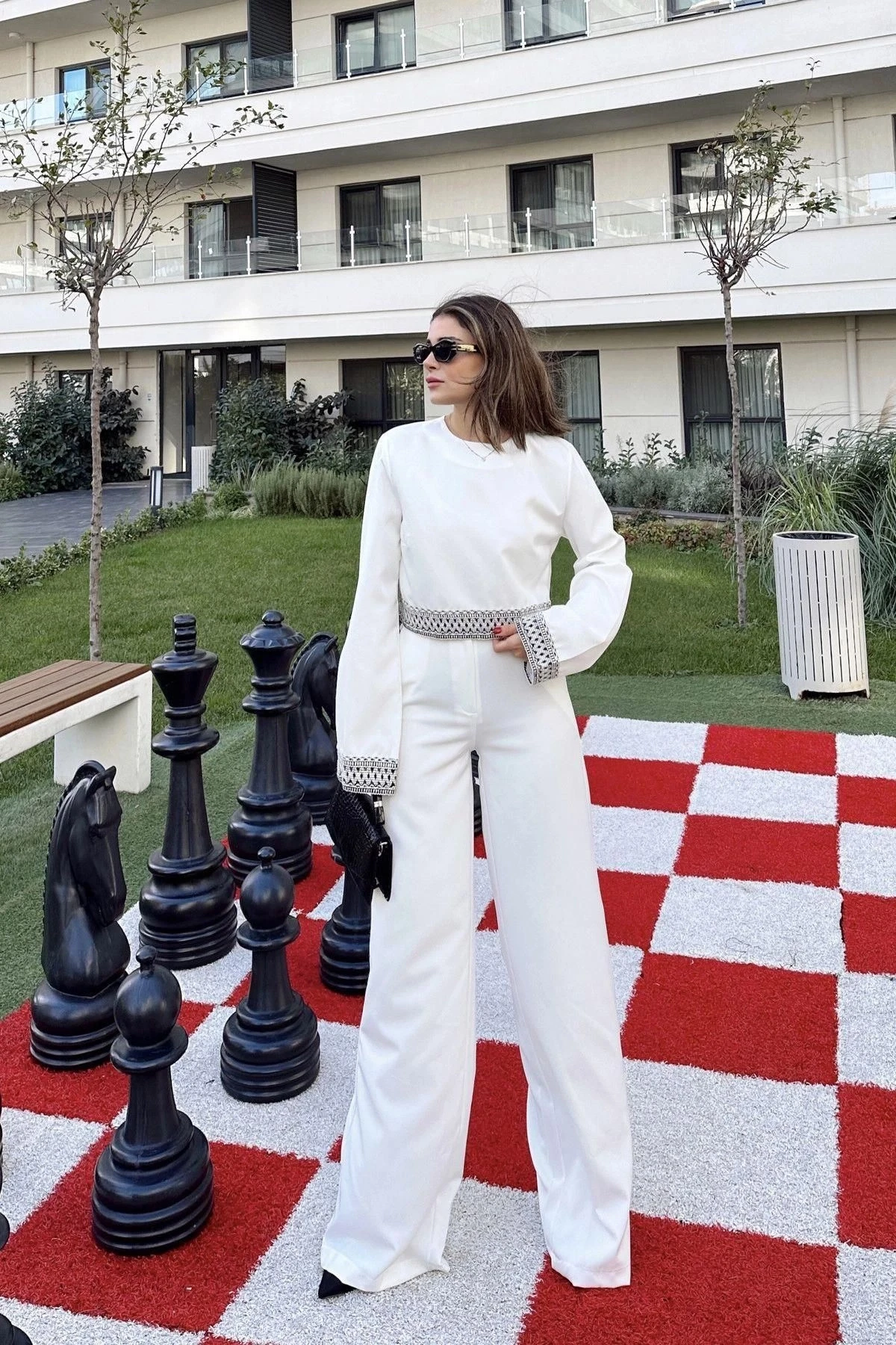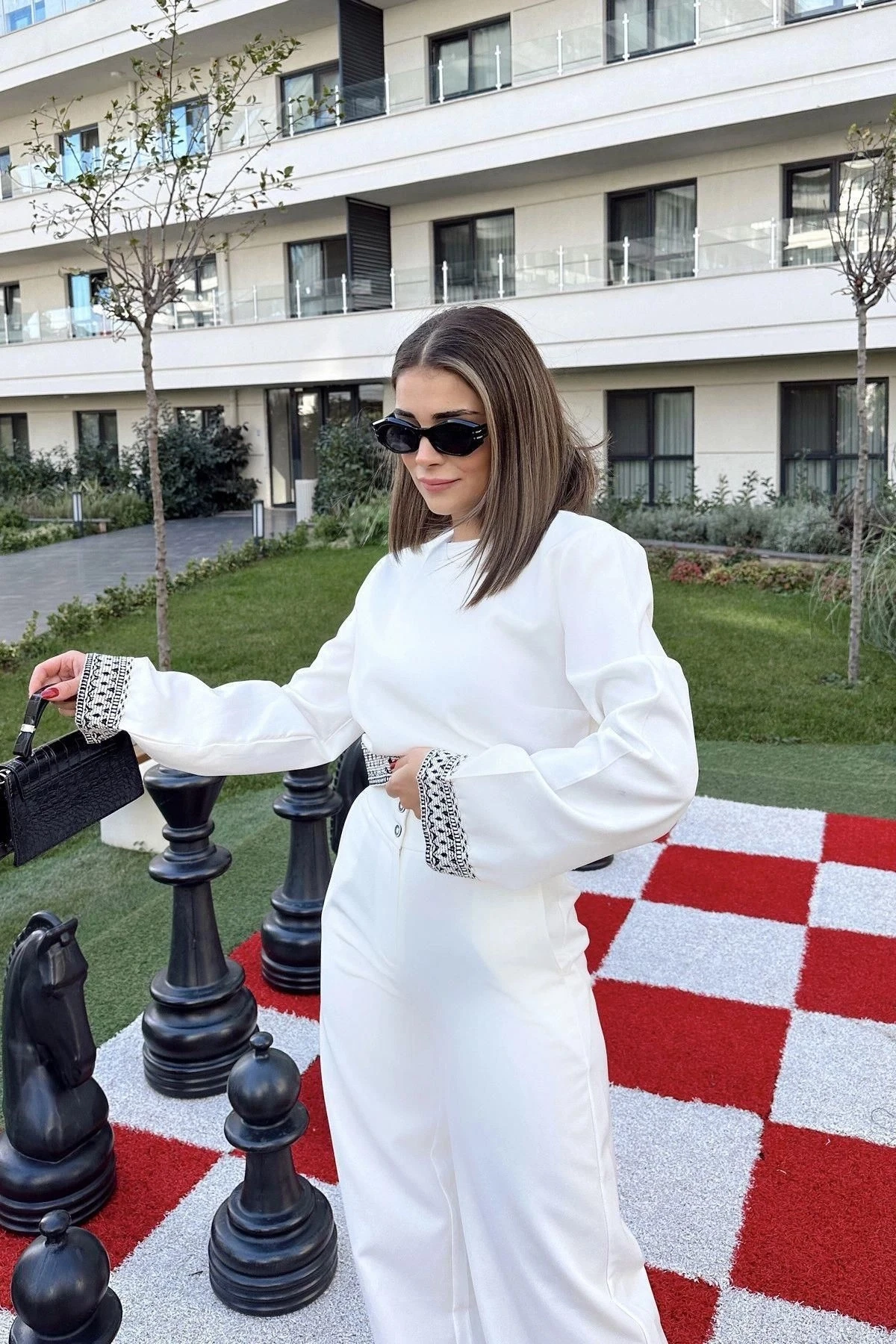 Kadın Beyaz İşleme Detaylı Bluz & Bol Paça Pantolon - Alt & Üst Takım