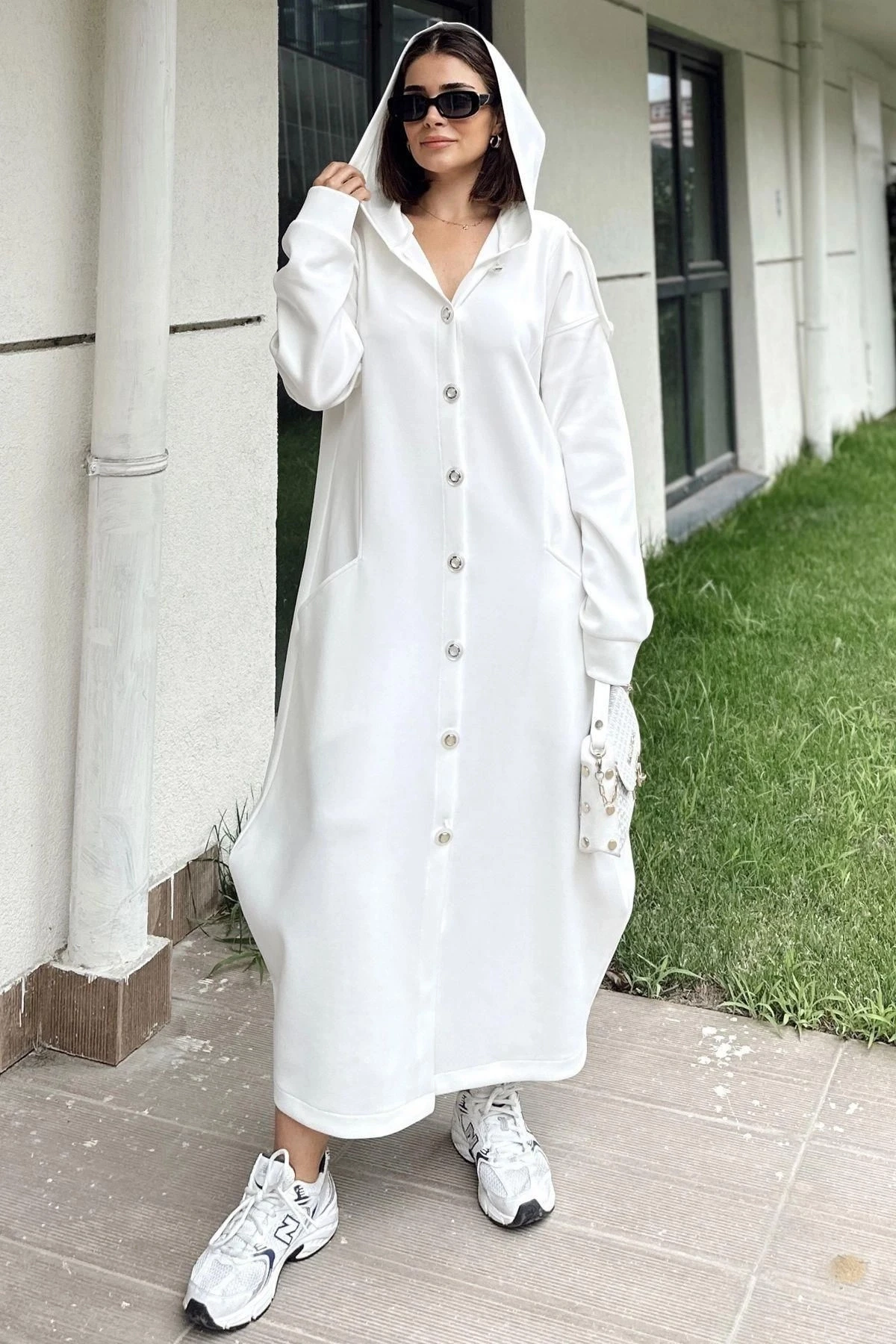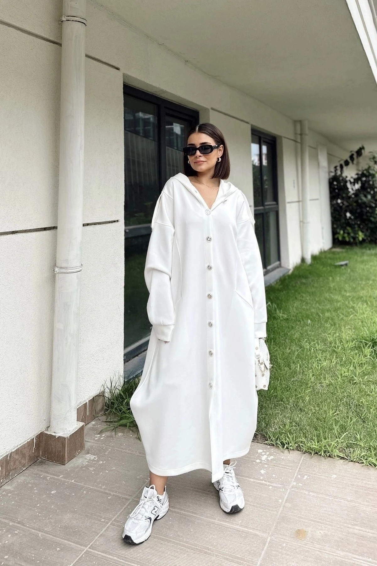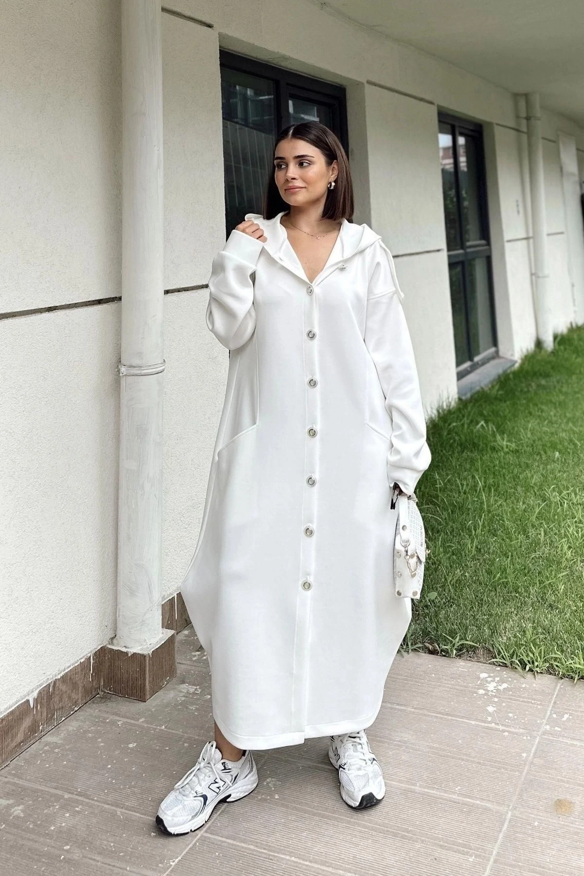 Kadın Beyaz Kapüşonlu, Uzun Kol, Düğme Detaylı, Eteği Oval, Çift Cepli, Uzun Oversize Salaş Elbise