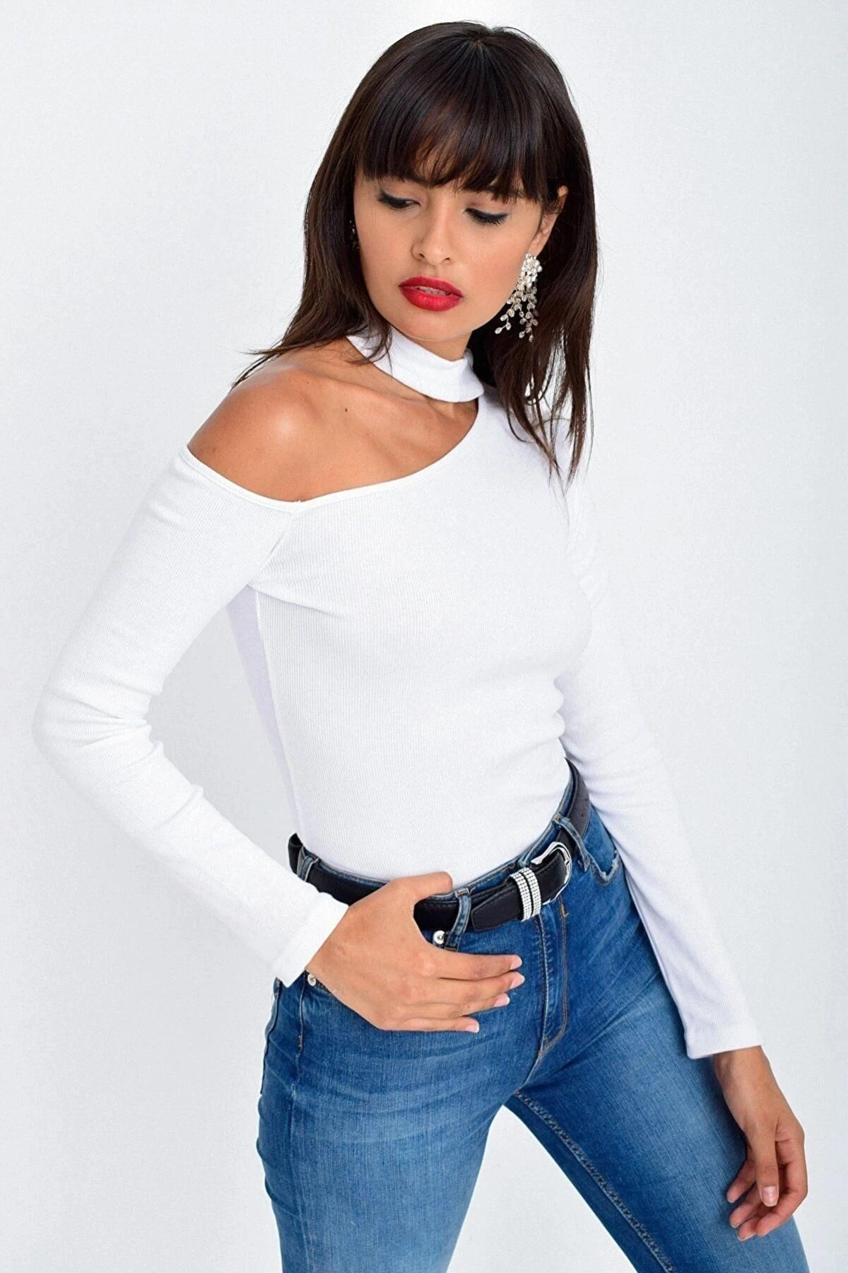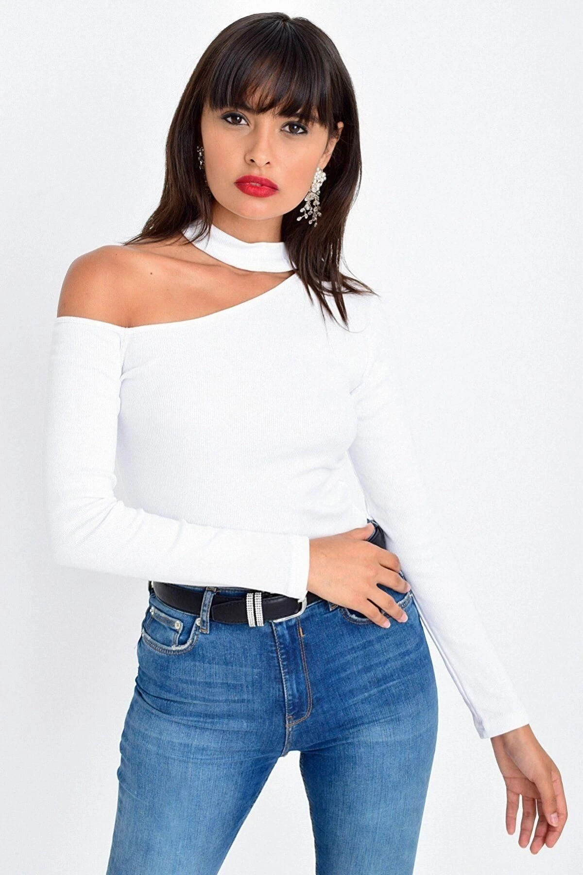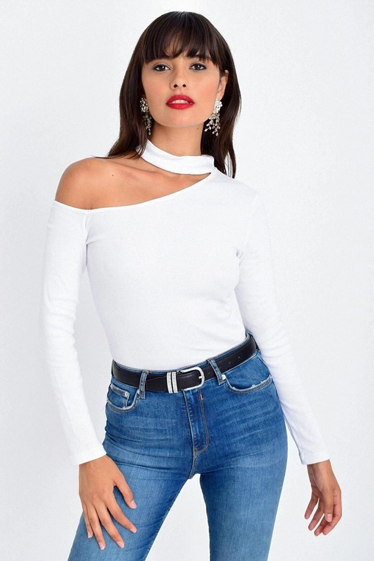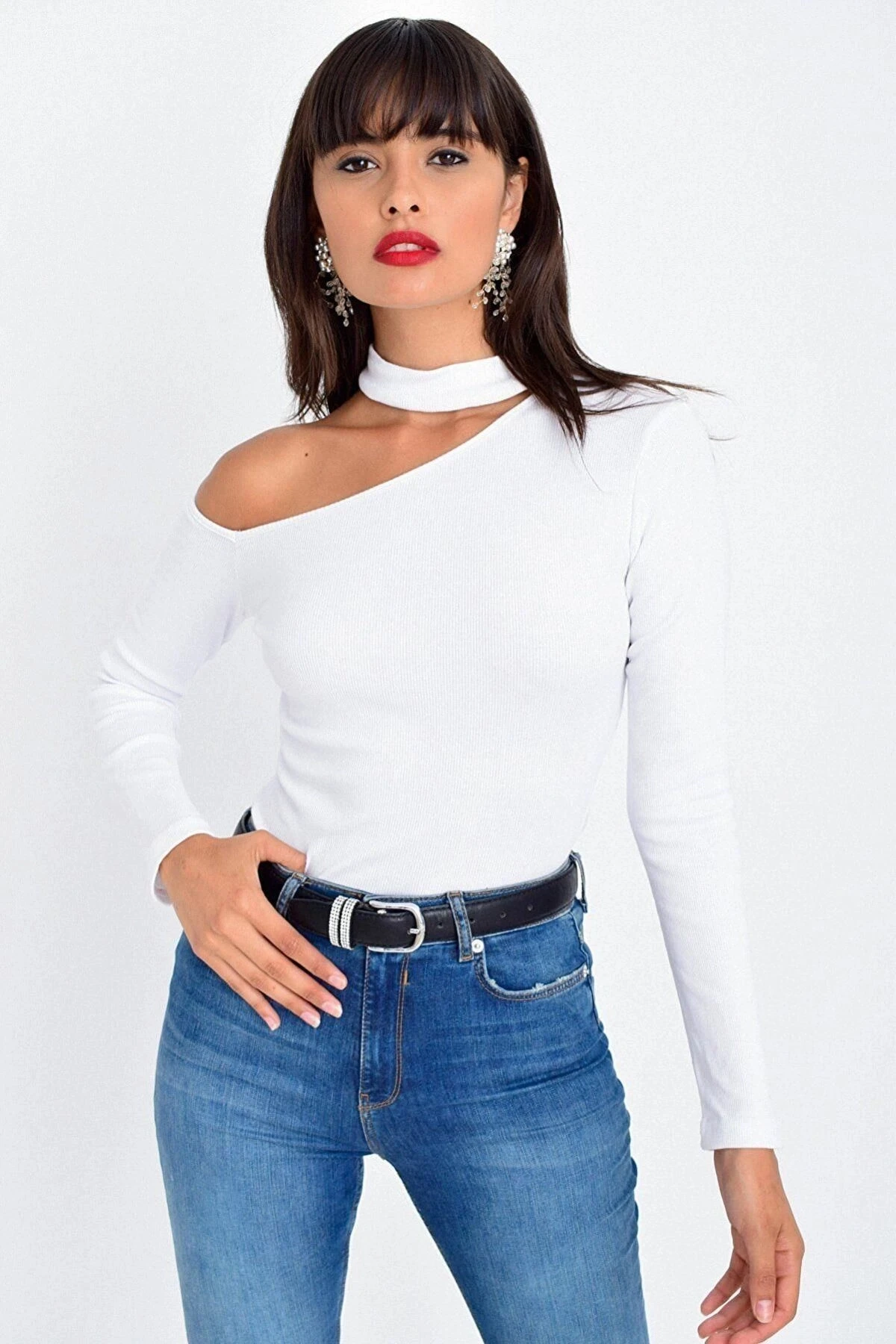 Kadın Beyaz Kayık Yaka Uzun Kol desenli tasarım yaka Regular Kesim Standart Boy Bluz