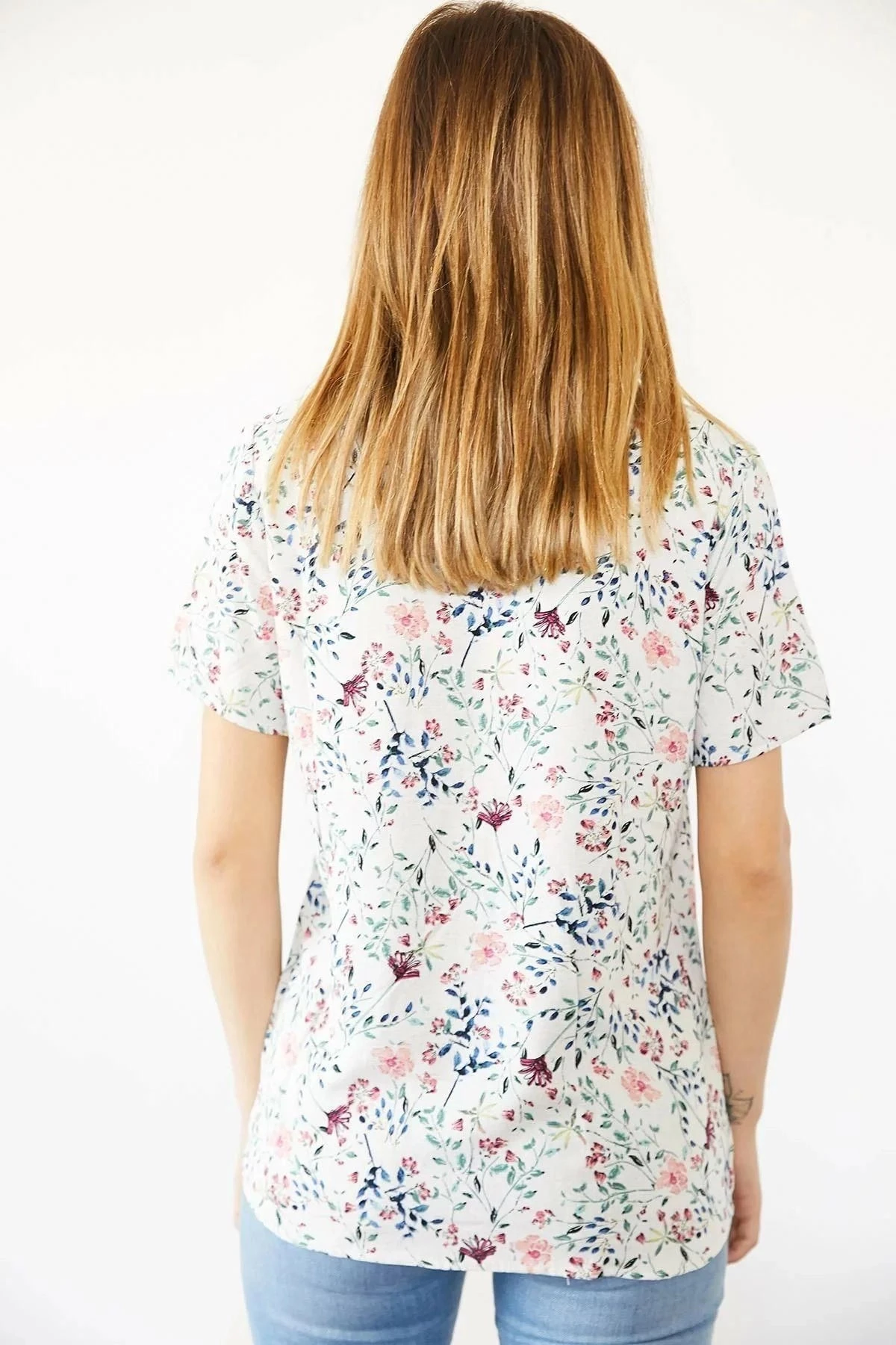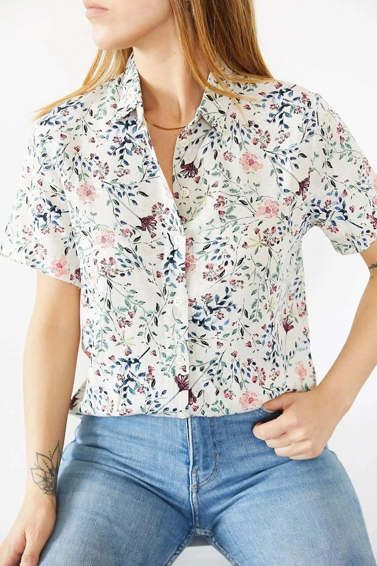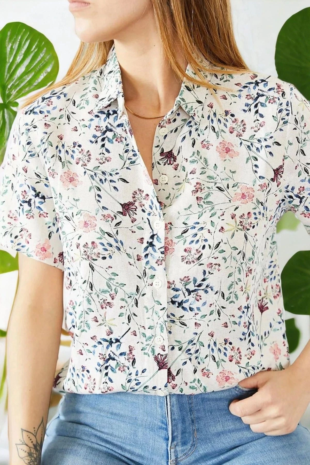 Kadın Beyaz Kısa Kollu çiçek desenli Klasik Yaka Regular Kesim Standart Boy Gömlek