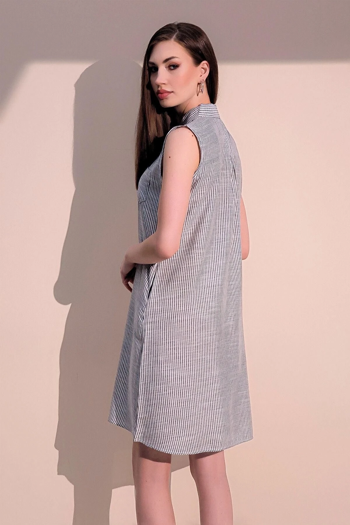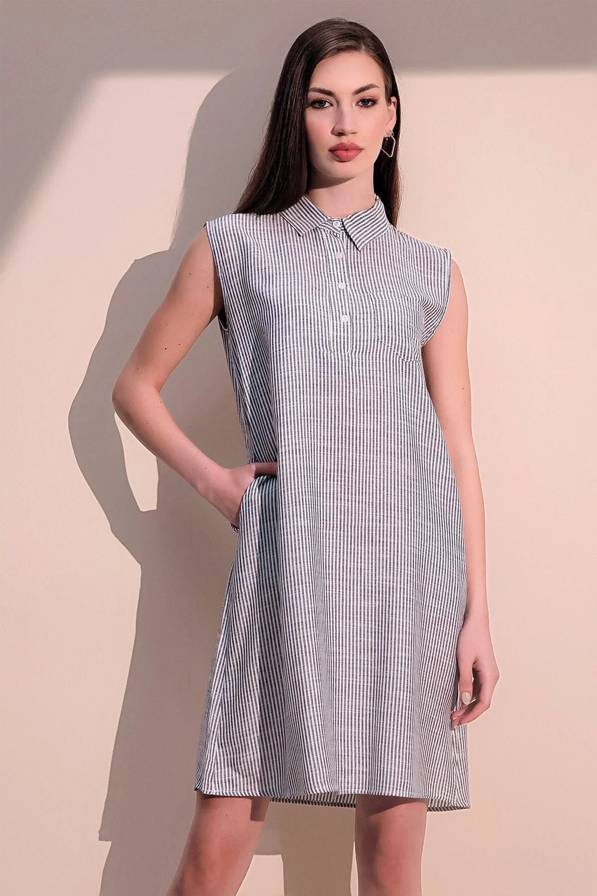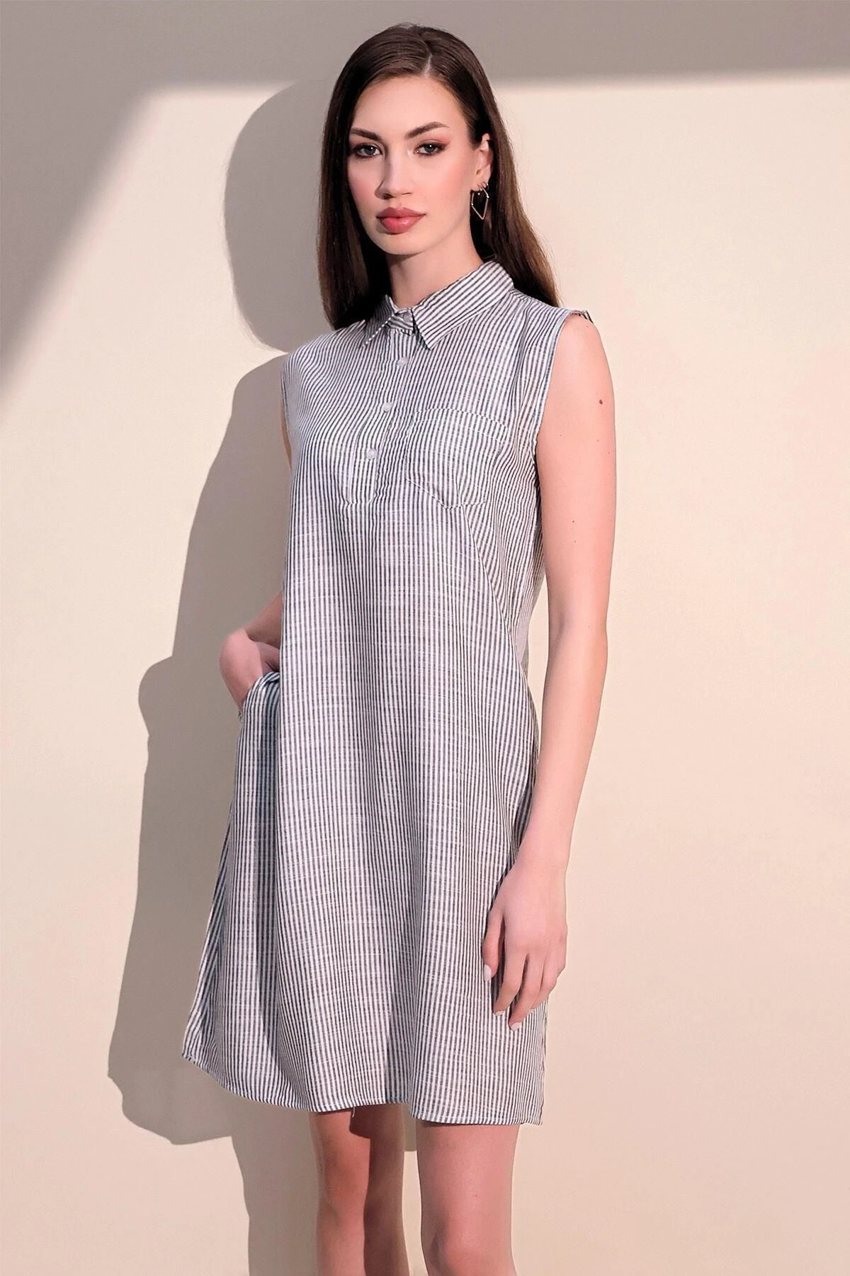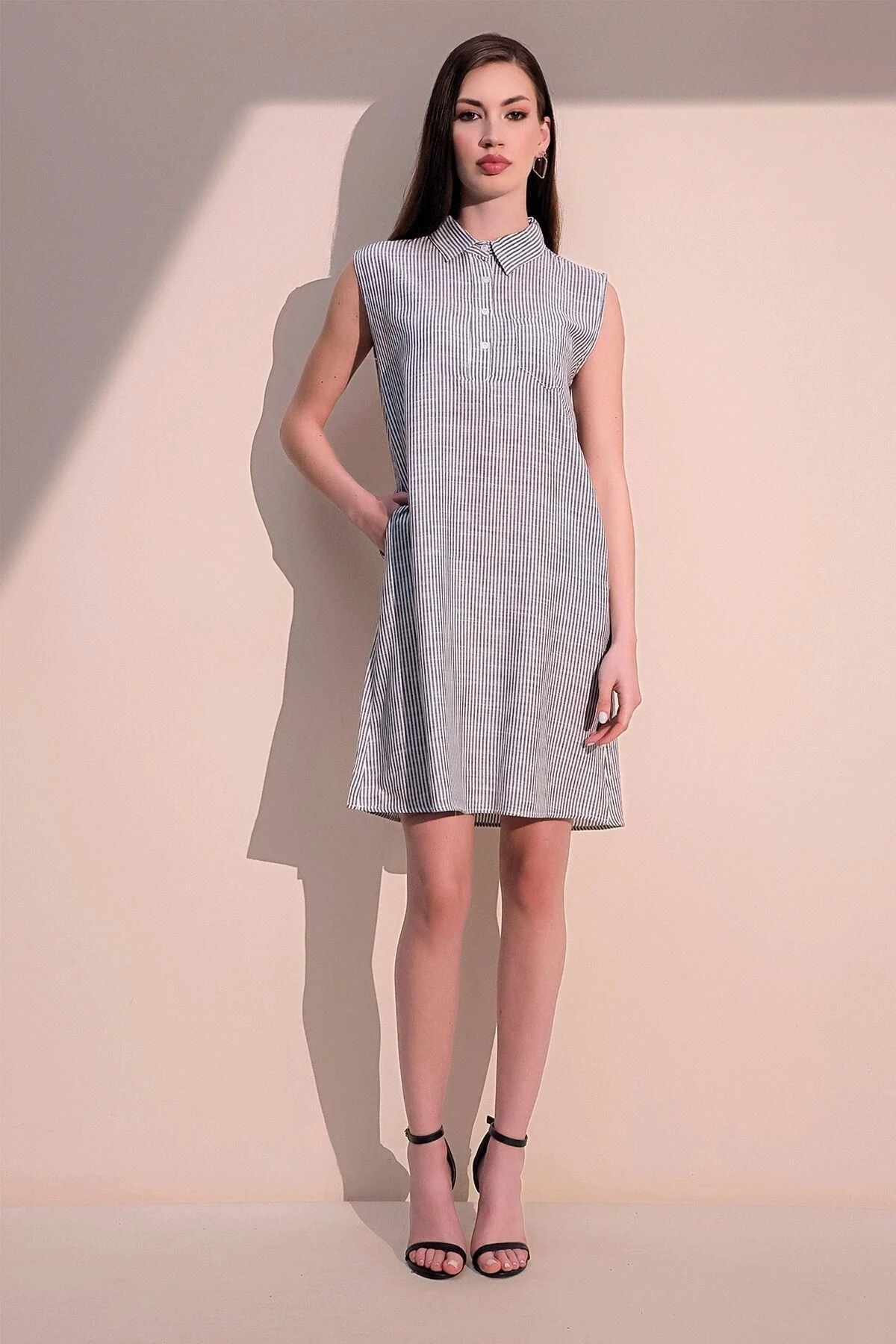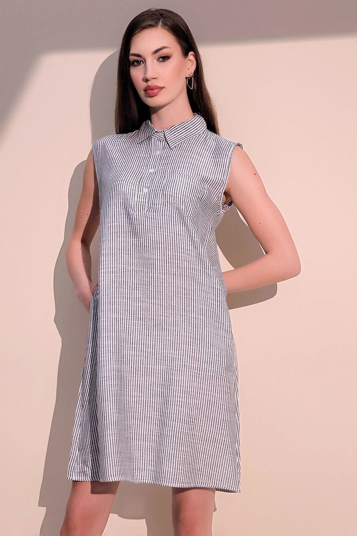 Kadın Beyaz Kolsuz Gömlek Yaka Yeni Tarz Tek Cep Yarım Patlı Çizgili Elbise
