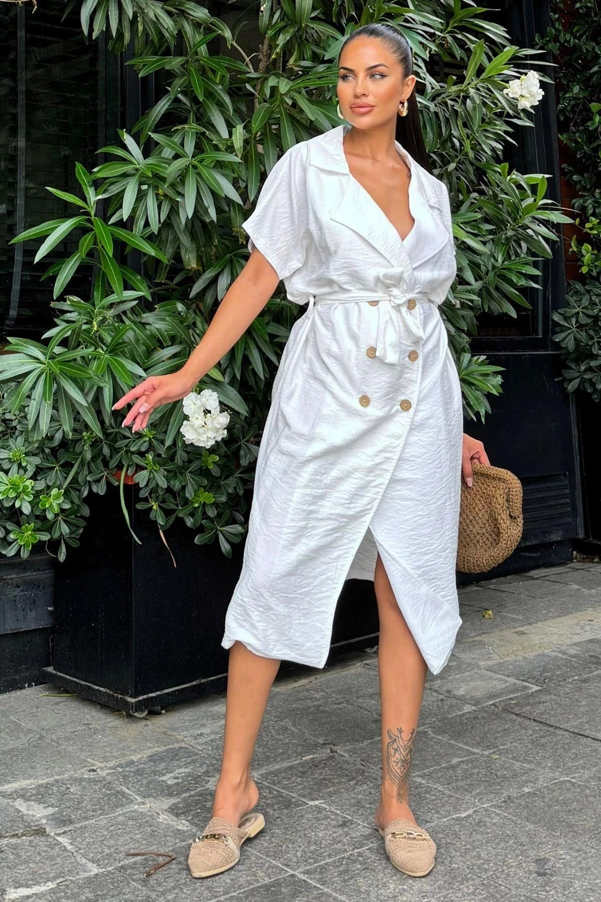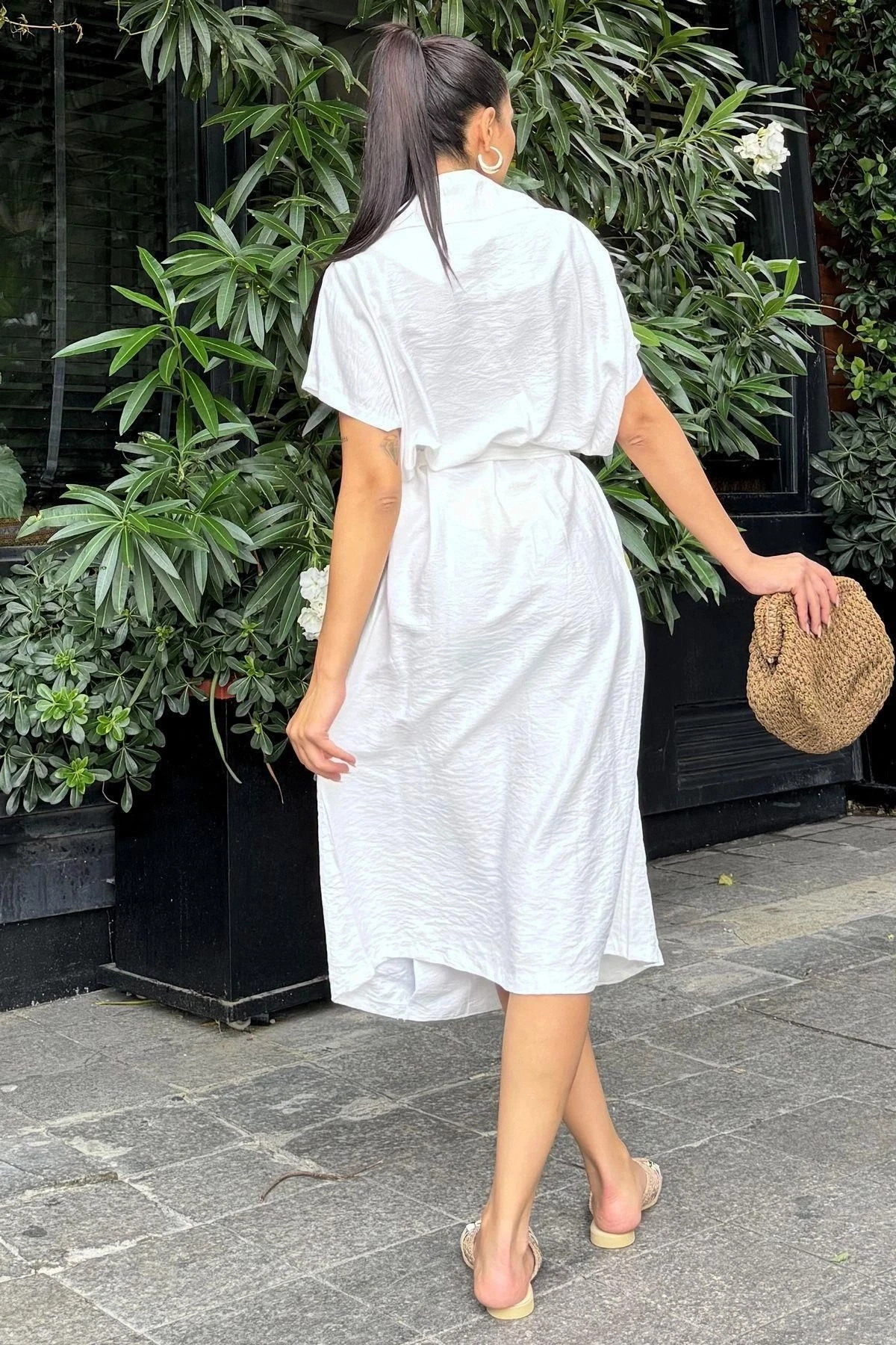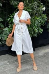 Kadın Beyaz Kruvaze Yaka, Kısa Kollu, Kemer Detaylı, Rahat Kesim, Midi Keten Elbise