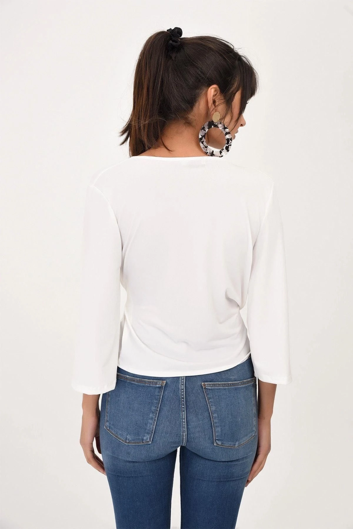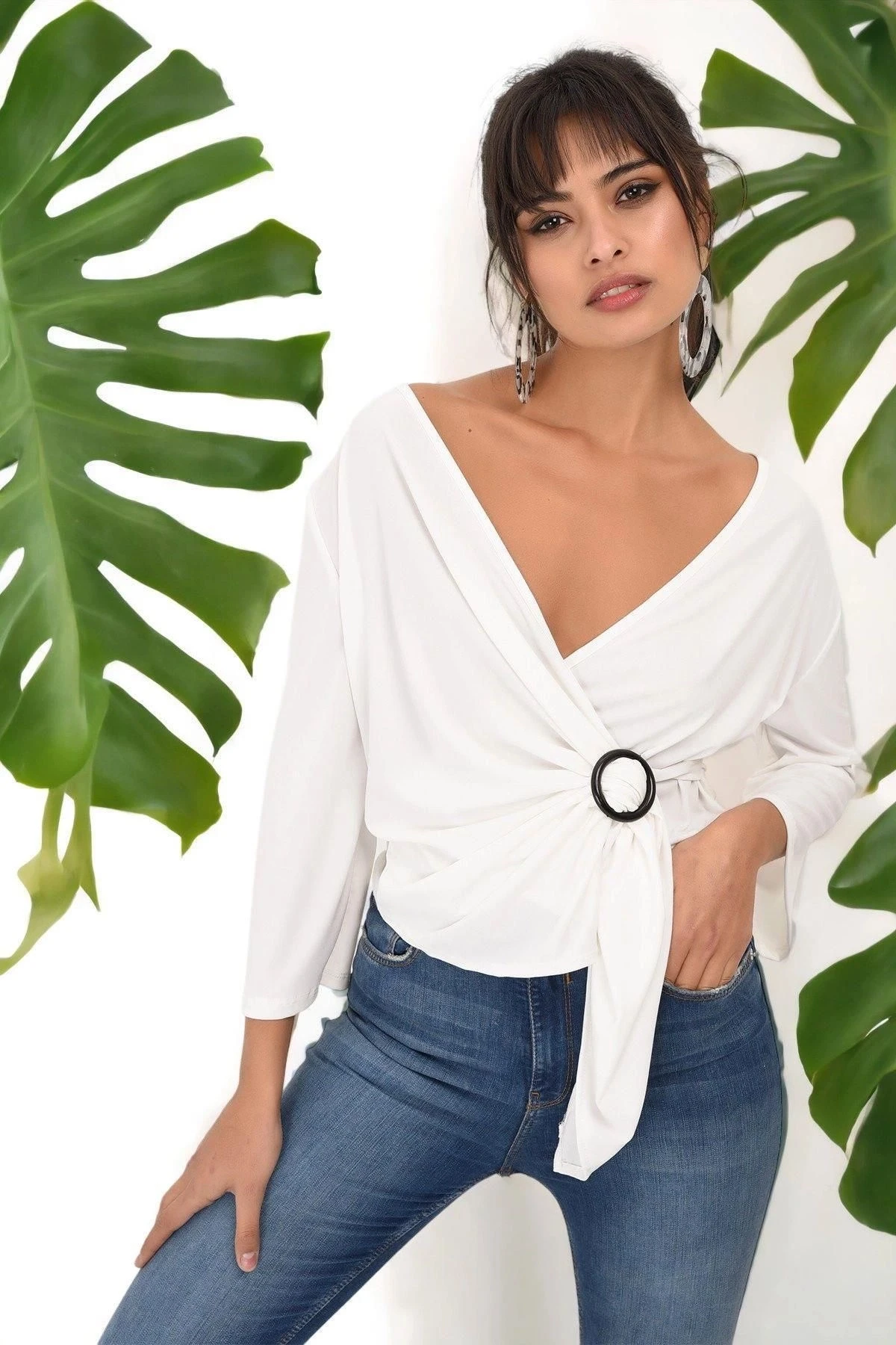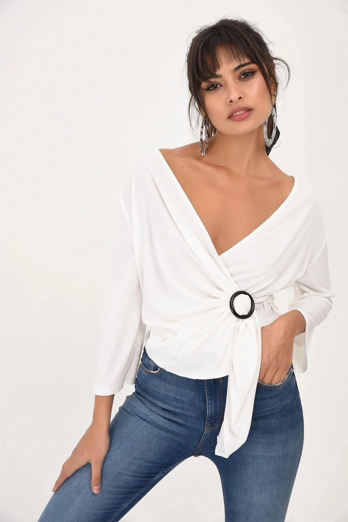 Kadın Beyaz Kruvaze Yaka Truvakar Kol, Kemer Detaylı Regular Kesim Standart Boy Bluz