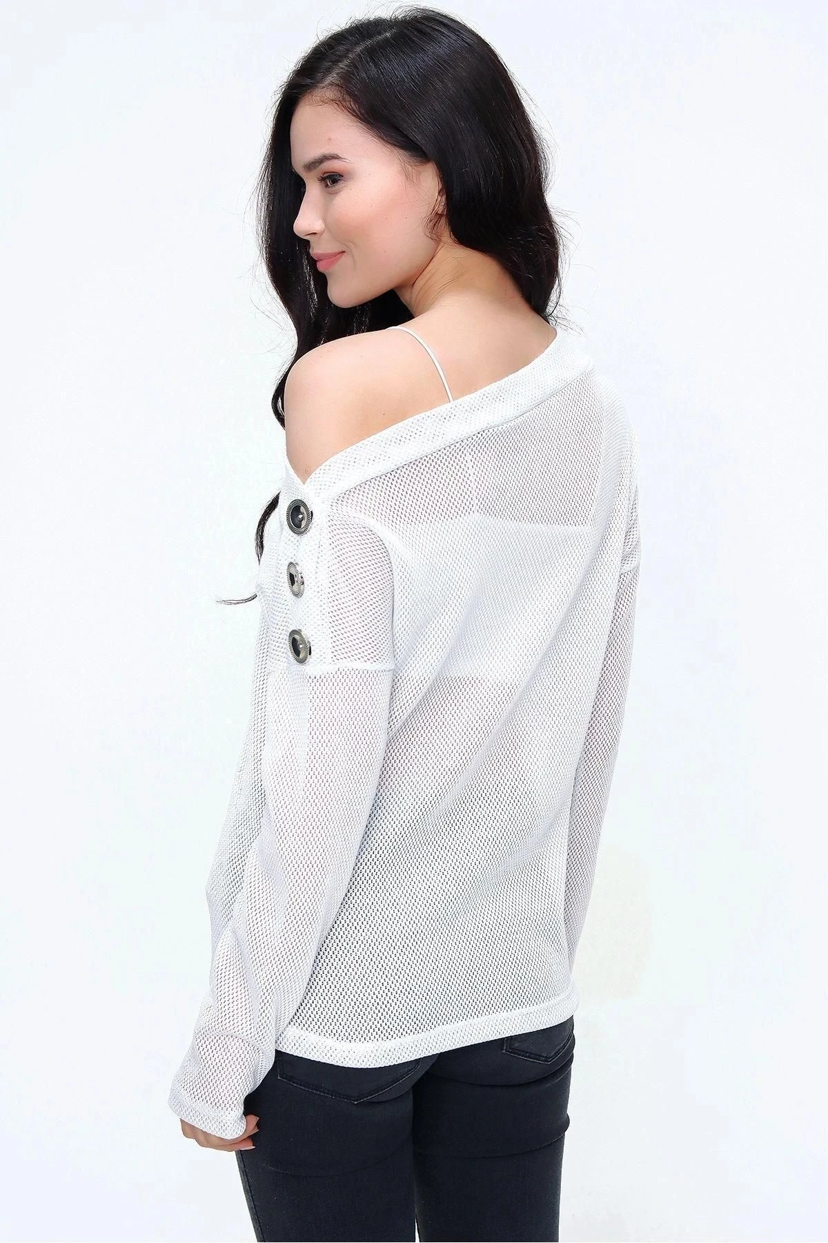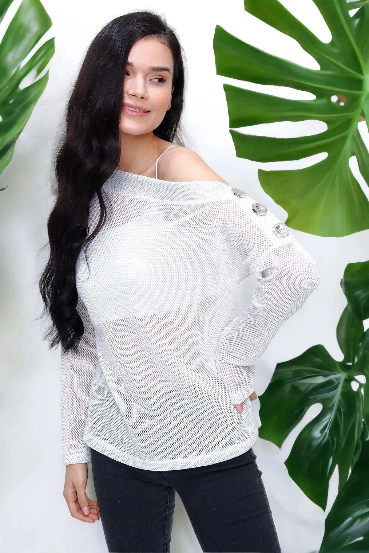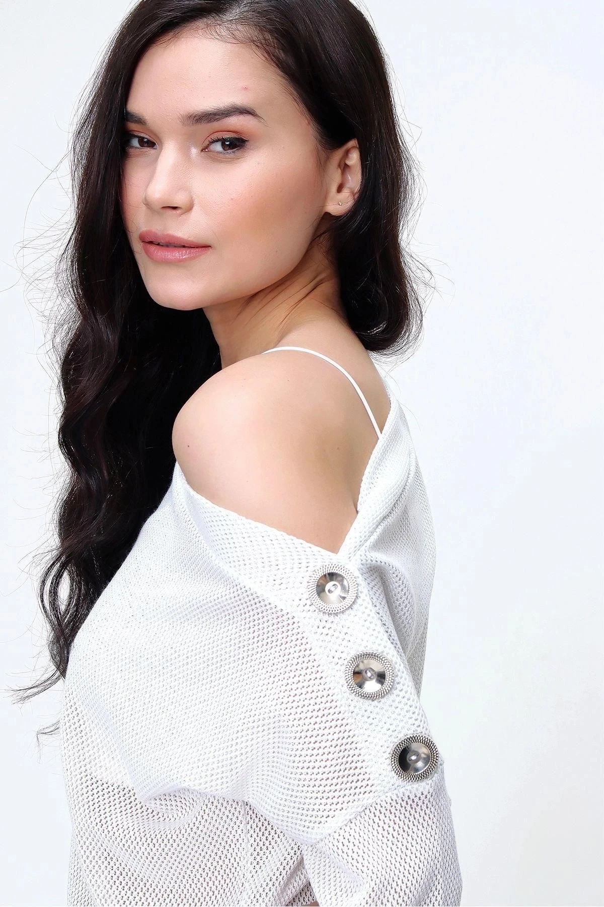 Kadın Beyaz Omzu Düğmeli Dokulu Simli İnce Örme Bluz Uzun Kol Tek Omuz Düğmeli Oversize