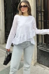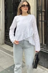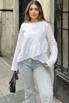 Kadın Beyaz Önü Fırfırlı, Yuvarlak Yaka, Arkası Uzun Pamuklu Salaş Bluz