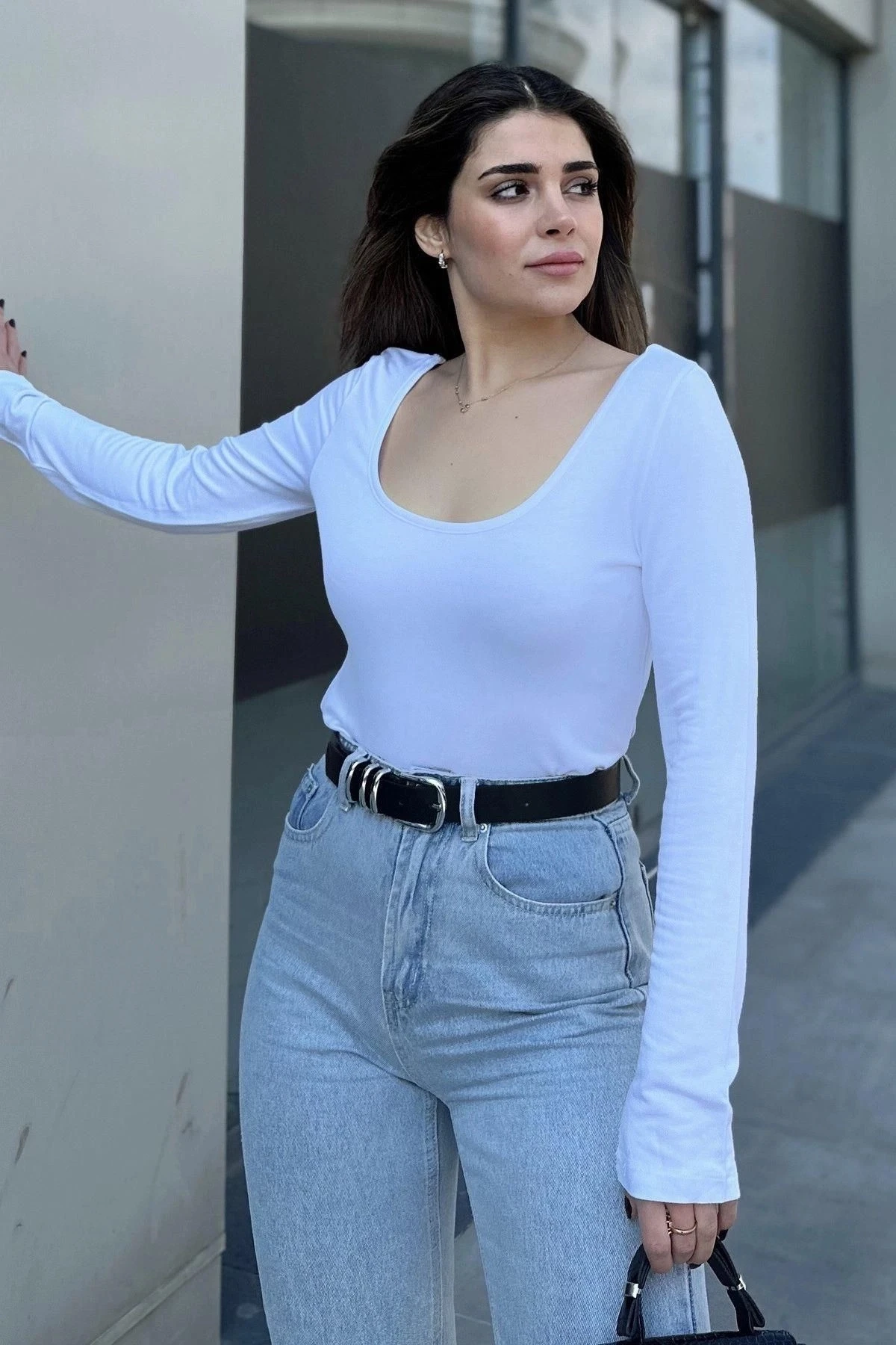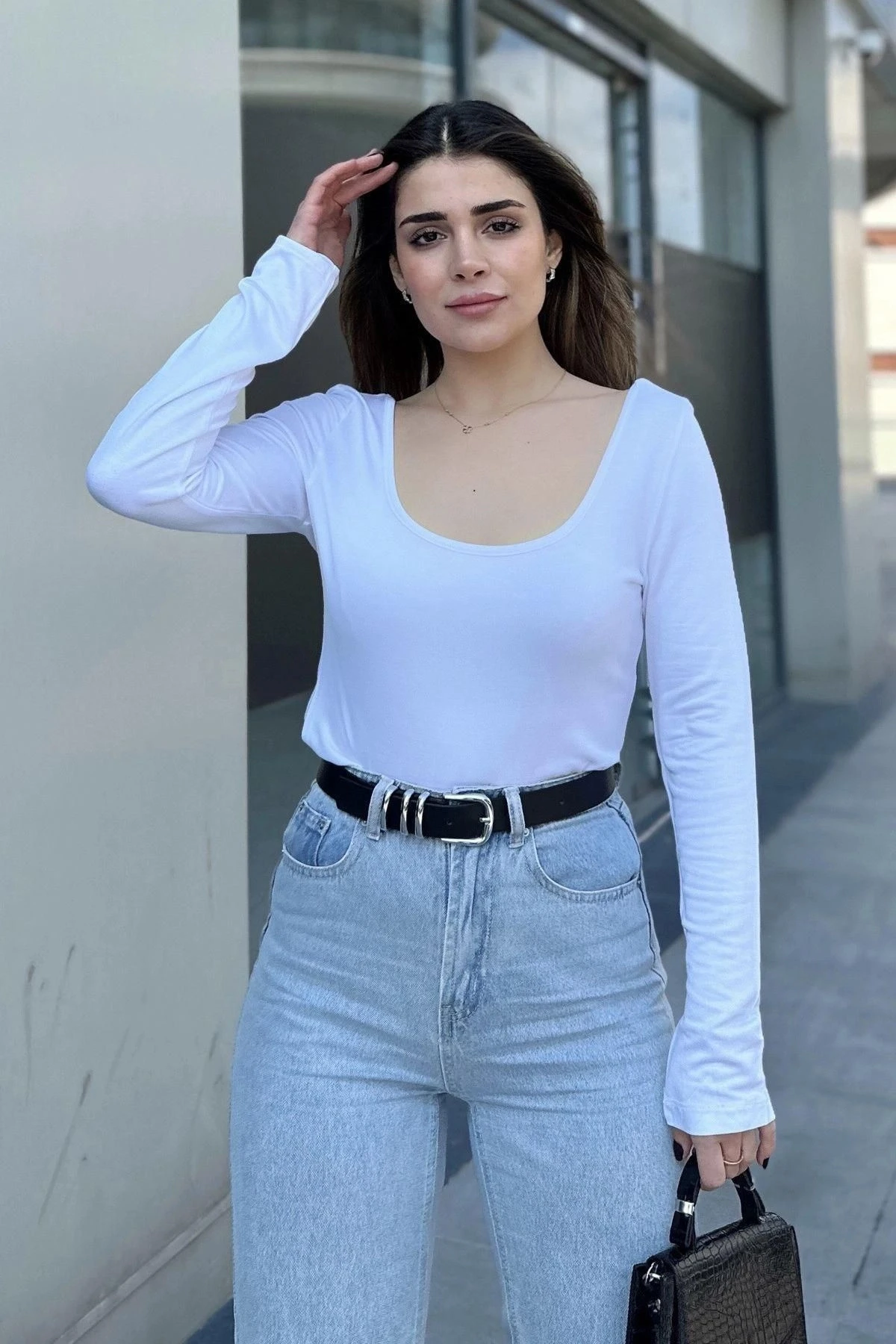 Kadın Beyaz Önü Ve Arkası Derin Dekolte Yaka, Regular Kesim, Terletmez, Pamuklu Penye Bluz