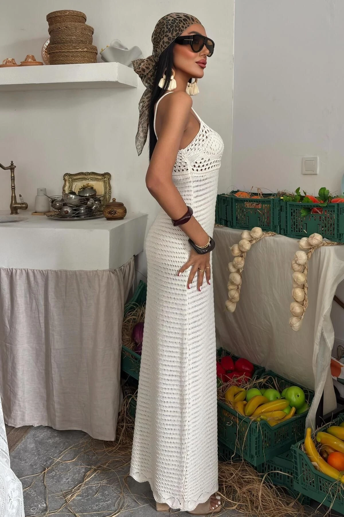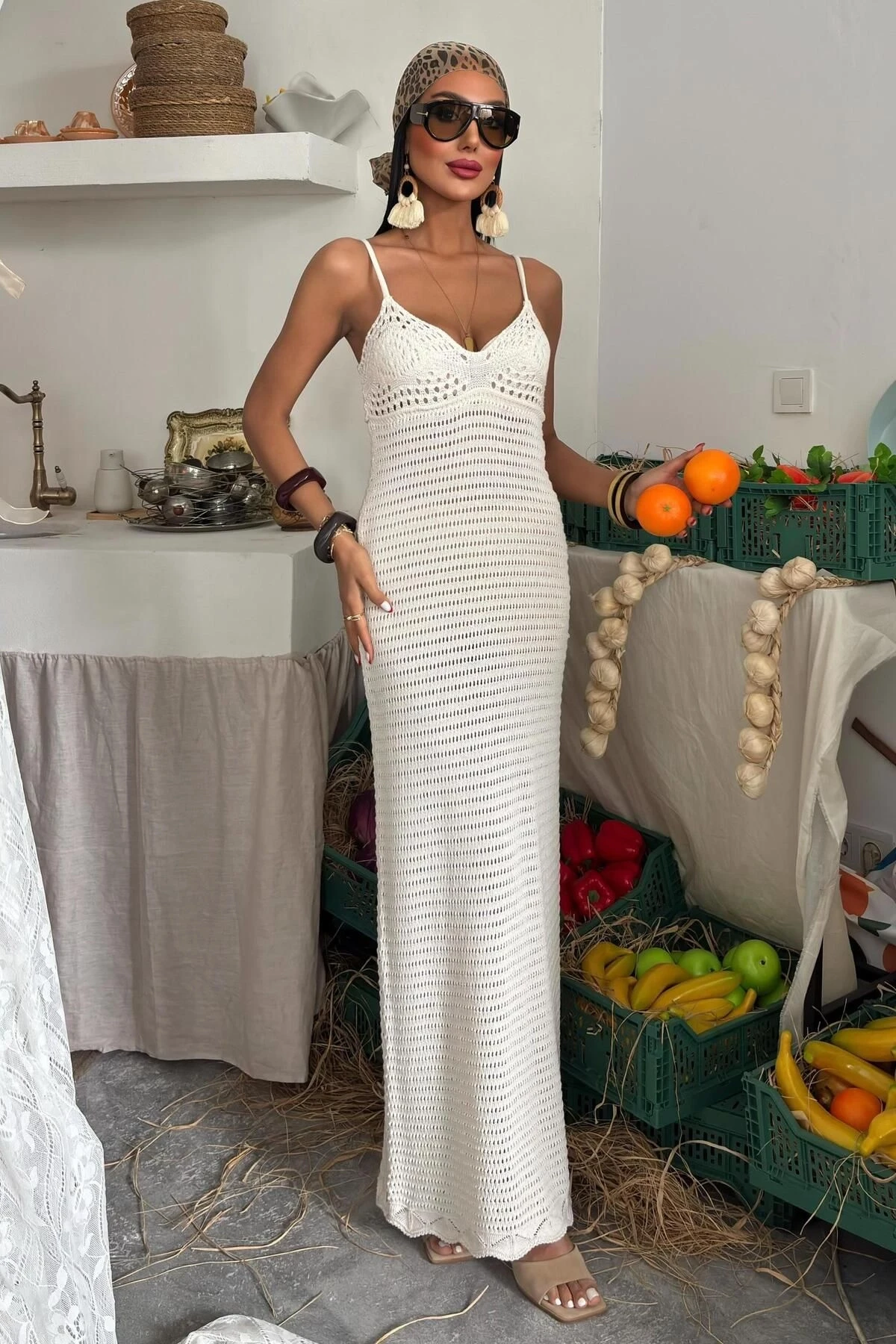 Kadın Beyaz Pamuklu Askılı Örme Uzun Elbise