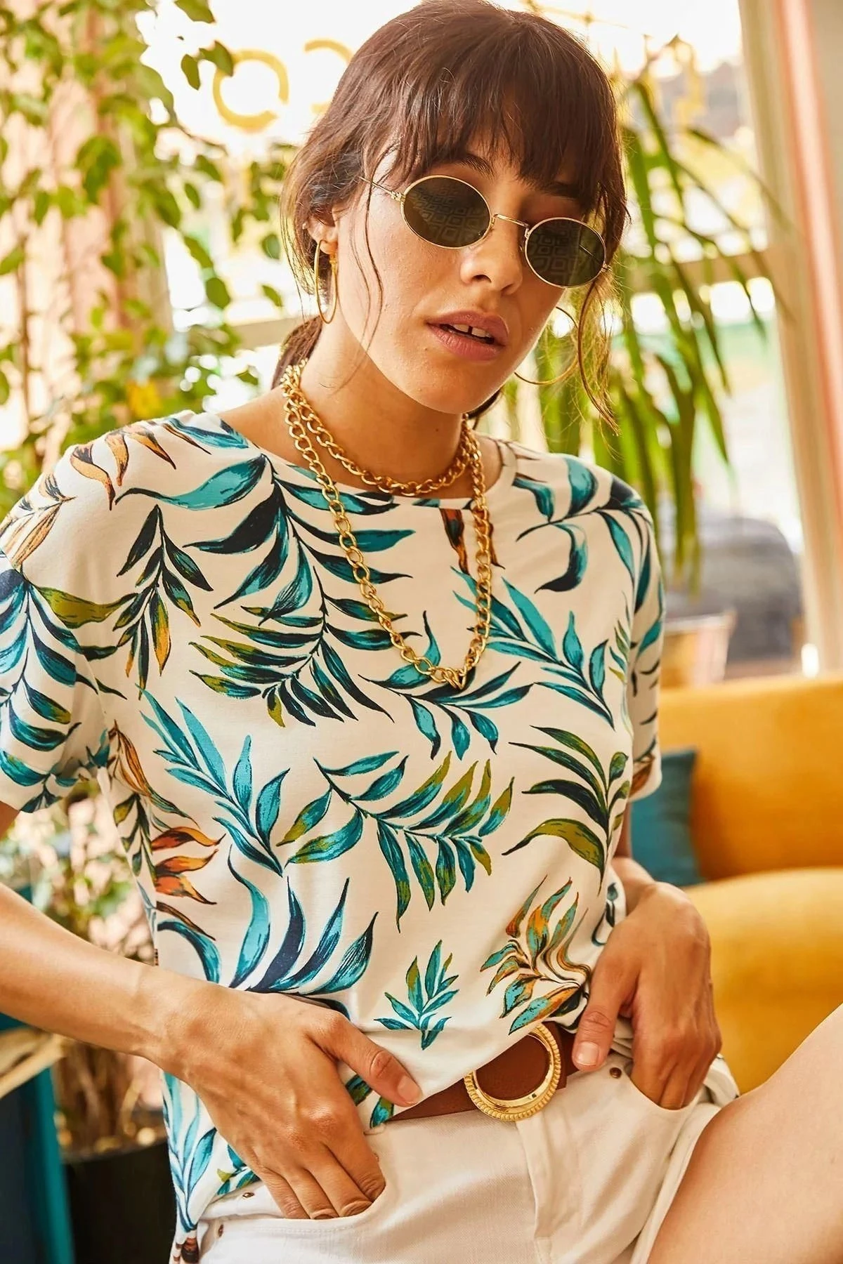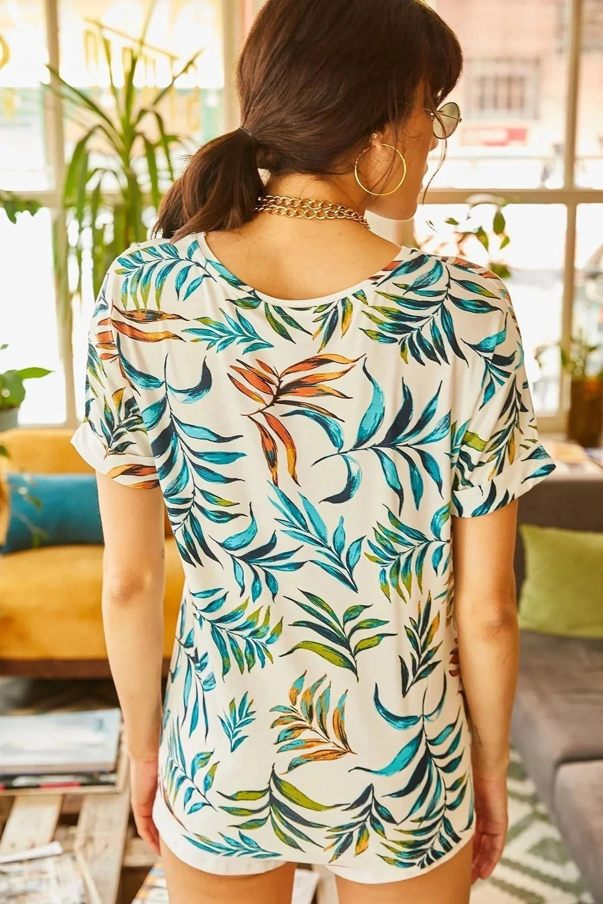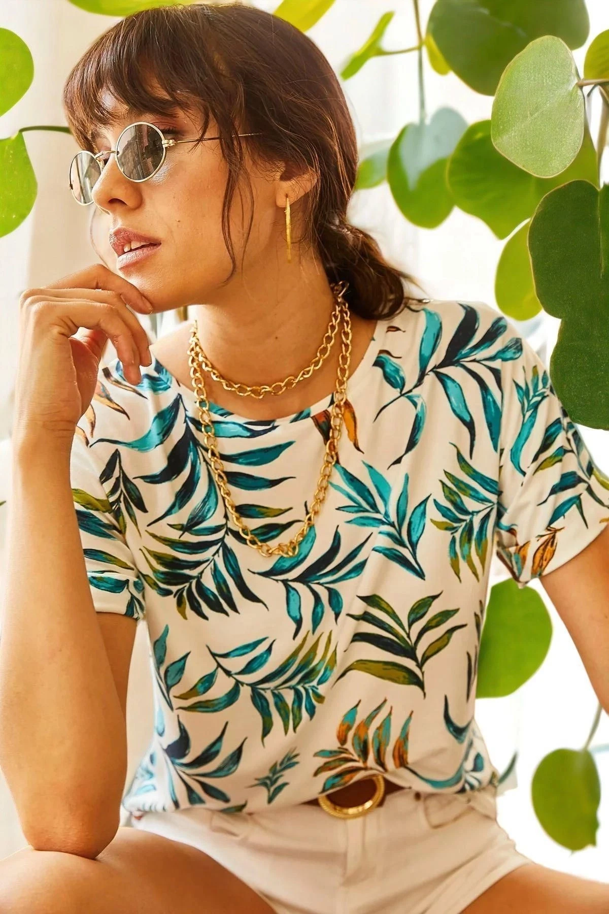Kadın Beyaz Şal Desenli Kısa Kol Yuvarlak Yaka Regular Kesim Standart Boy Bluz