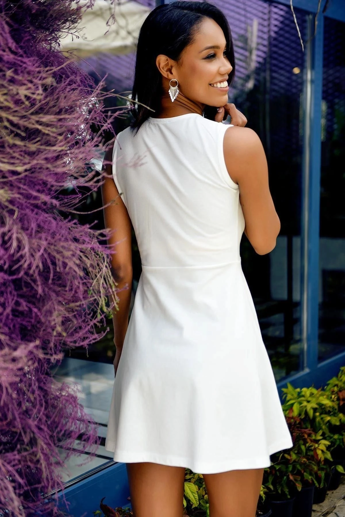 Kadın Beyaz Şık Kruvaze Yaka Sıfır Kol Detaylı Mini Kısa Elbise
